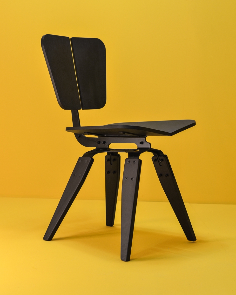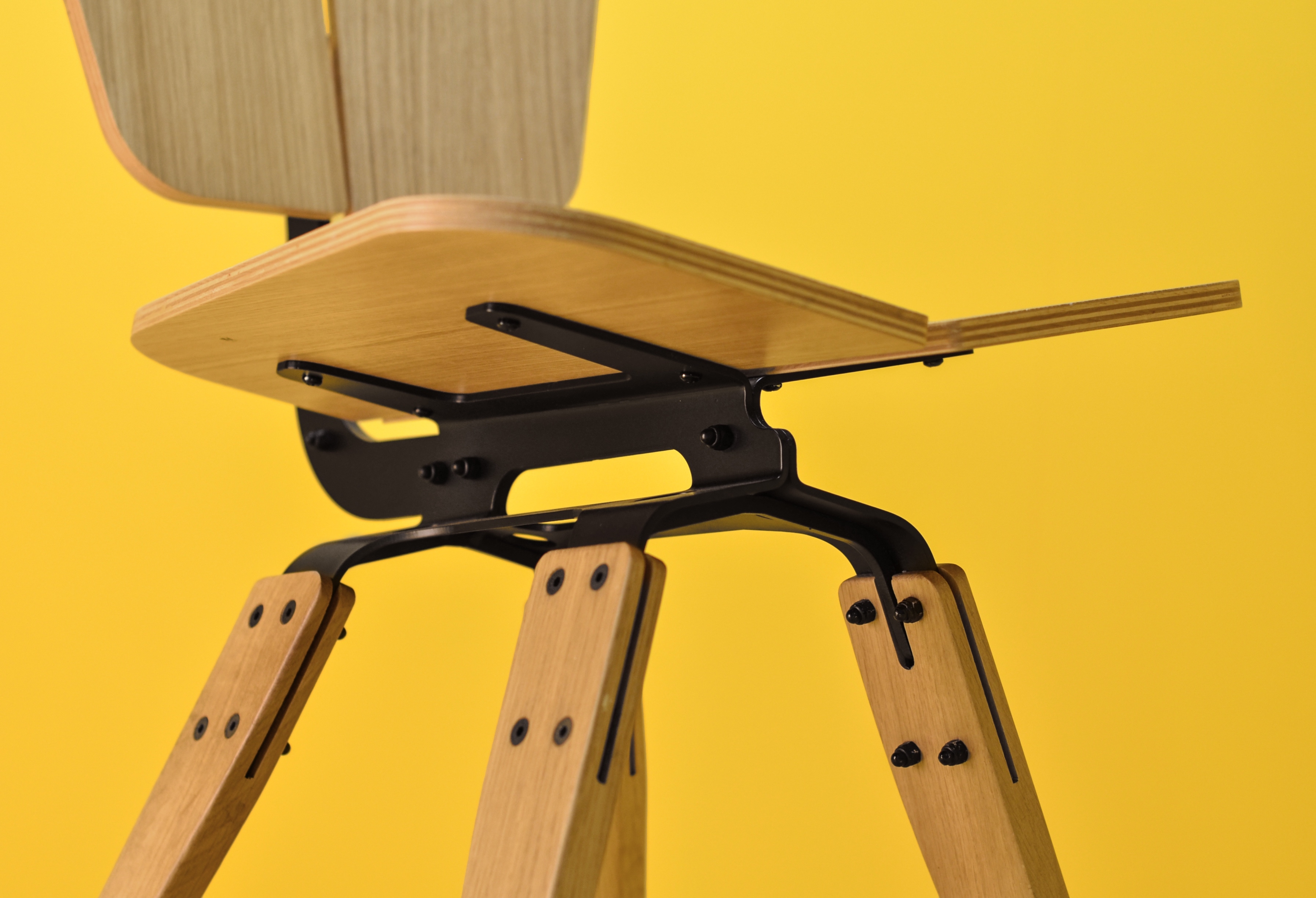 DCP comes with a matching table whose insect-shaped support is an answer to the issue of a central stand without a base that impedes the feet. Materials: Solid local ash legs, metal structure, ash plywood