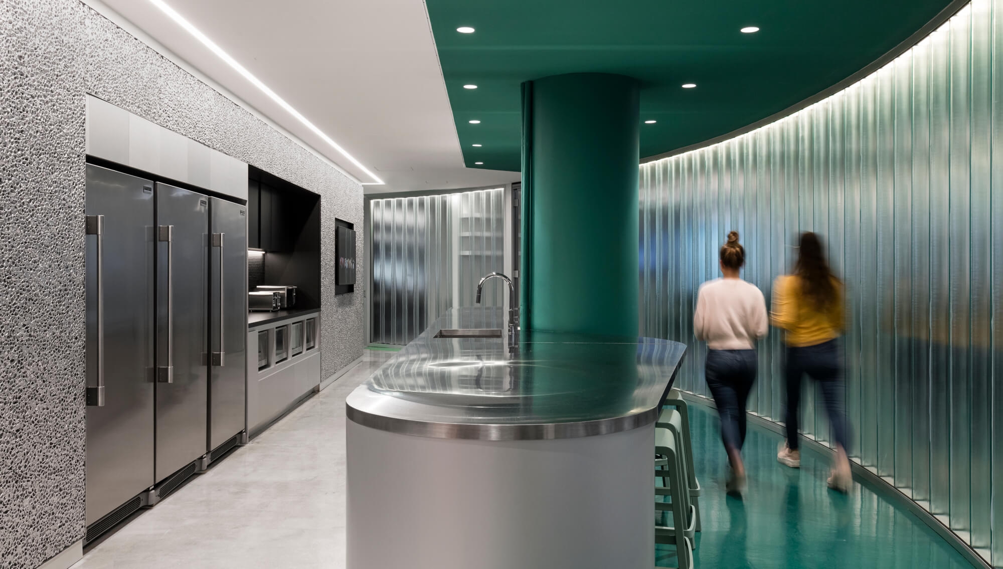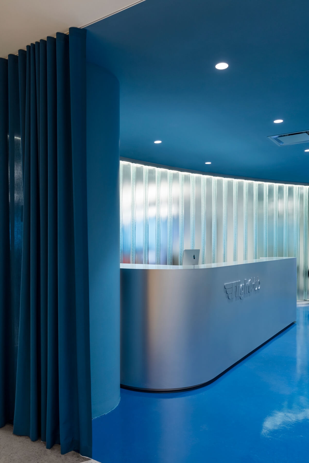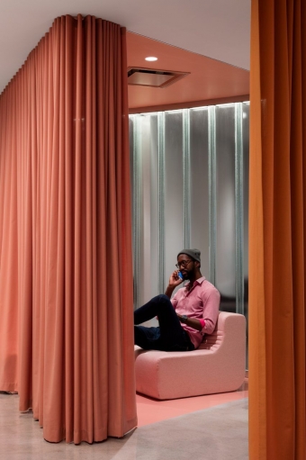 To remedy the awkward shape, the firm came up with a simple yet effective strategy: Transform the centre of the space into a circular common area, with the outer ring of workspaces (including open desking, private offices, conference spaces and breakout rooms) orbiting it. “The layout,” says architect and studio partner Joan Renaud, “provides a functional balance of flow and concentration that is conducive to the FlightHub culture.”