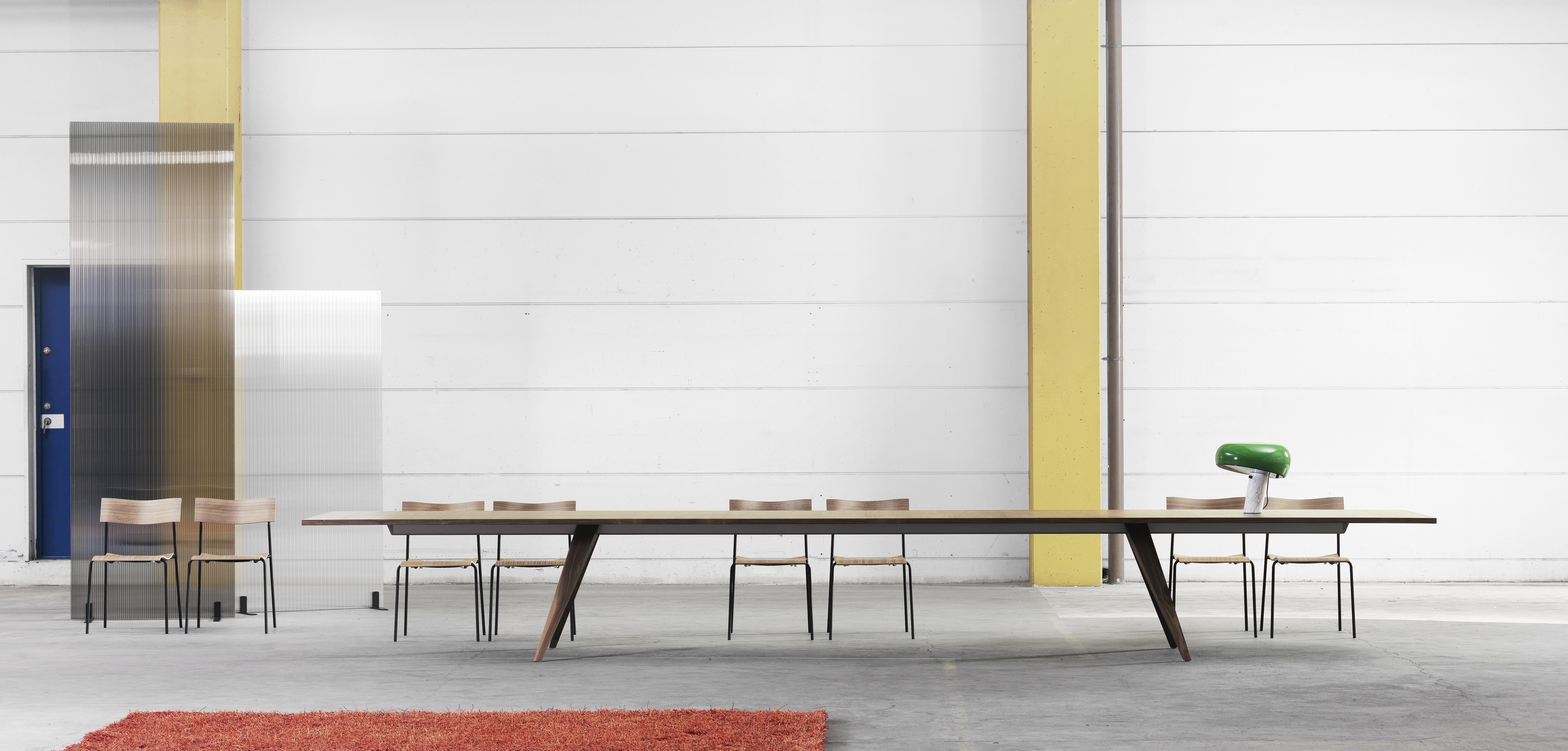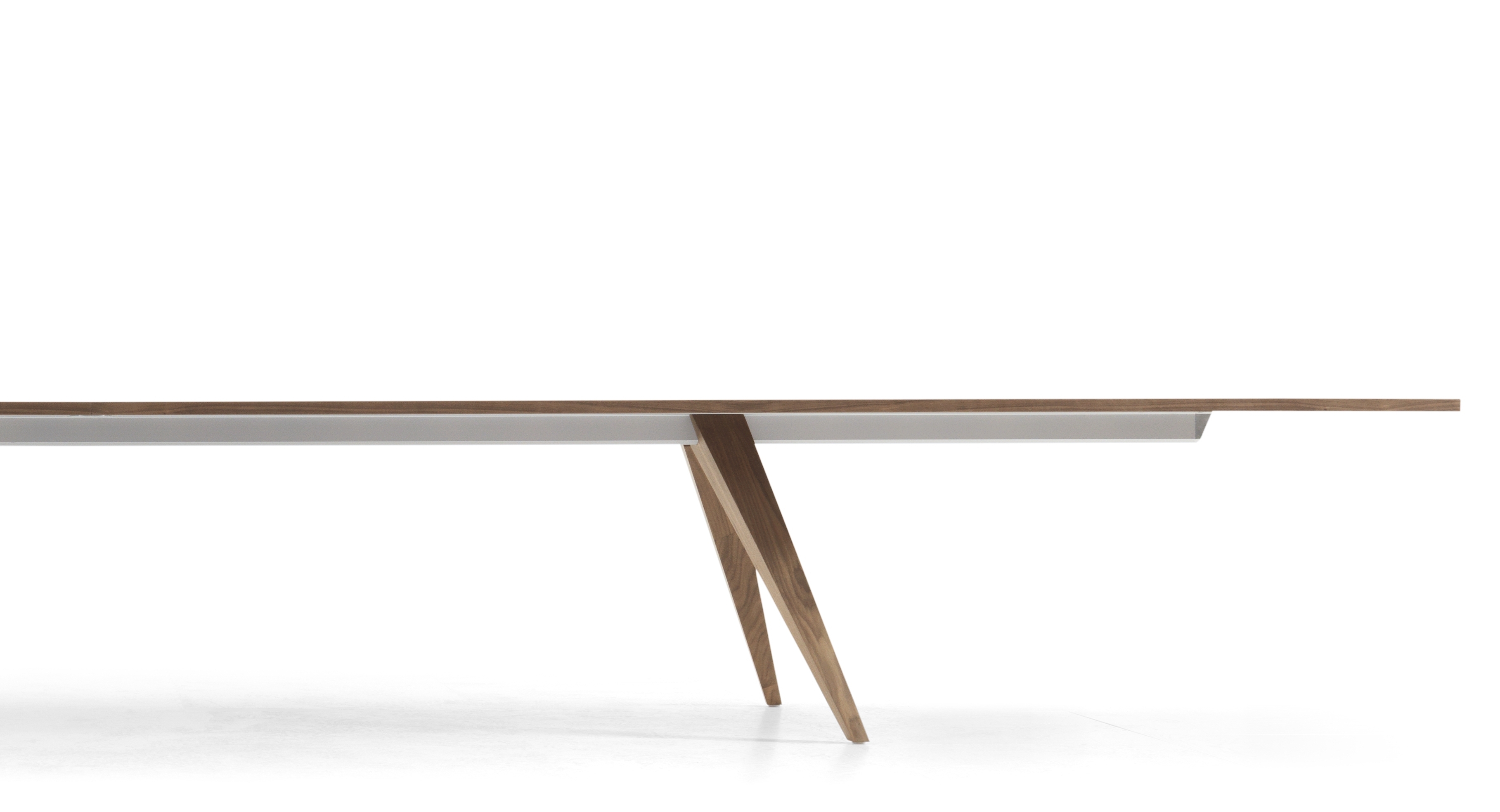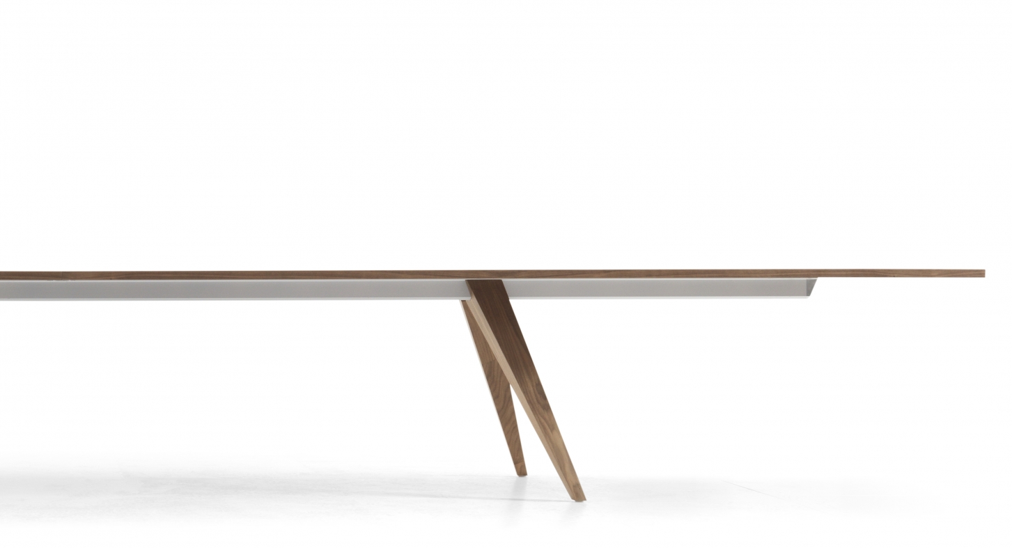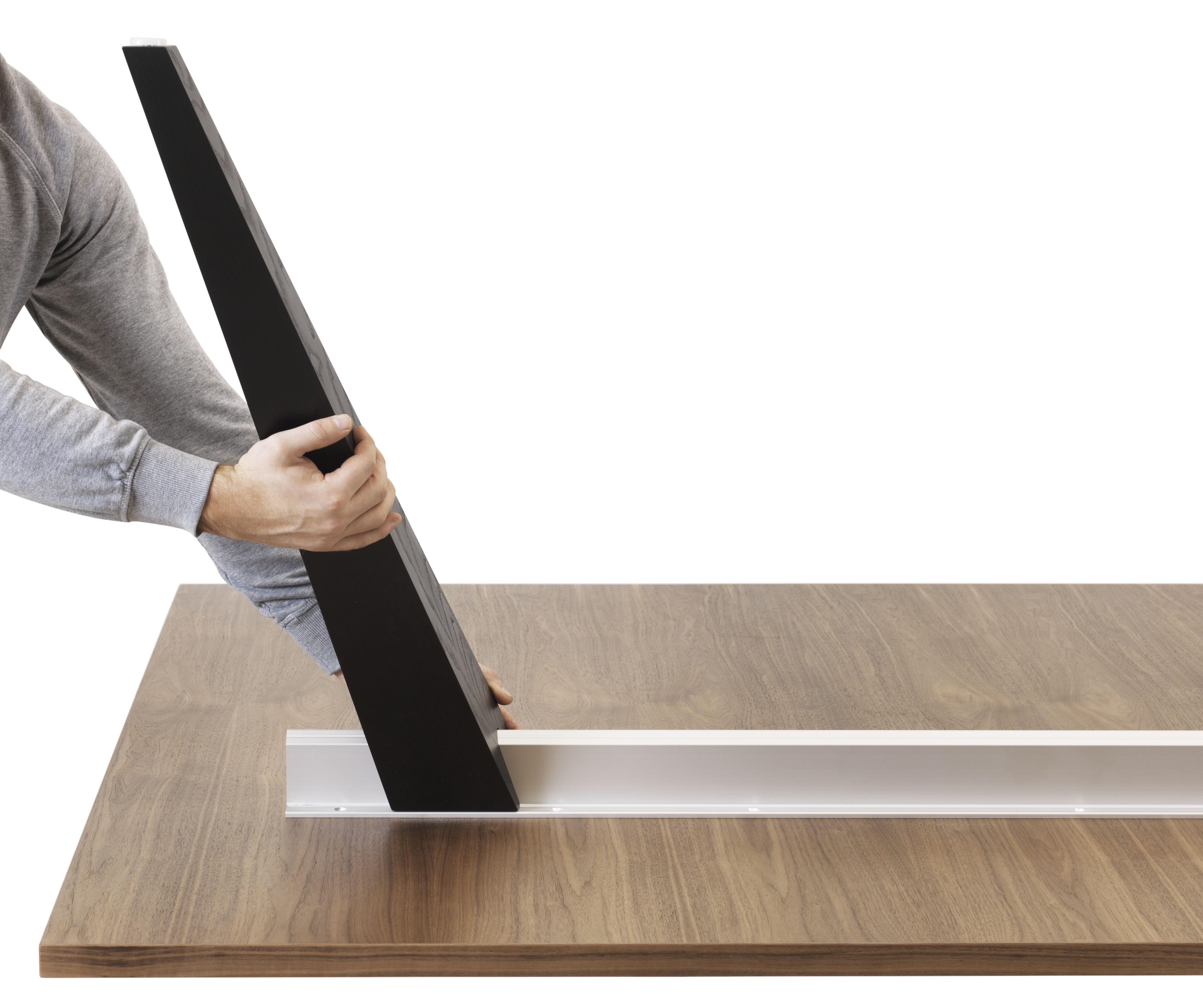 PONTO table is an innovative combination of aluminium - the supporting beam - and solid wood – the legs. In the upper-end of the legs, a “negative print” of the extruded beam-profile is milled out. This allows the leg to be slided onto the beam and left where wanted. When the table stands, gravity locks the legs and stabilizes the whole construction.
