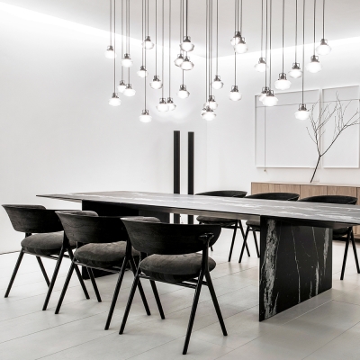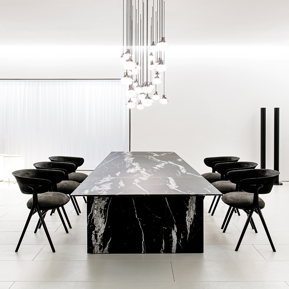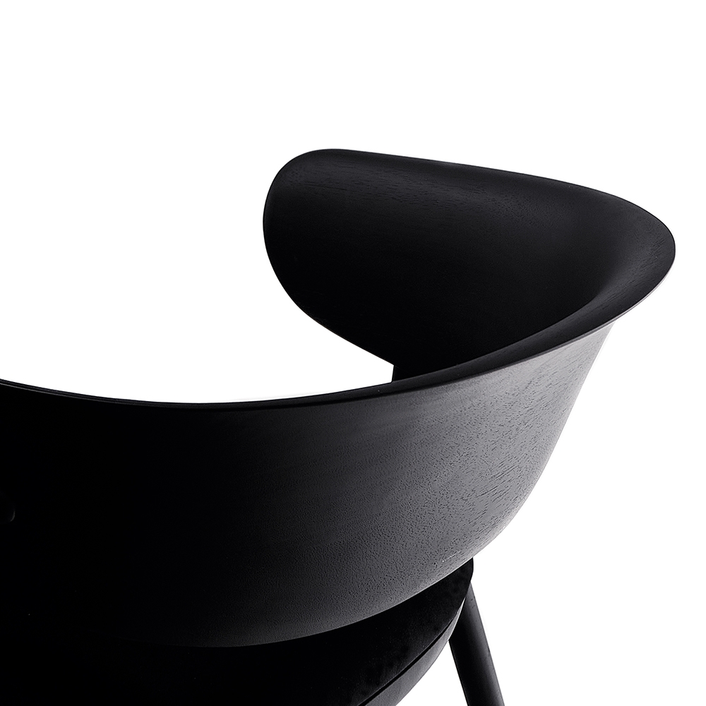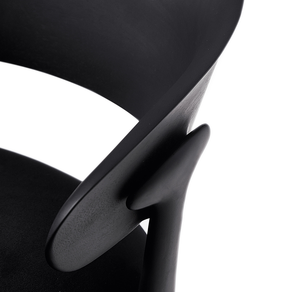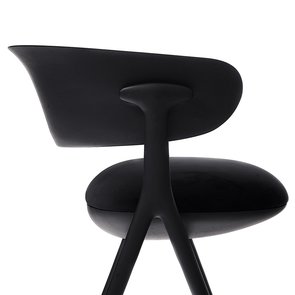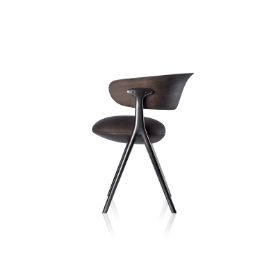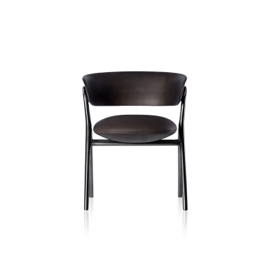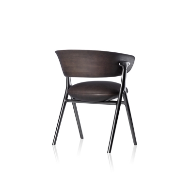 A chair with sophisticated and elegant geometry, created out of an unusual set of supports made of molten metal in a harmonious composition of materials. The upholstered seat appears to float while the backrest supports the back and arms, bringing comfort to those who sit on it.