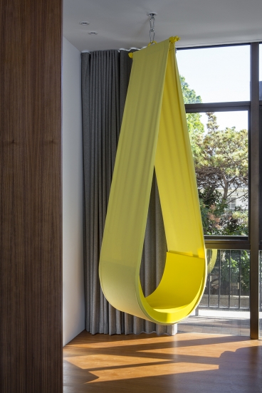 The distinct silhouette of the Dropi forms a quiet, if not playful retreat, where ambient noise is deflected and absorbed by a cascade of durable textile.