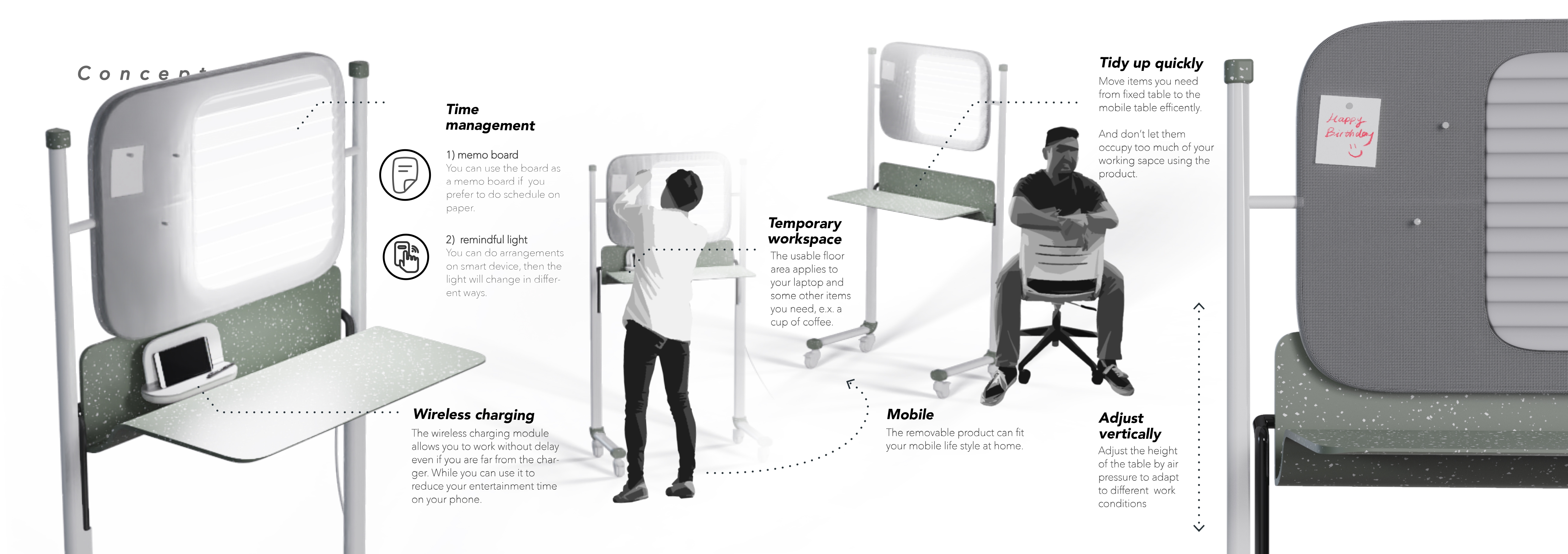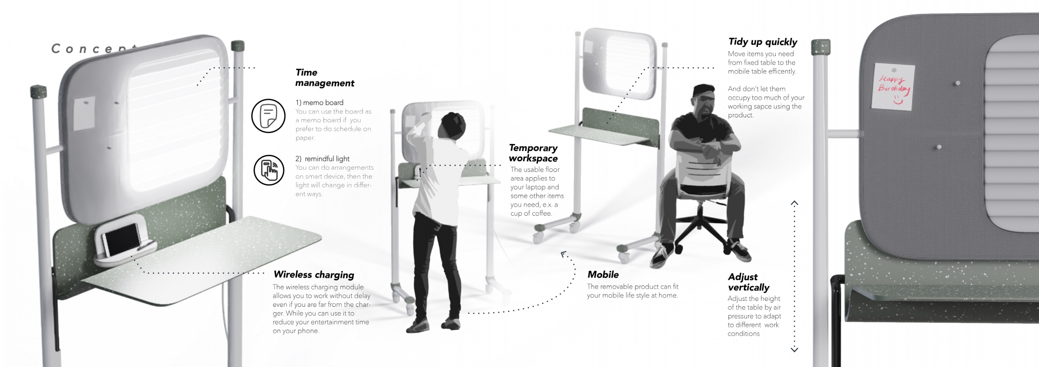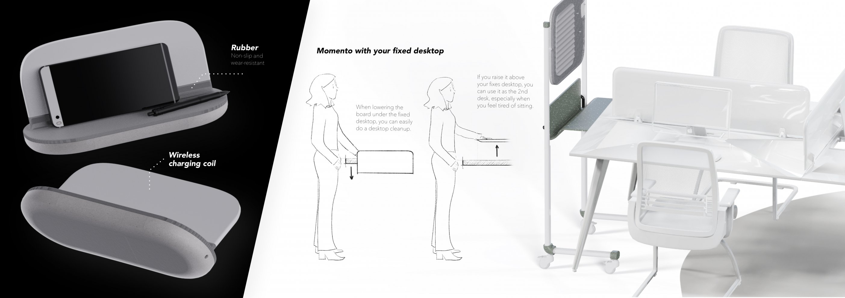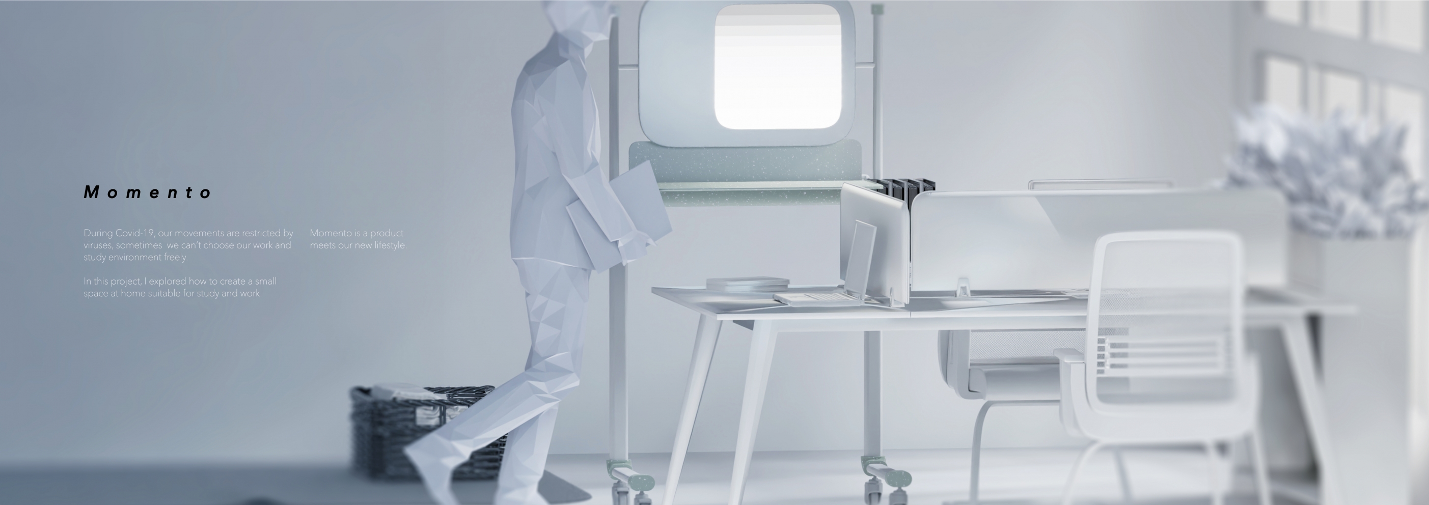 I made this project during Covid-19 pandemic, trying to create a space at home where study and work can be done more efficiently and comfortably. There are several design points of Momento, including quick cleanup table, adjustable lightning which can remind you of the time running and so on. You can use Momento at any corner of your place and use it under different working status.