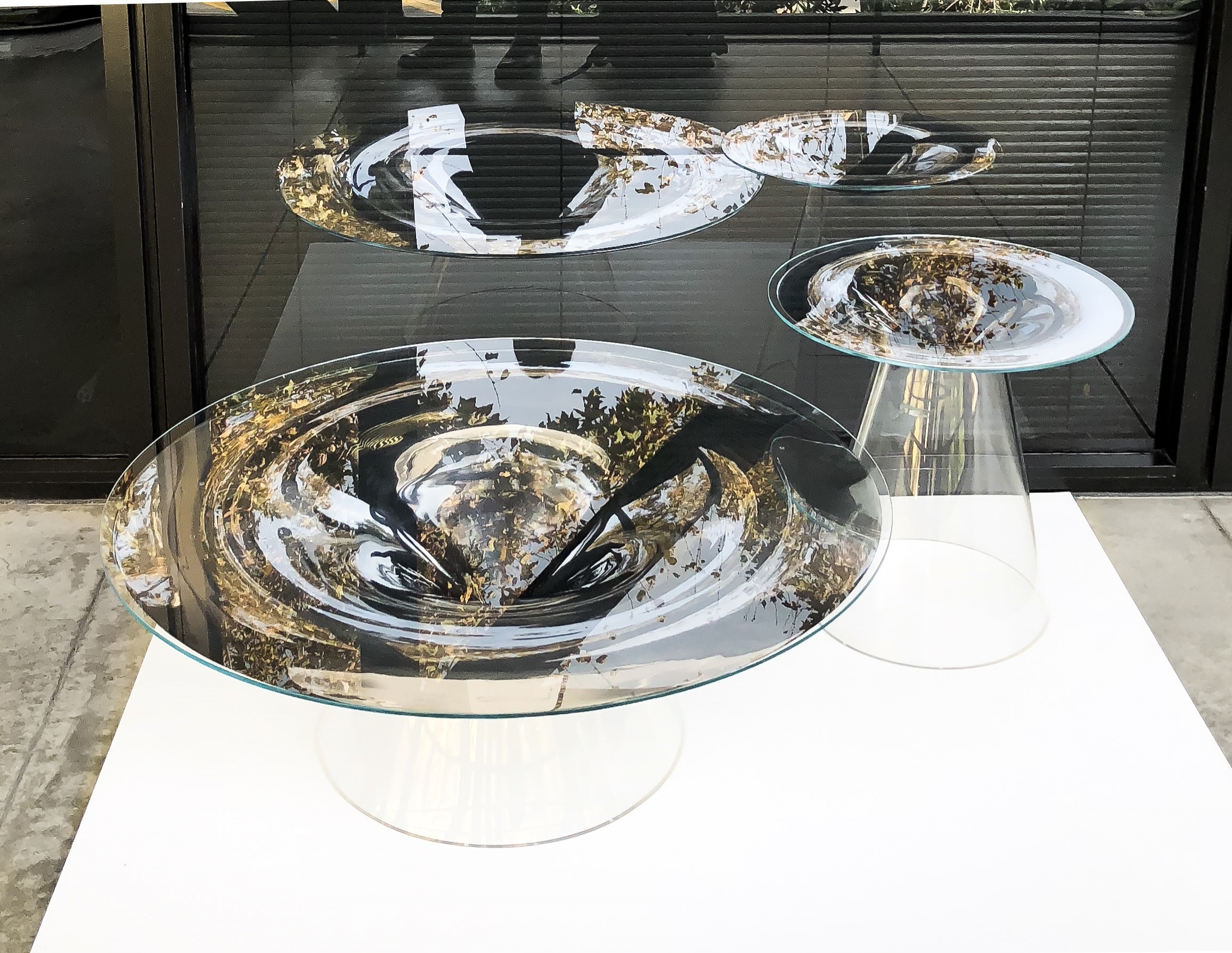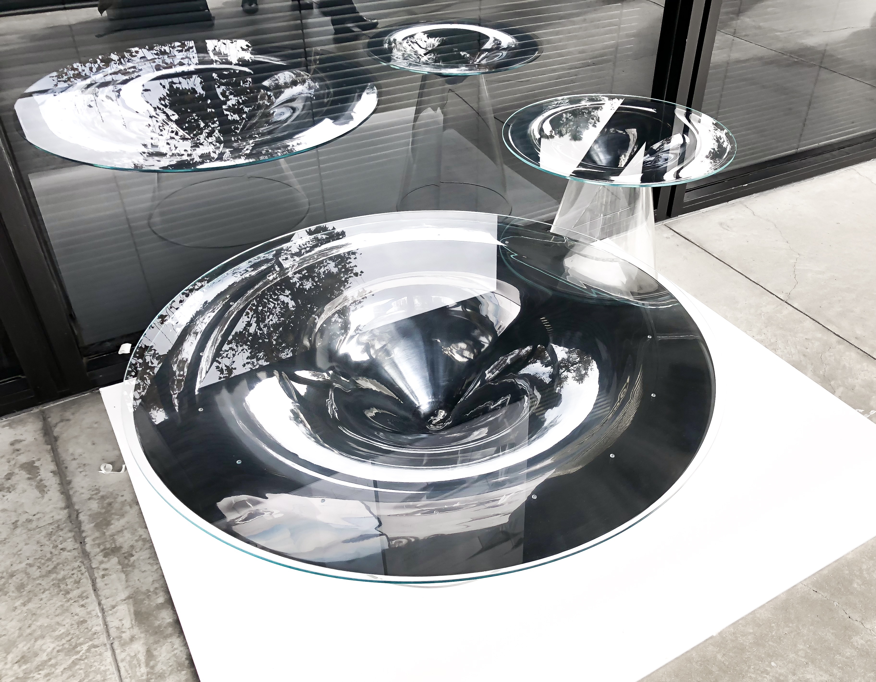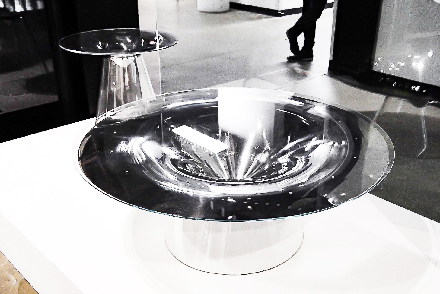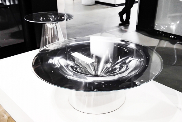 When someone looks at the table while moving around it, the reflected environment on the inner surface of the table swirls and rotates with the viewer. When the person stops moving, the swirling stops, the reflection becomes still, and clarity is found.
