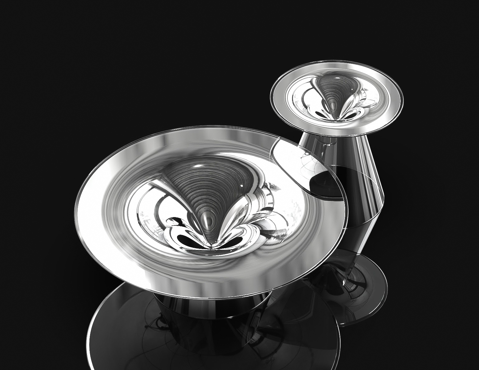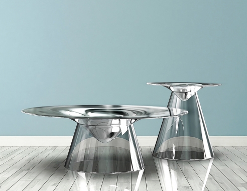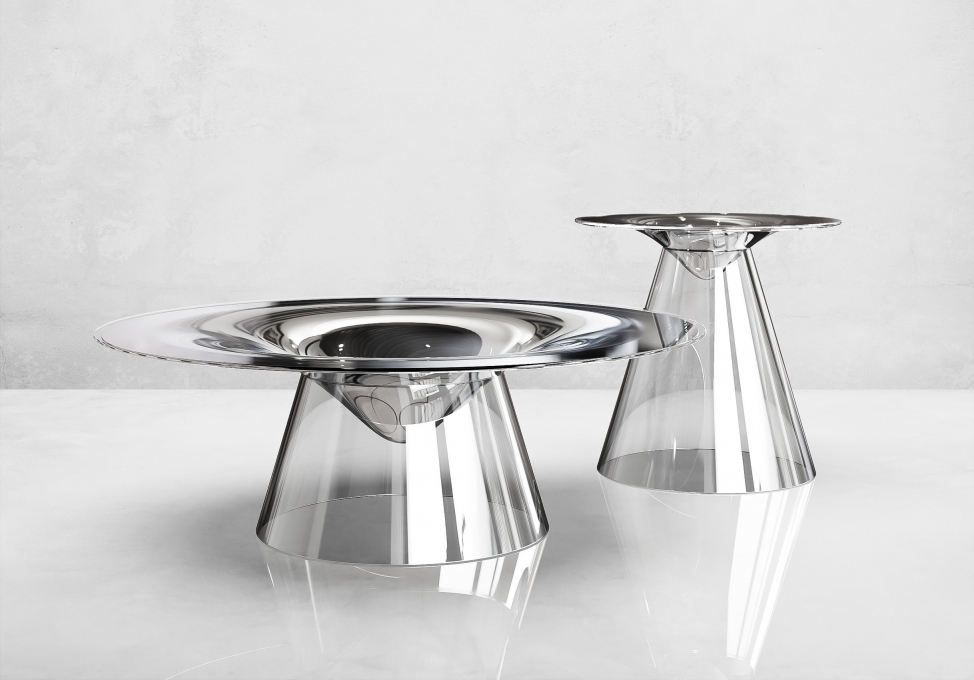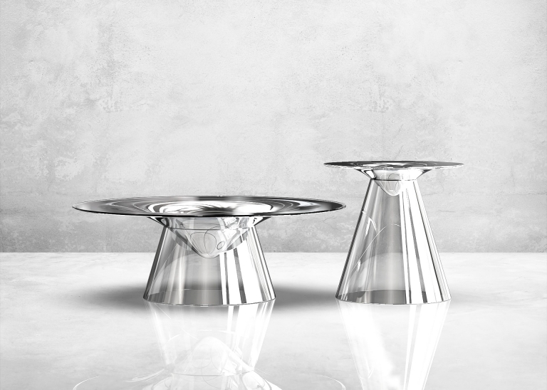 “Be Still” represents stillness in a very literal way. The main body of the table has the form of a curved vortex, which from the side, looks like it is slowly melting and dripping down. This form, together with a mirrored reflective surface, distorts the environment it is in.