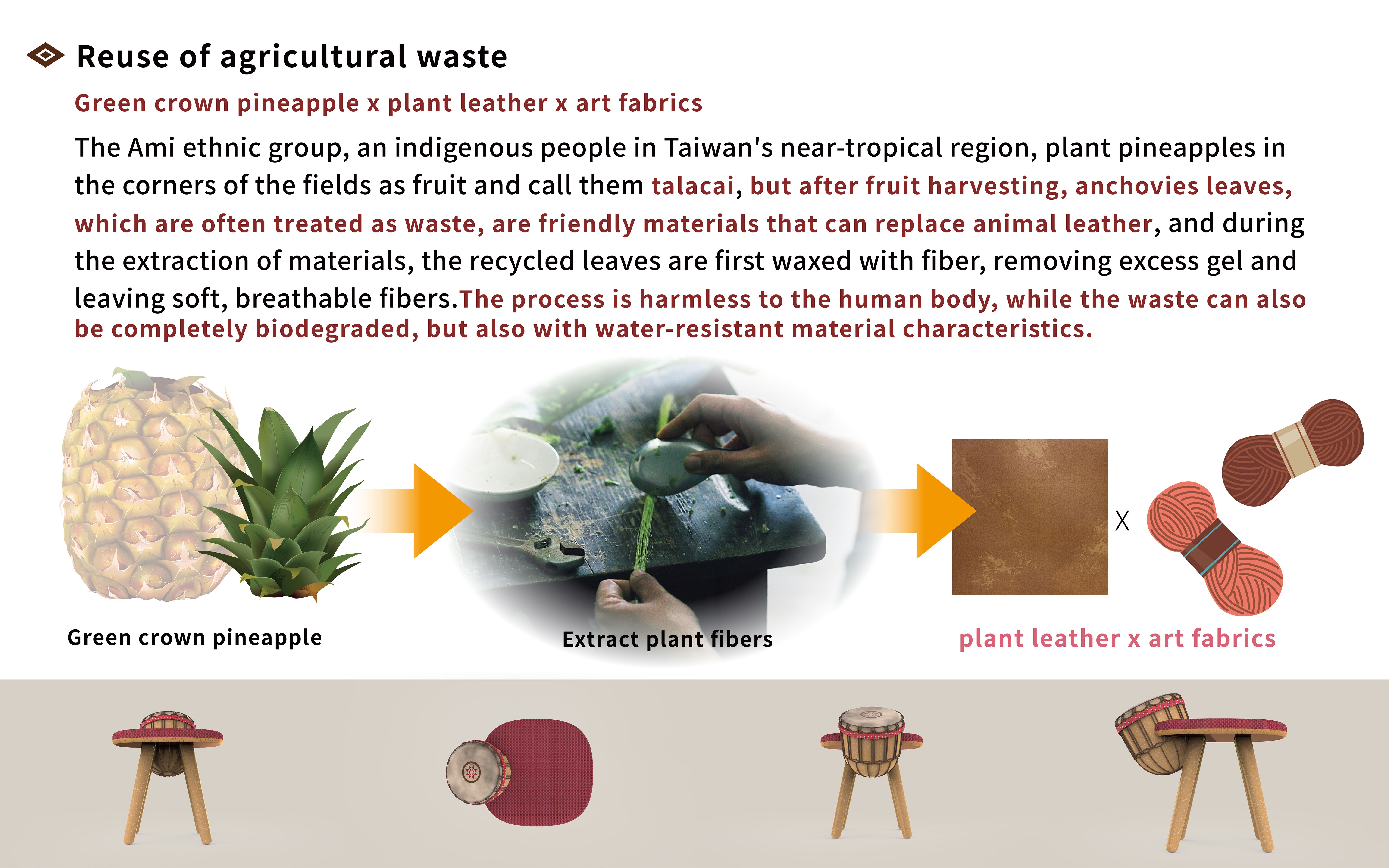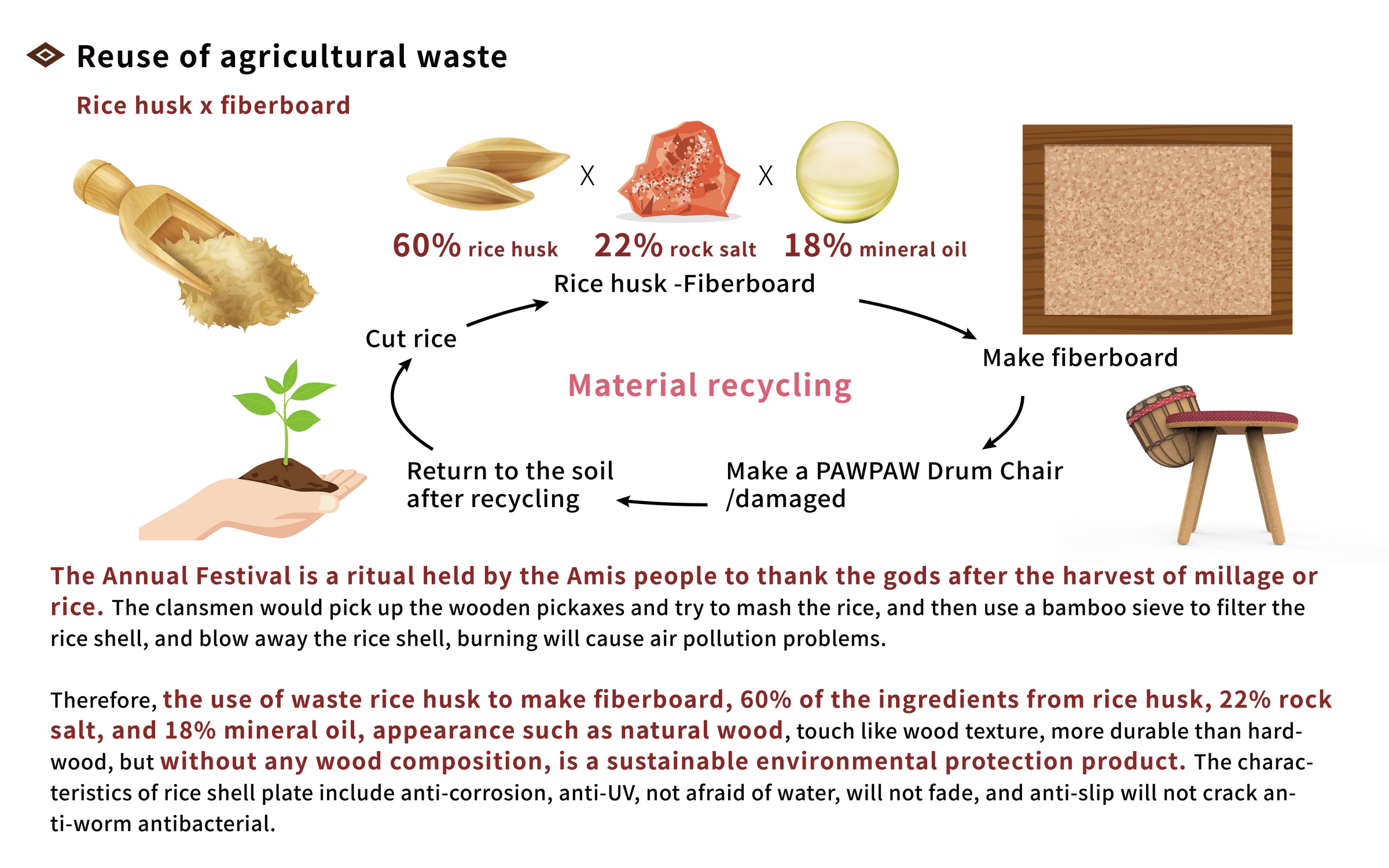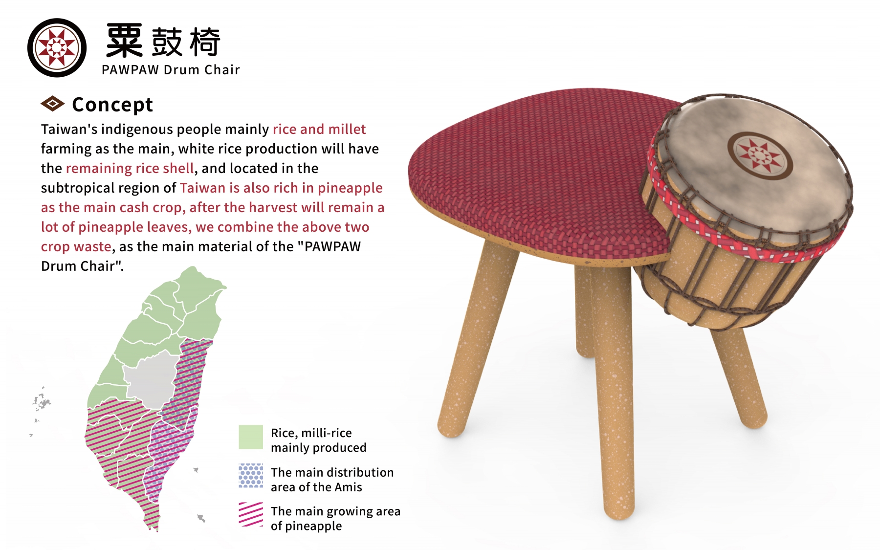 Taiwan's indigenous people mainly rice and millet farming as the main, white rice production will have the remaining rice shell, and located in the subtropical region of Taiwan is also rich in pineapple as the main cash crop, after the harvest will remain a lot of pineapple leaves, we combine the above two crop waste, as the main material of the "PAWPAW Drum Chair".