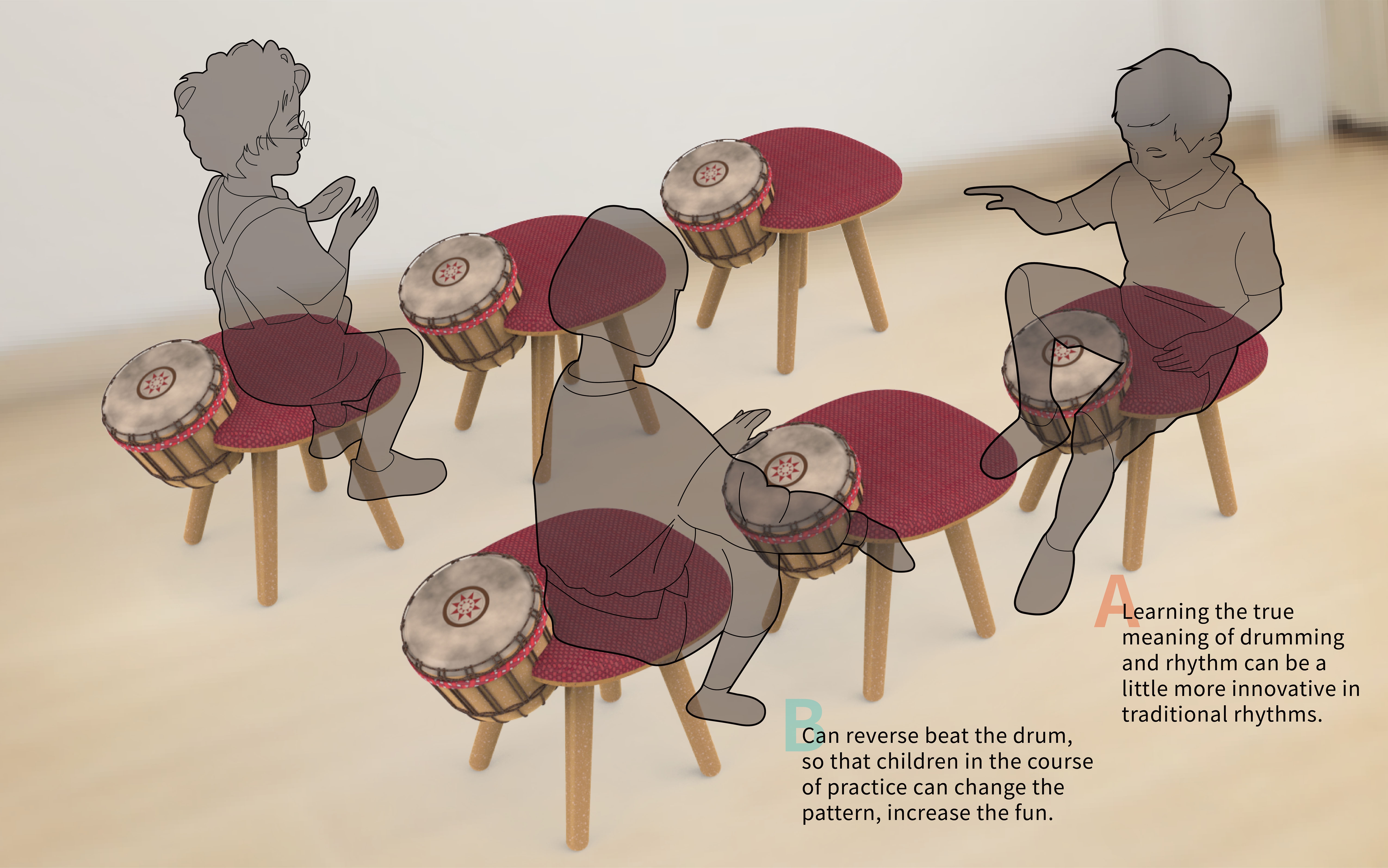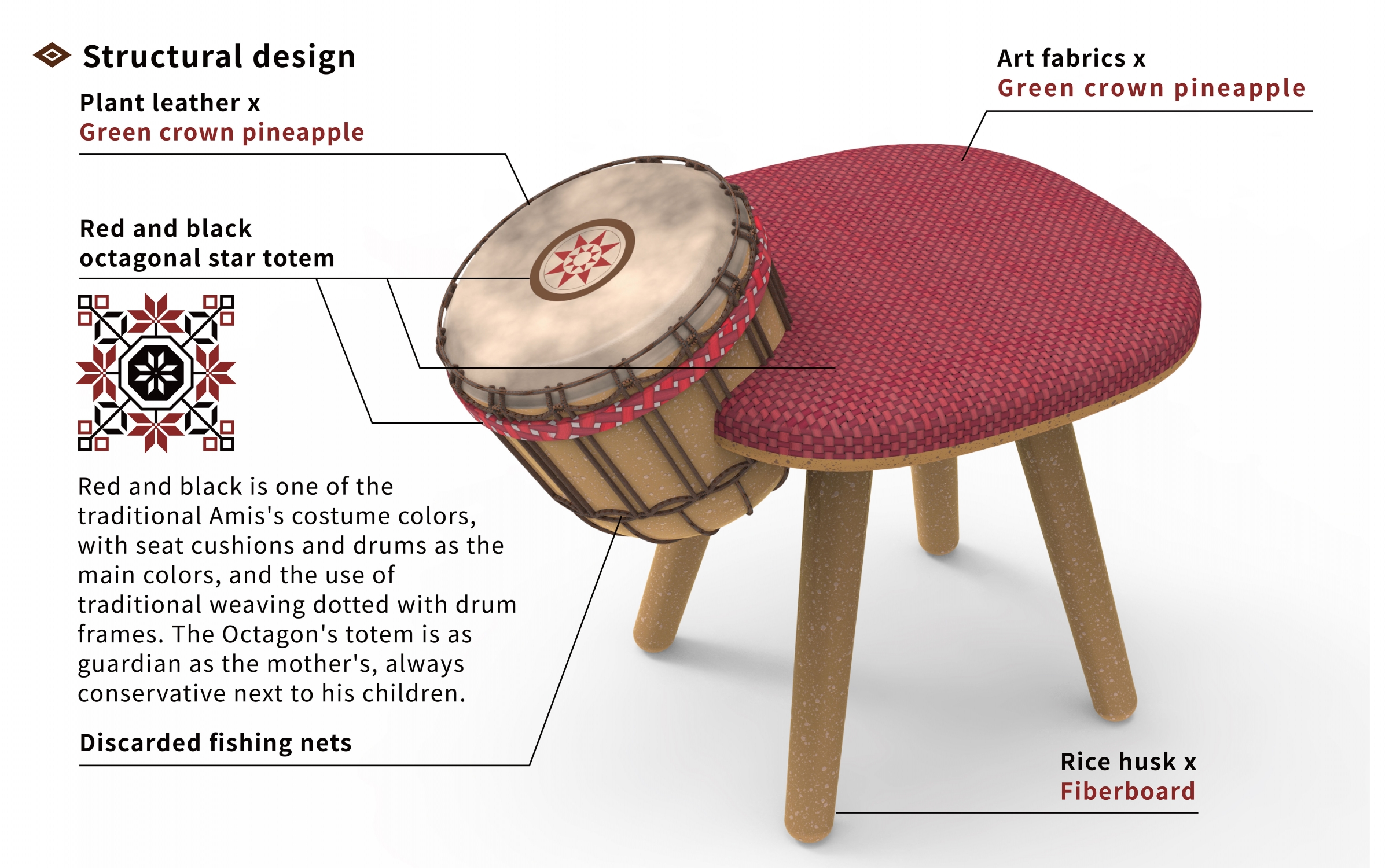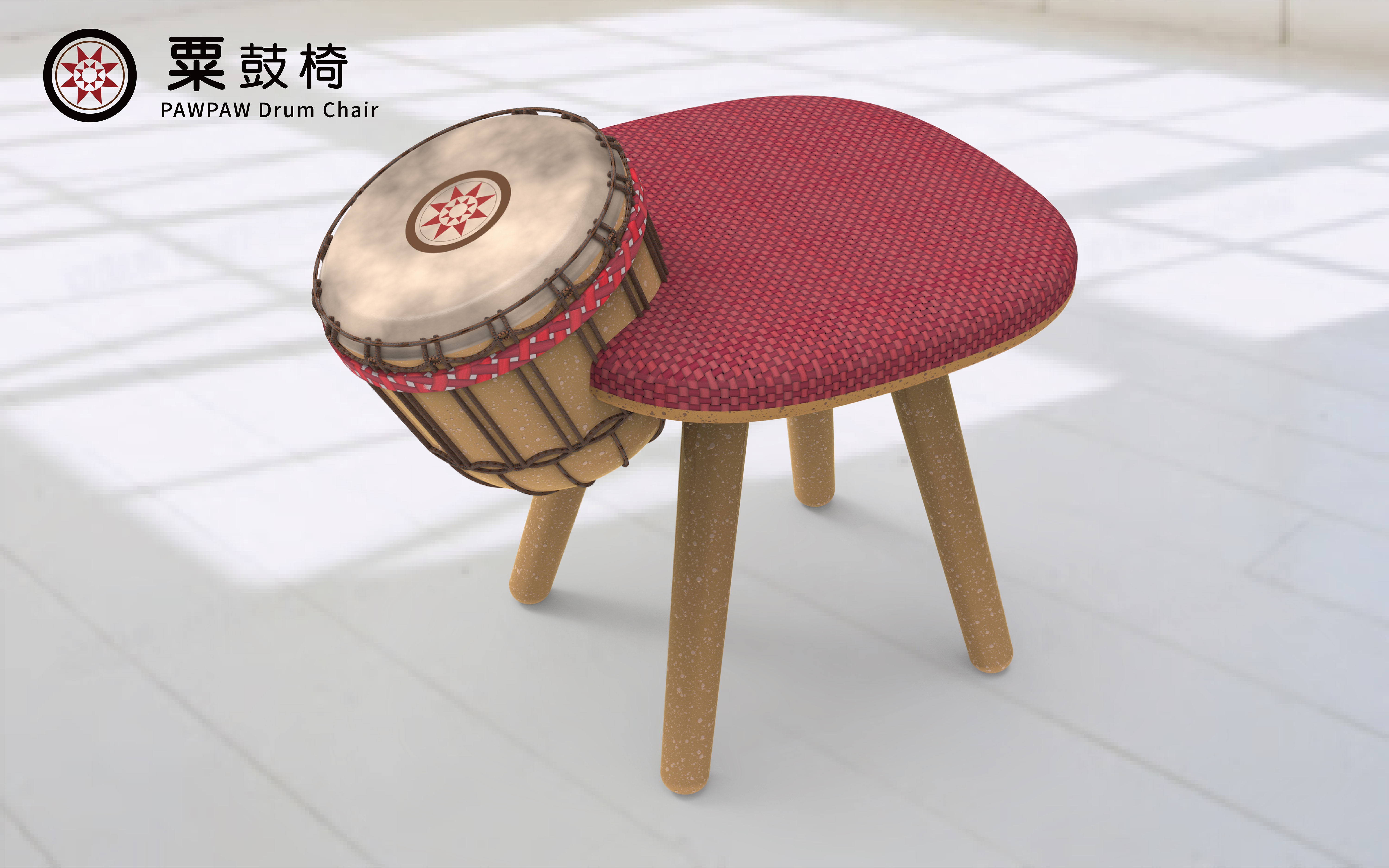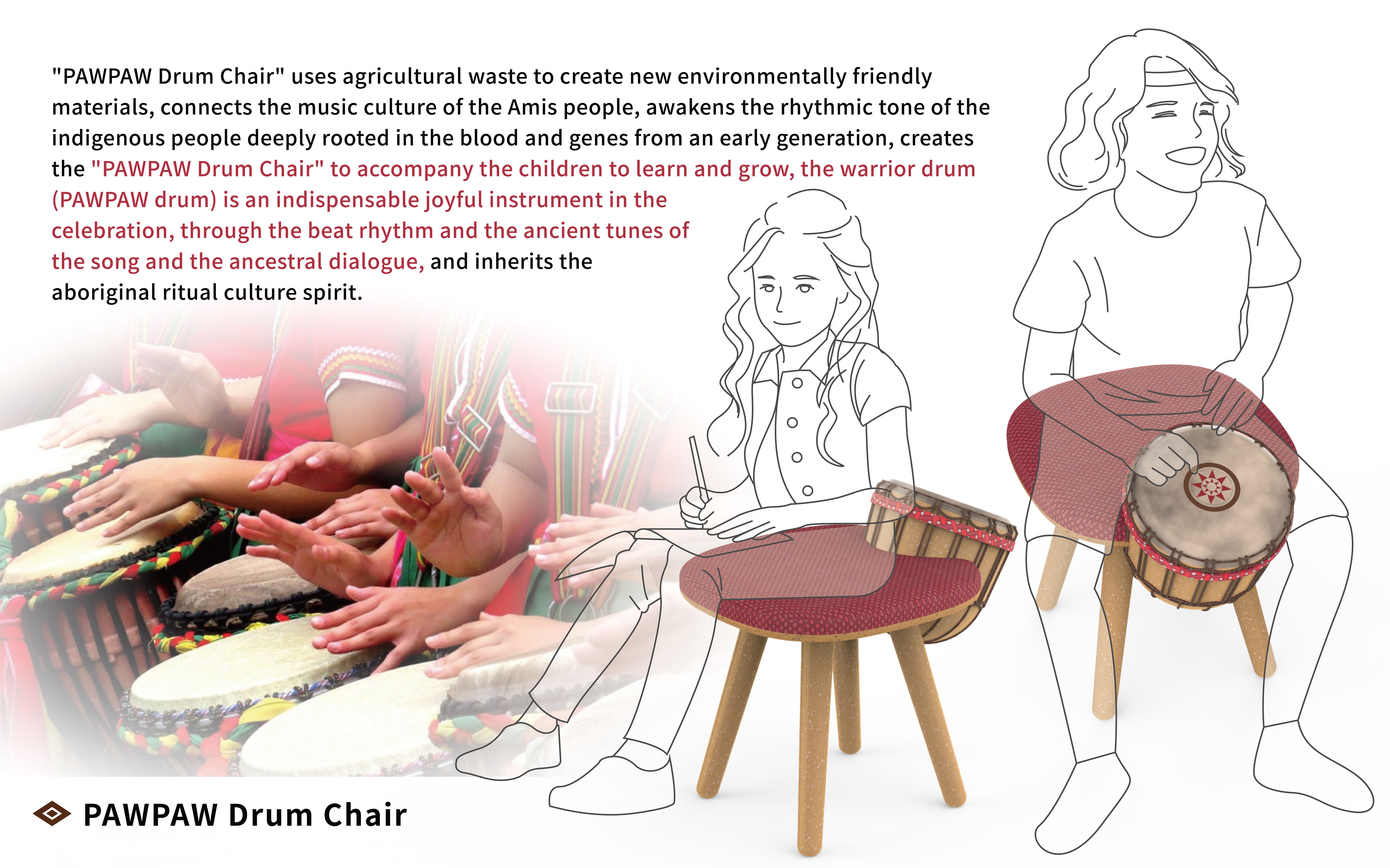 "PAWPAW Drum Chair" uses agricultural waste to create new environmentally friendly materials, connects the music culture of the Amis people, awakens the rhythmic tone of the indigenous people deeply rooted in the blood and genes from an early generation, creates the "PAWPAW Drum Chair" to accompany the children to learn and grow, the warrior drum (PAWPAW drum) is an indispensable joyful instrument in the celebration, through the beat rhythm and the ancient tunes of the song and the ancestral dialogue, and inherits the aboriginal ritual culture spirit.