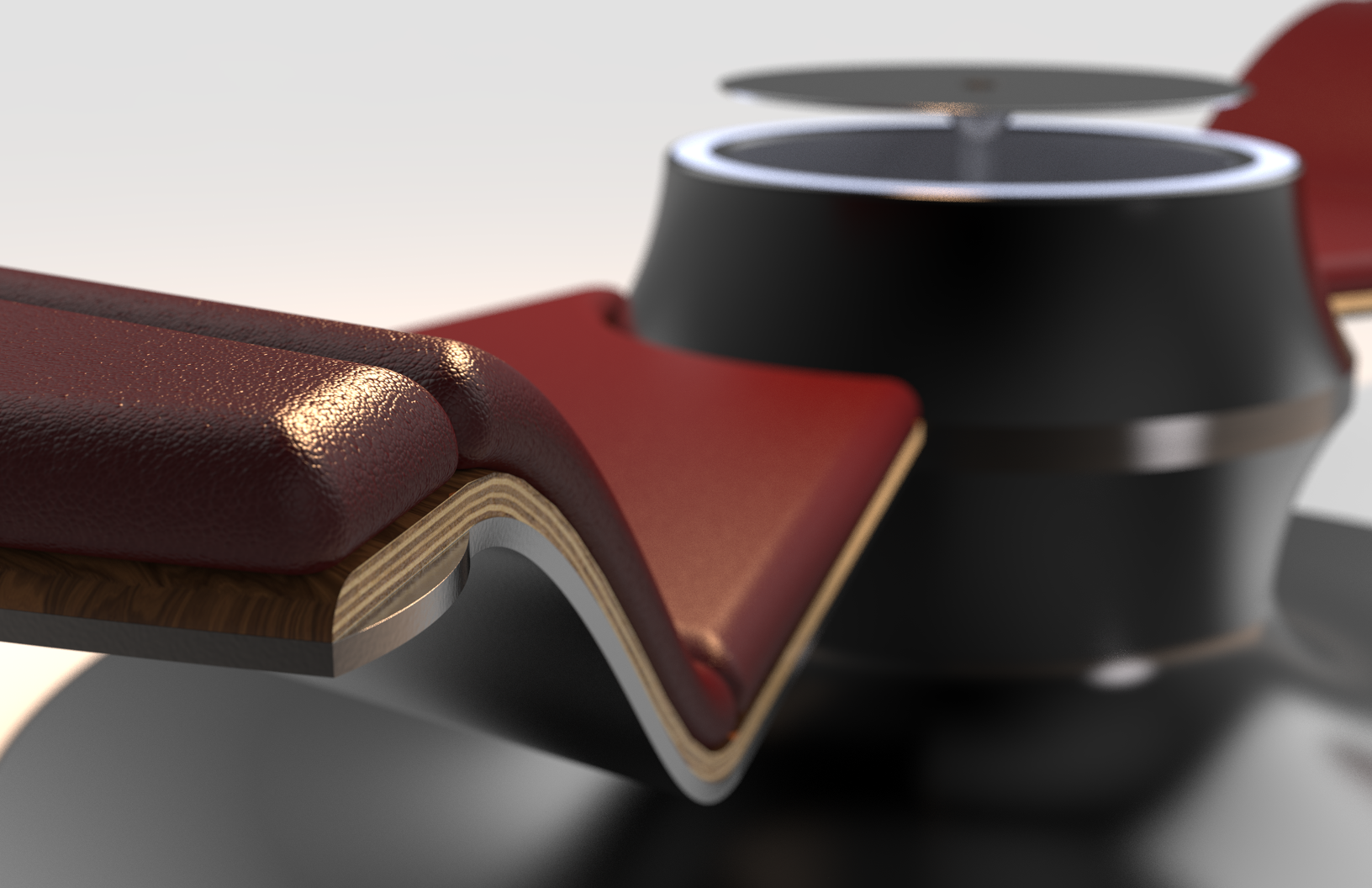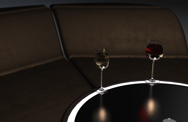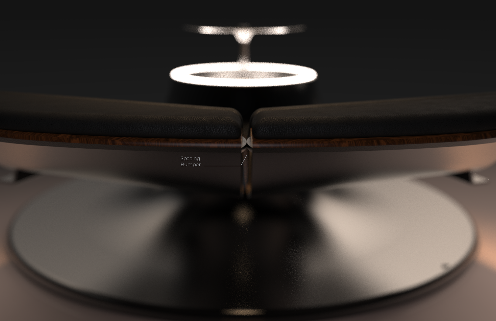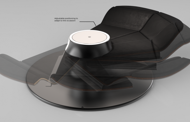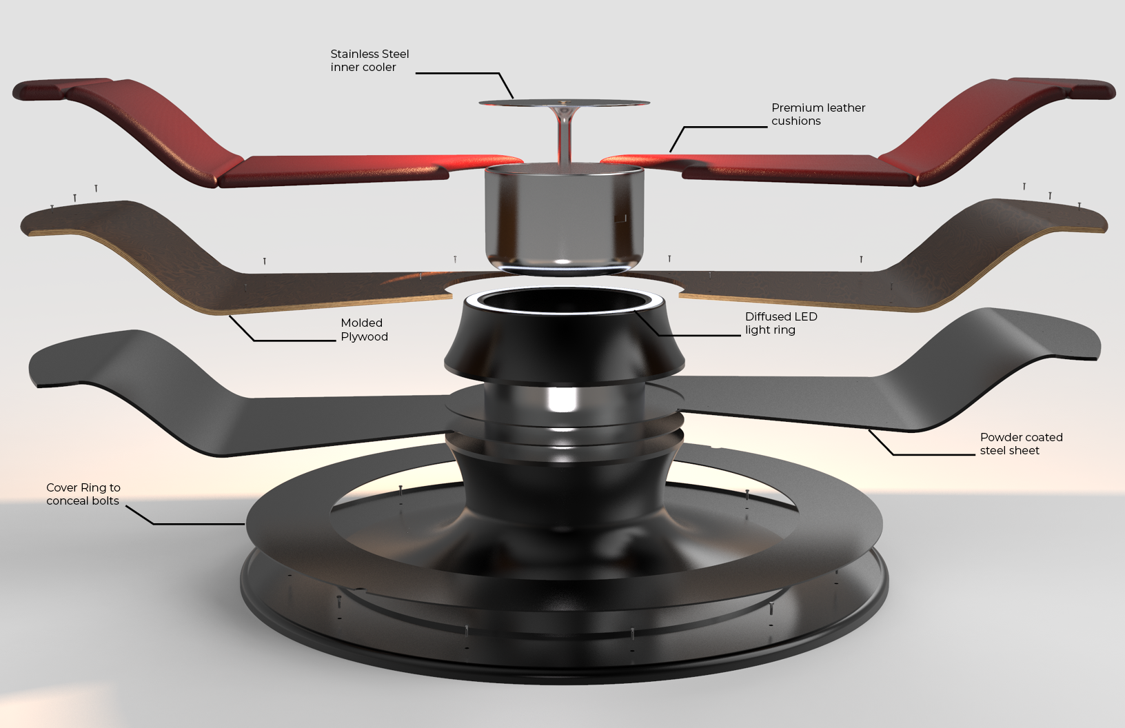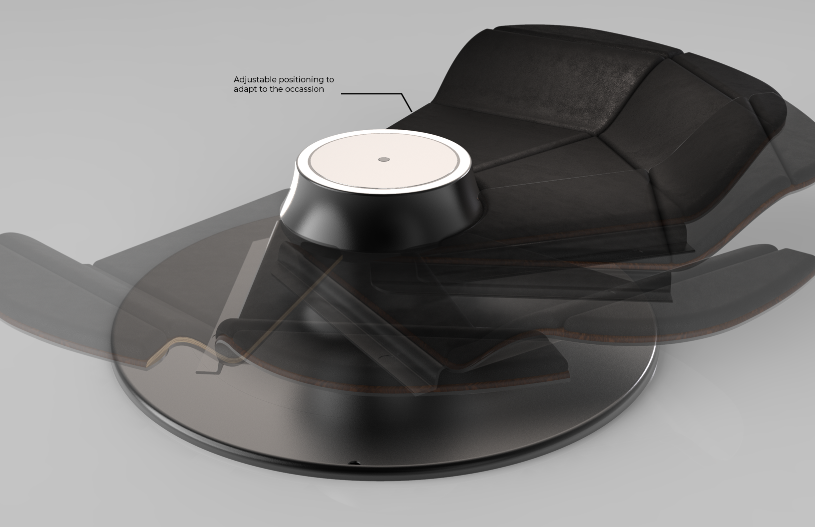 The fully blossomed chair invites people to a more casual and open environment for socializing. Whereas, when the two ends come together as one, the mood between those who choose to relax becomes more personal and connected. A ring of soft white light highlights the edge of the automated rising table, providing both a comforting ambiance as well as a functional way to observe the clarity and color of the wine. Two side platforms allow for a more convenient location to rest a glass of wine as people are laid back in the fully unified orientation.