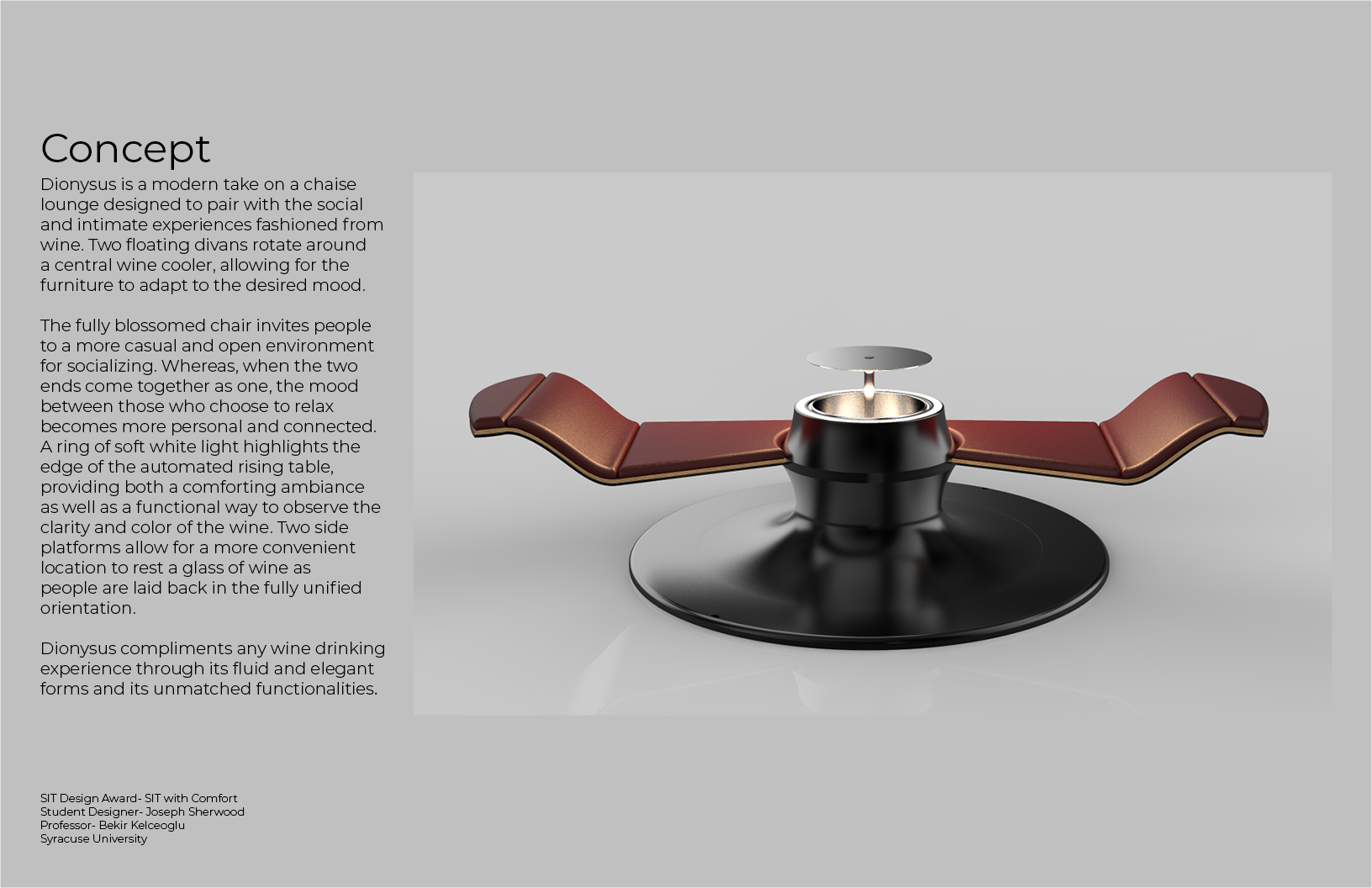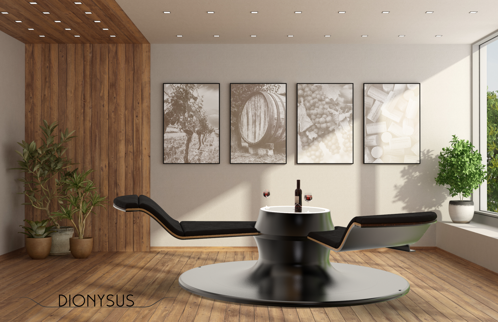 Dionysus is a modern take on a chaise lounge designed to pair with the social and intimate experiences fashioned from wine. Two floating divans rotate around a central wine cooler, allowing for the furniture to adapt to the desired mood.
