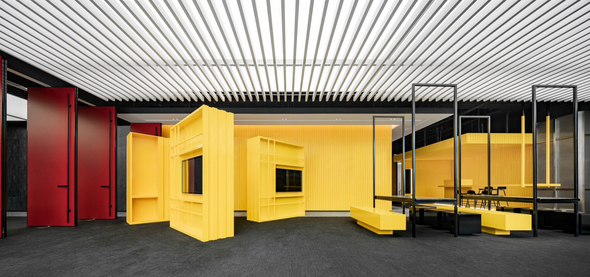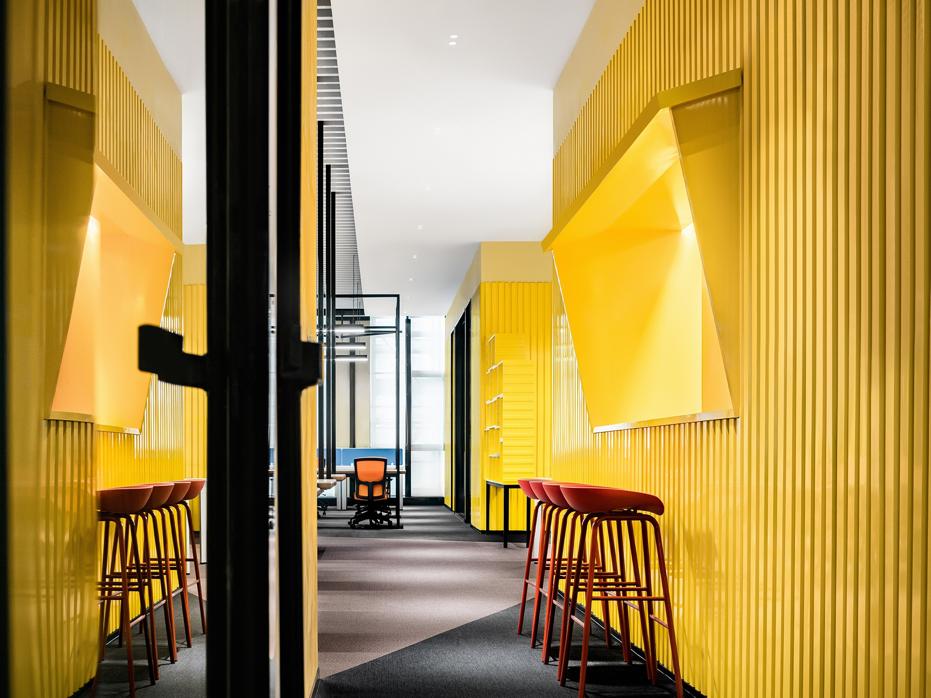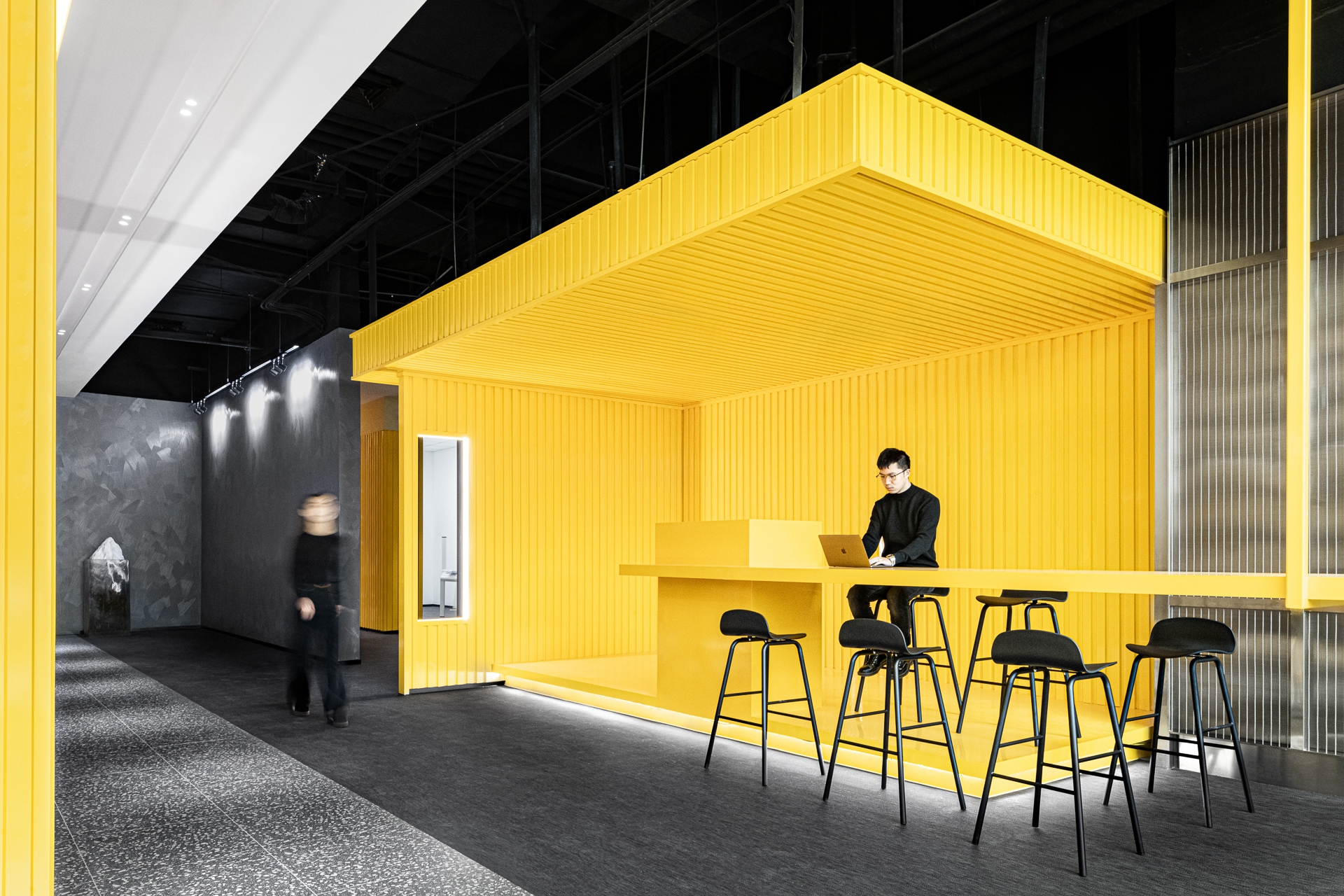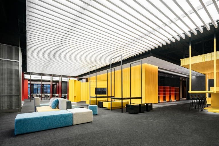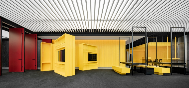 The project is located in Ningbo, a city that was the starting point of the ancient Maritime Silk Road and is still one of the most important port cities in China.The design inspiration comes from the container terminal. By combining container elements, colors and geometric figures in an orderly manner, an industrial-style business center is constructed.Taking the container as a box, each individual space is stacked and reassembled and redistributed through the whole space to form different open areas and structure. At the same time, different containers interpret different colors, like the high saturation of building blocks and the color composition of large blocks. Combined with the interspersed blocks, they together form an industrialized, modernist aesthetic with a sense of "order".The combination of line and surface is another design focus of this project. The lines are the characteristics of the container itself, and the industrial die-cast corrugated metal panels have a natural texture.The work uses this material as an important design element. Thick metal collides with bright colors, and the deconstructed space is paired with a well-organized order.