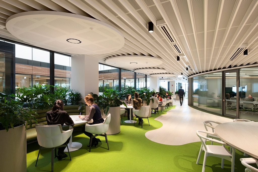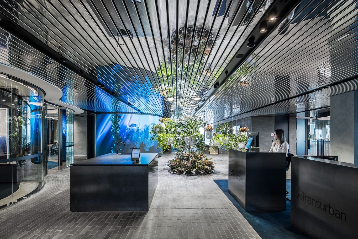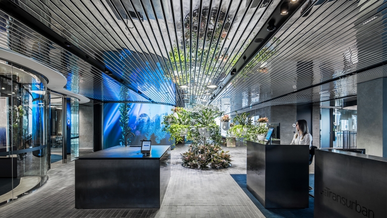 The arrival area’s planked, reflective ceiling and bluestone paving project a civic quality, mimicking an urban plaza. Freestanding meeting ?‘pavilions’ with curved glass walls create winding pathways that encourage visitors and employees to explore the whole floor. Full-height visual displays echo roadside billboards showcasing Transurban projects.
