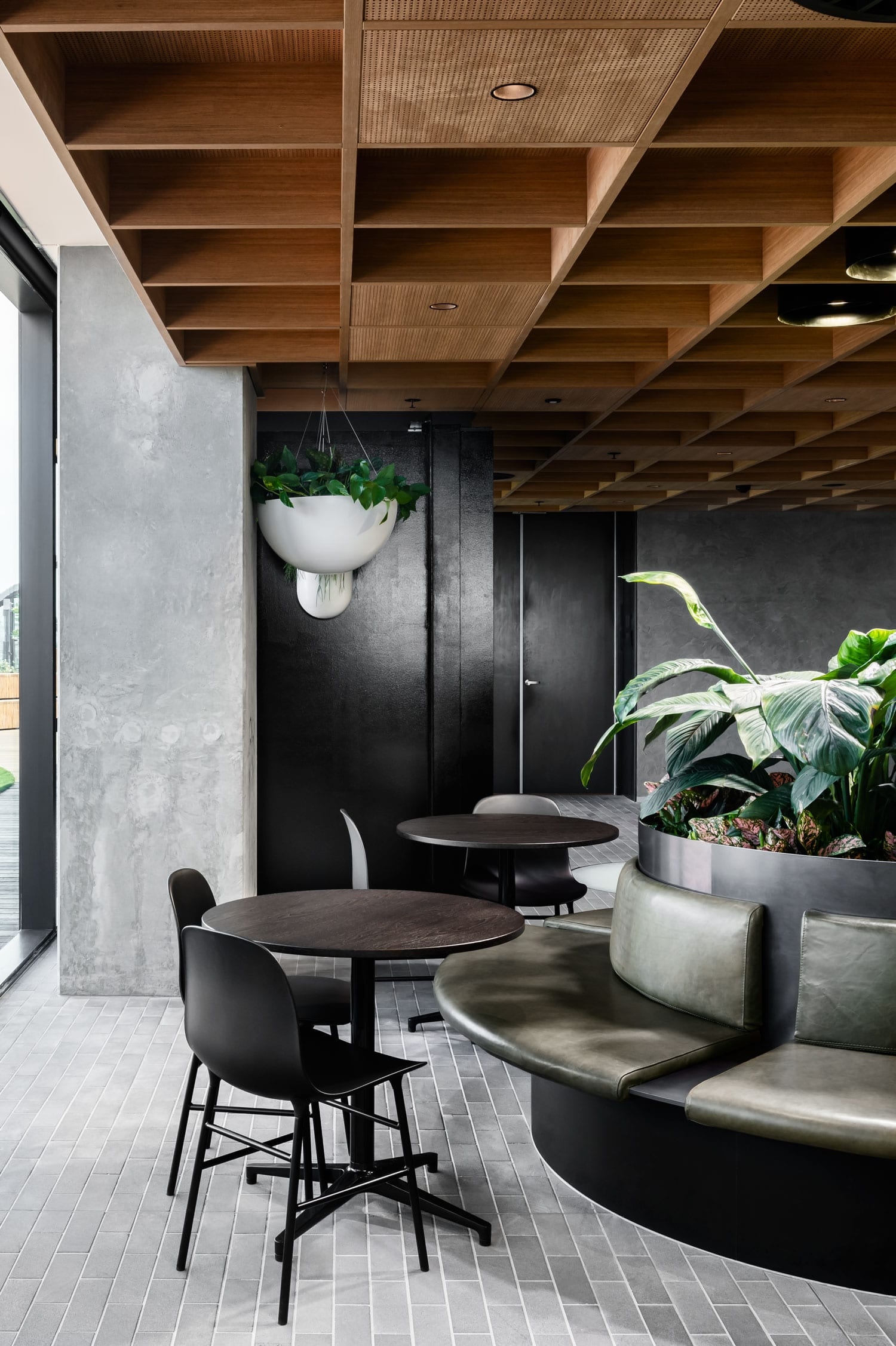 A dramatically lit, circular void links across all levels, connecting staff to a bustling hub. With a vaulted timber ceiling, blackened steel railings and more paving, the hub is an engaging space for everyday use and special events.