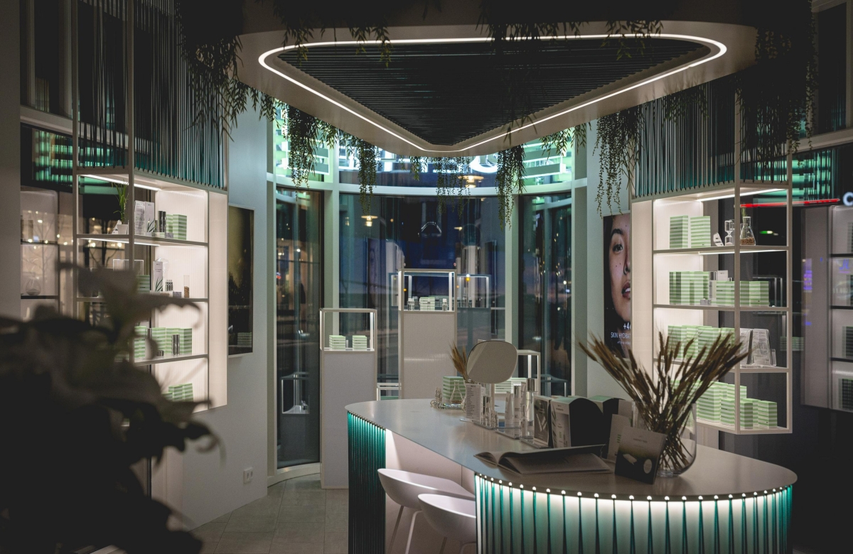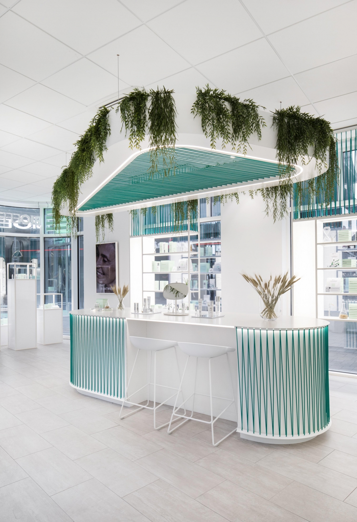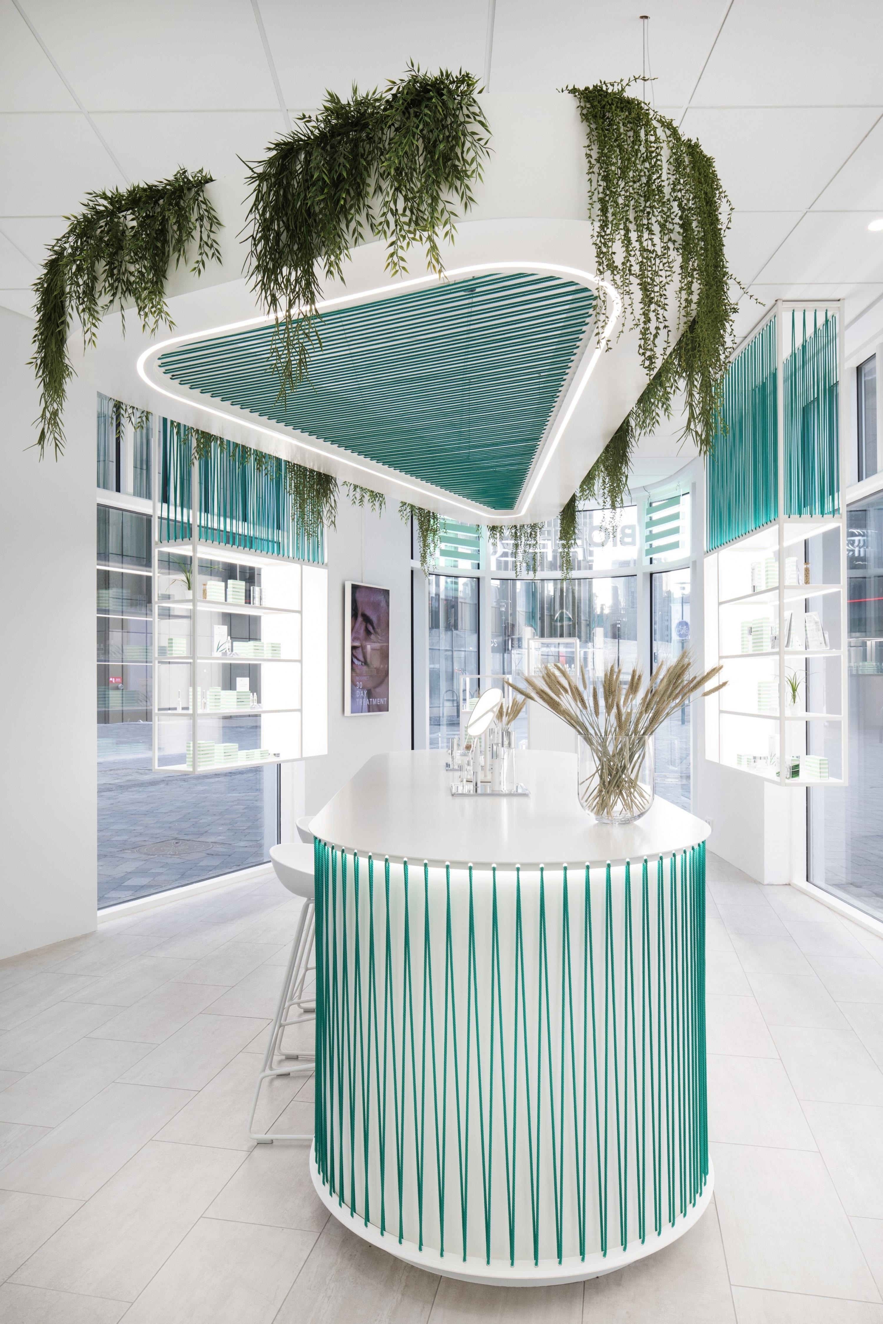 The interior arrangement of the store responds to the triangular shape of the space. The flow of guests is organized around a central element that combines product display, information, product testing, seating space and storage space. A large, triangle-shaped luminaire doubles as a floral crown where plants hang above the space contributing to the overall sense of wellness.