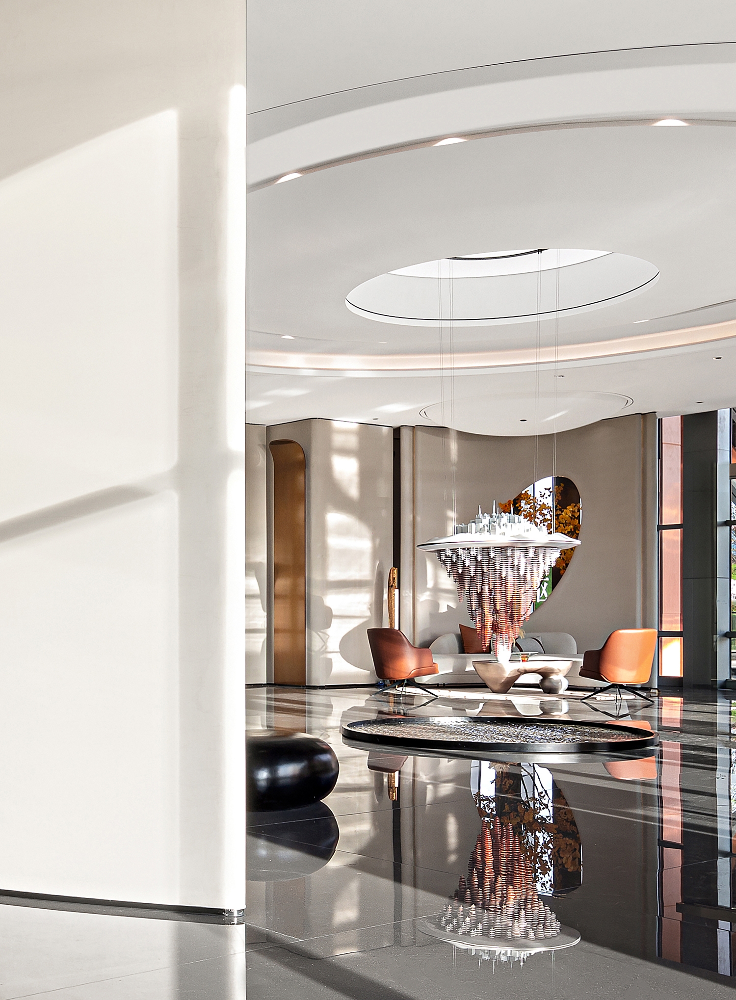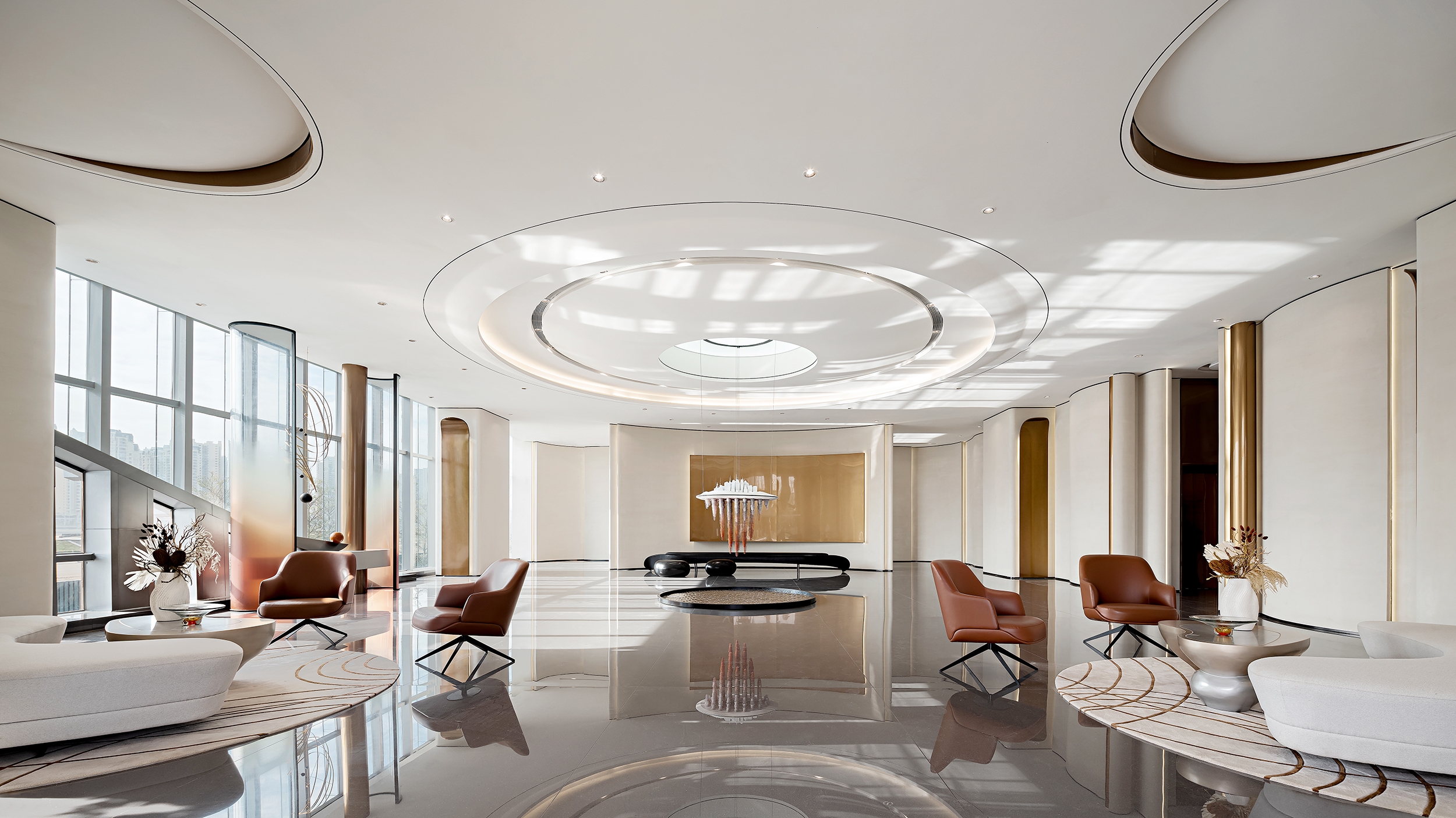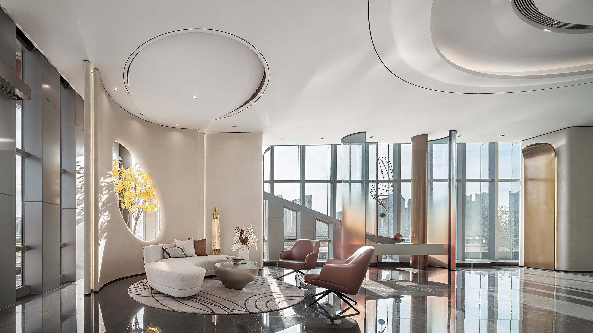 Zhonghai Yuejiang Mansion is built on the sea, and the design concept is developed with the concept of "watching the moon". Through the lingering stars and the curve of the universe, it gives new vitality to the architectural space. Looking at the seaside, the sun and the moon reciprocate on the sea, the sky full of stars in the morning, haunting the endless night sky, and the interstellar curve transforms the space into a rhythmic and dynamic art space. Space and nature reflect each other, people and time, thinking and creation, the new art is intertwined in the space gap, further sublimating the concept of Mochizuki.