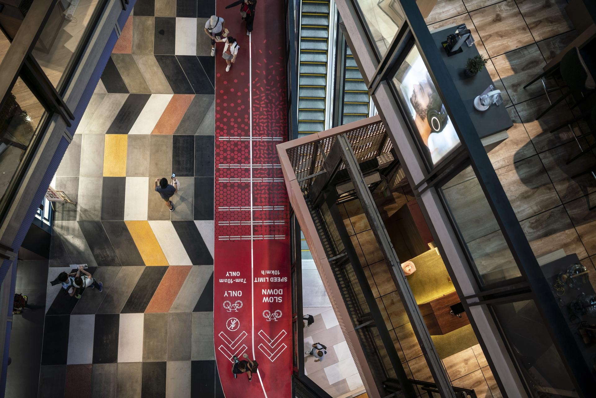 The design acknowledges the rise in online shopping and the changing role of brick-and-mortar stores to deliver a new era of retail that maximizes engagement for a tech-savvy generation. Spaces connect laterally and vertically to provide an integrated environment that blurs traditional zones of function and experience to offer an ecosystem of lifestyle activities under one roof.