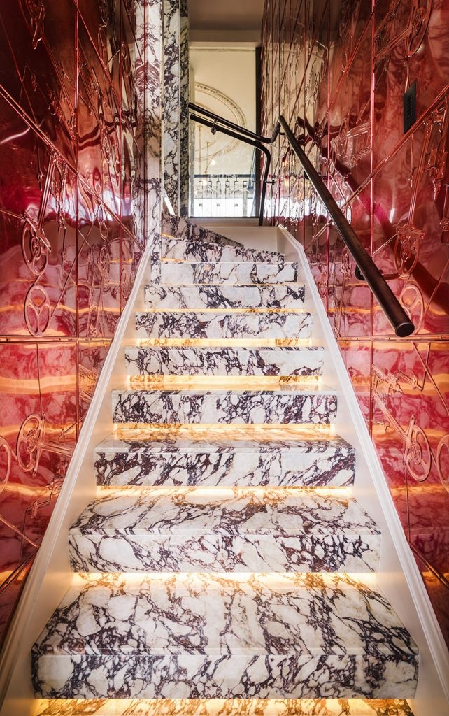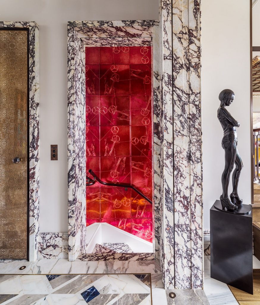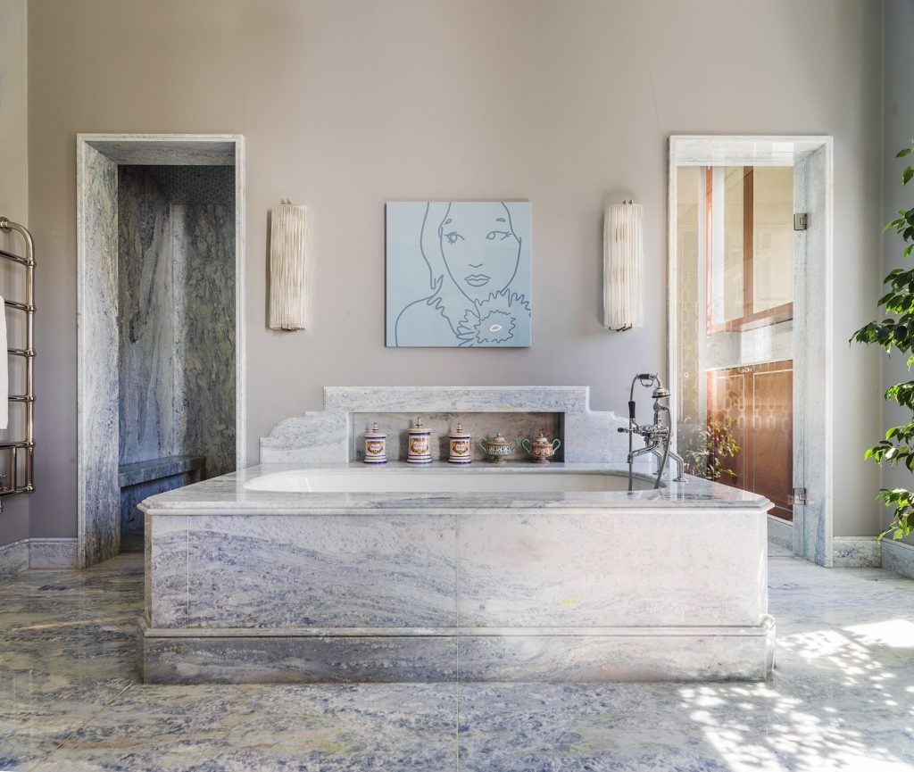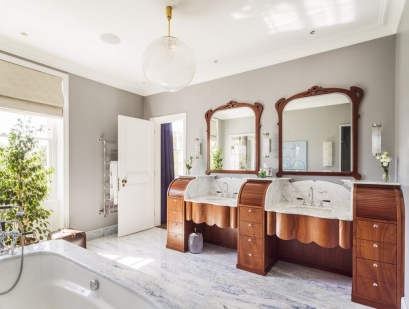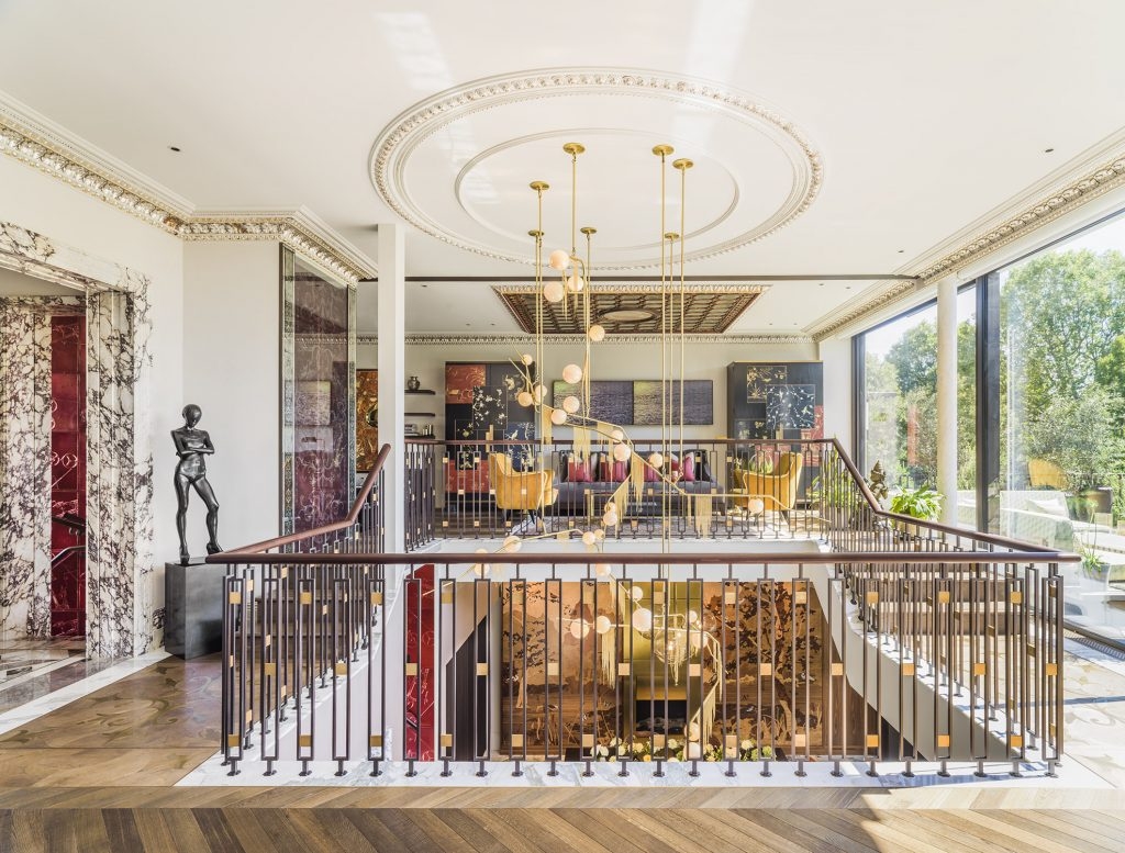 A large part of the project was sourcing great British craftmanship. A range of techniques from guilding to cabinet making was employed for various furniture and surfaces. The variety of textures, materials and colours creates an overall palette of tactile quality with interest on every surface, whilst bringing in period elements through cornicing and ceiling moulding. There is a play between old and new through existing pieces, vintage and contemporary lighting and furniture. The interiors were a means to tell a story through global pieces to vintage finds combined with elements from India representing the client’s heritage.
