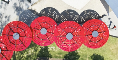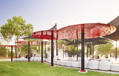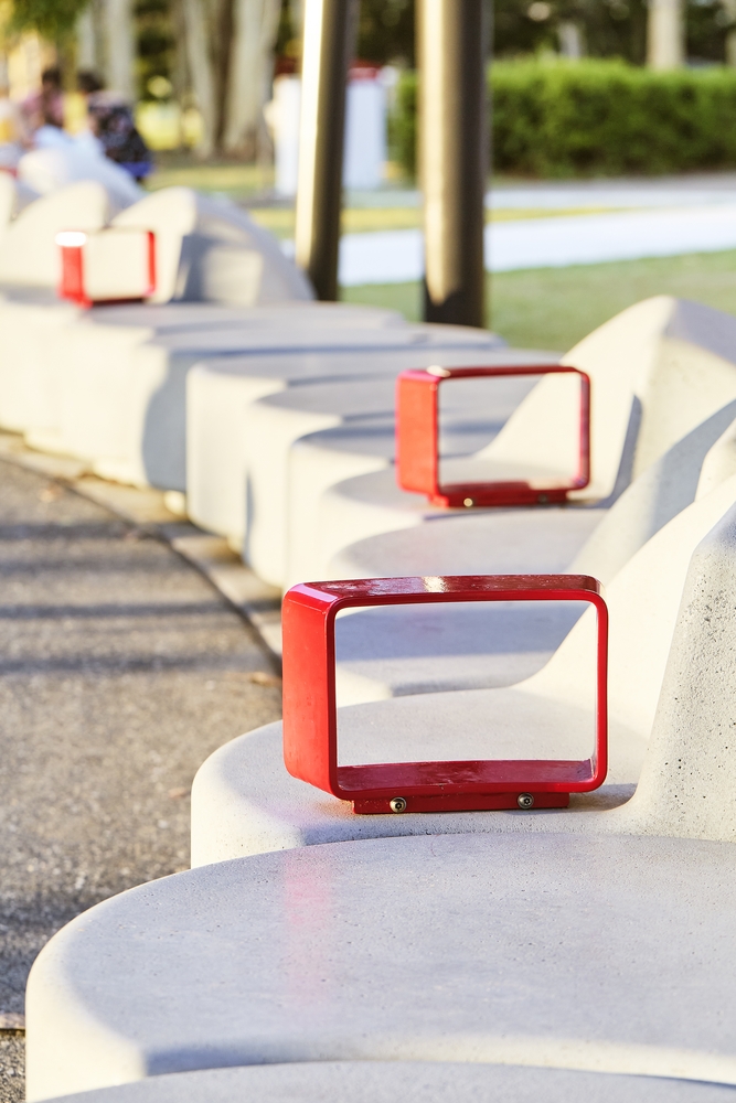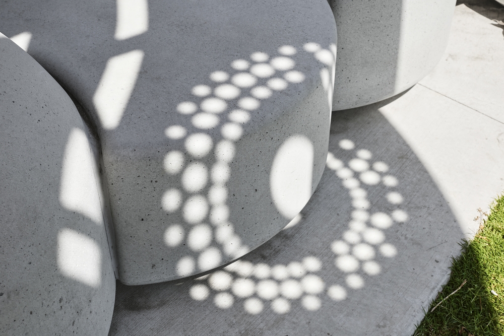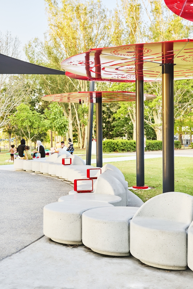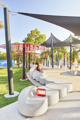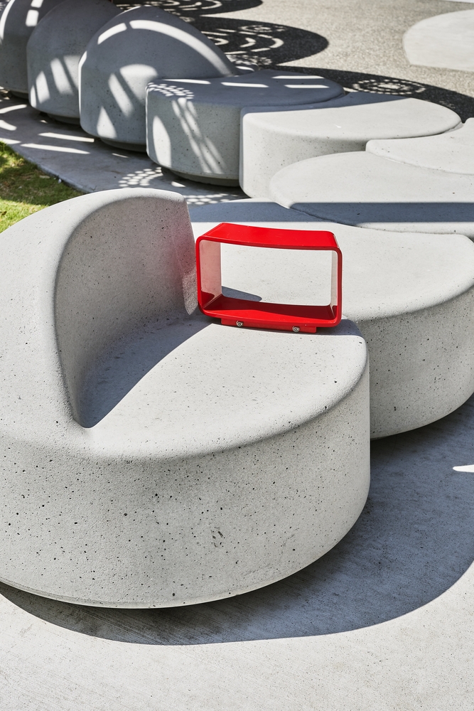 Given the context of a playground, the forms needed to be playful and functional. Integrated circular forms were chosen to provide a method of joining and tessellating the modules. The cutouts in the furniture modules and the stepped heights and overlapping forms of the shelter modules allowed the elements to articulate to achieve the complex site layout requirements. The solution provided by Street and Garden was able to seamlessly integrate with the landscape design, including being able to easily adapt to straight, curved, and angled changes in direction of the adjacent pathways and grassed areas.