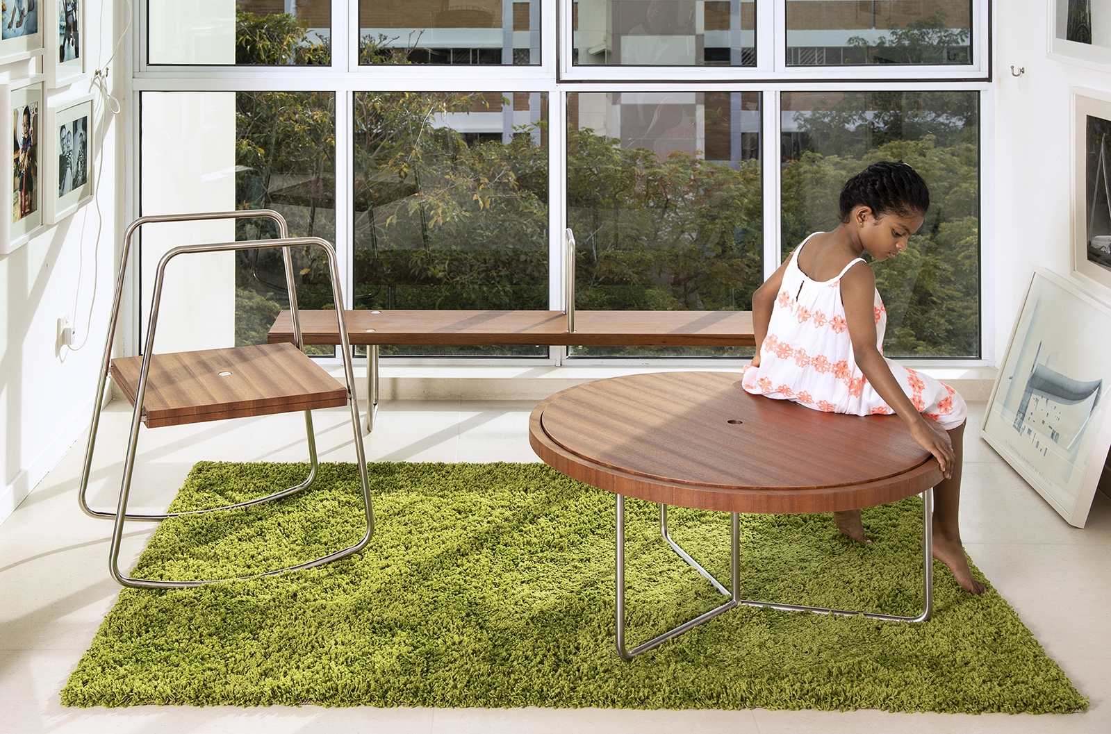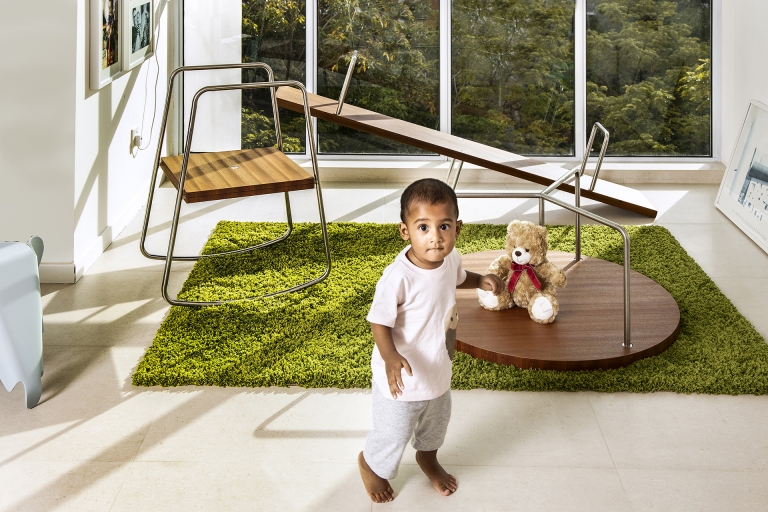 The play furniture is a combination of clean design lines with natural wood and tubular steel, stripped away all excess. Modest joinery details complement the simple design while allowing ease of assembly.