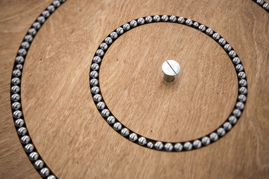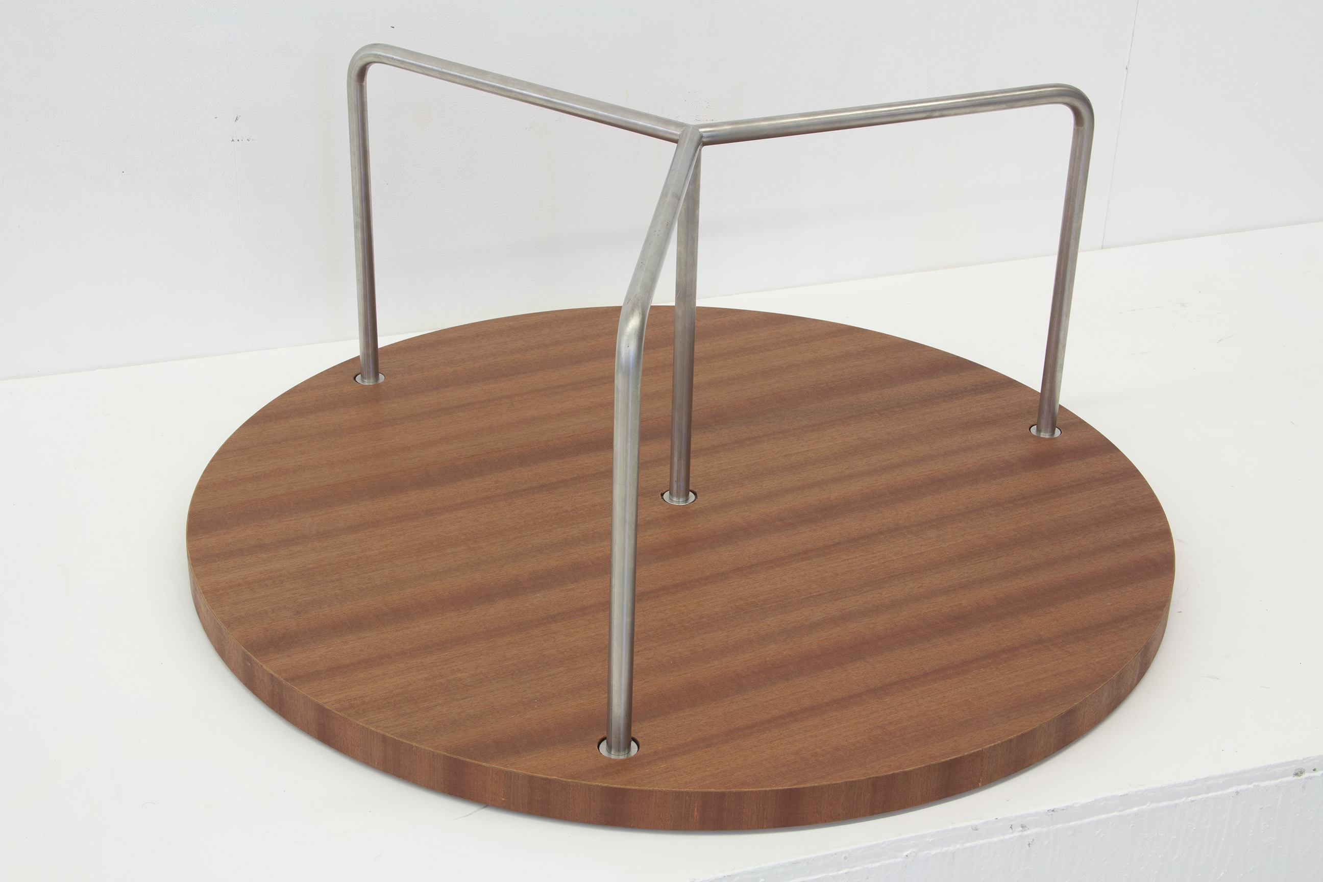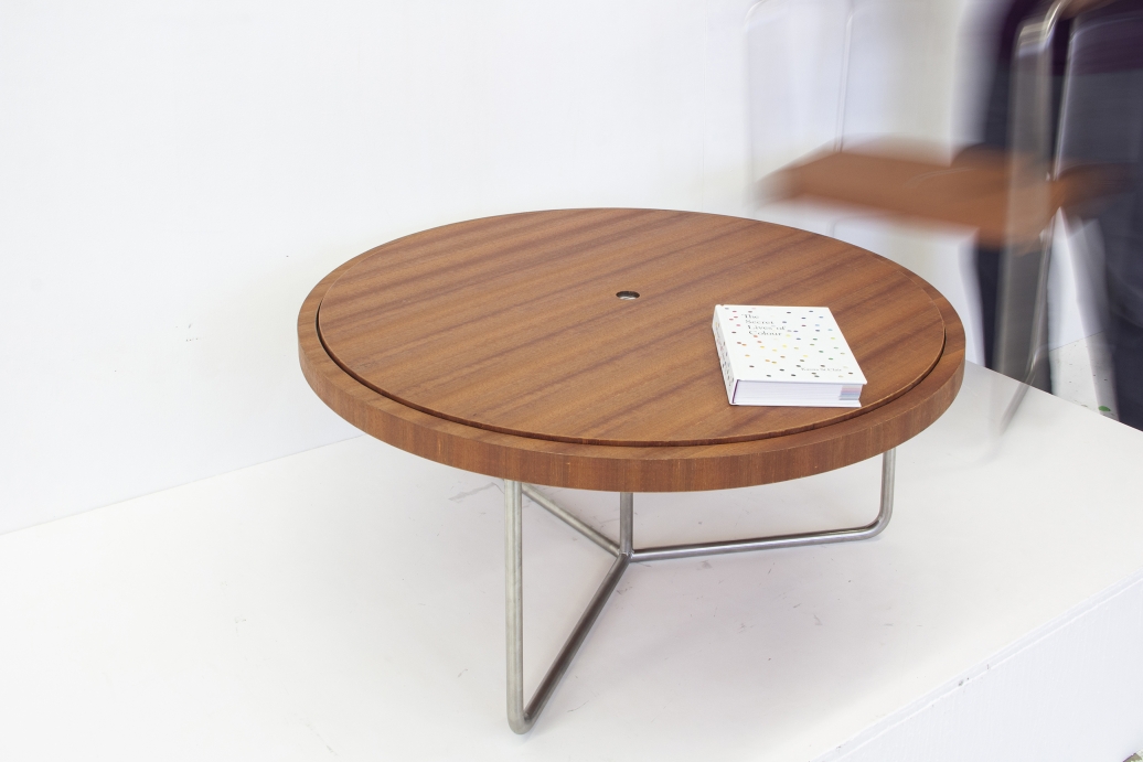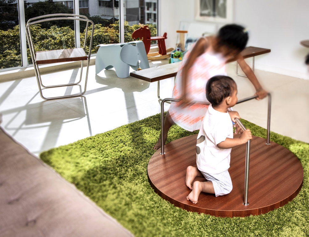 In upright position, this is an unassuming coffee table with a rotating top. When turned over, it becomes a merry-go-round.