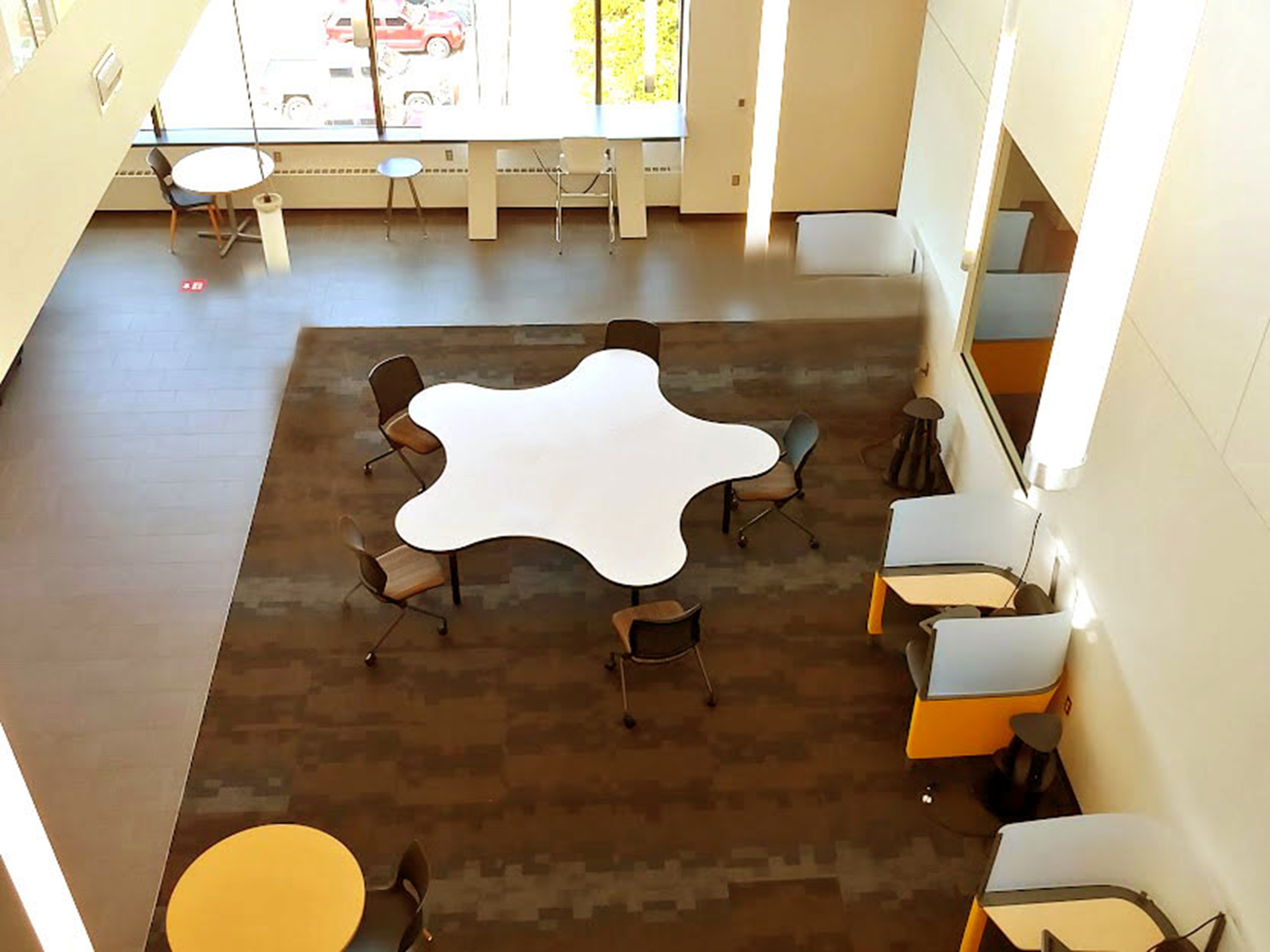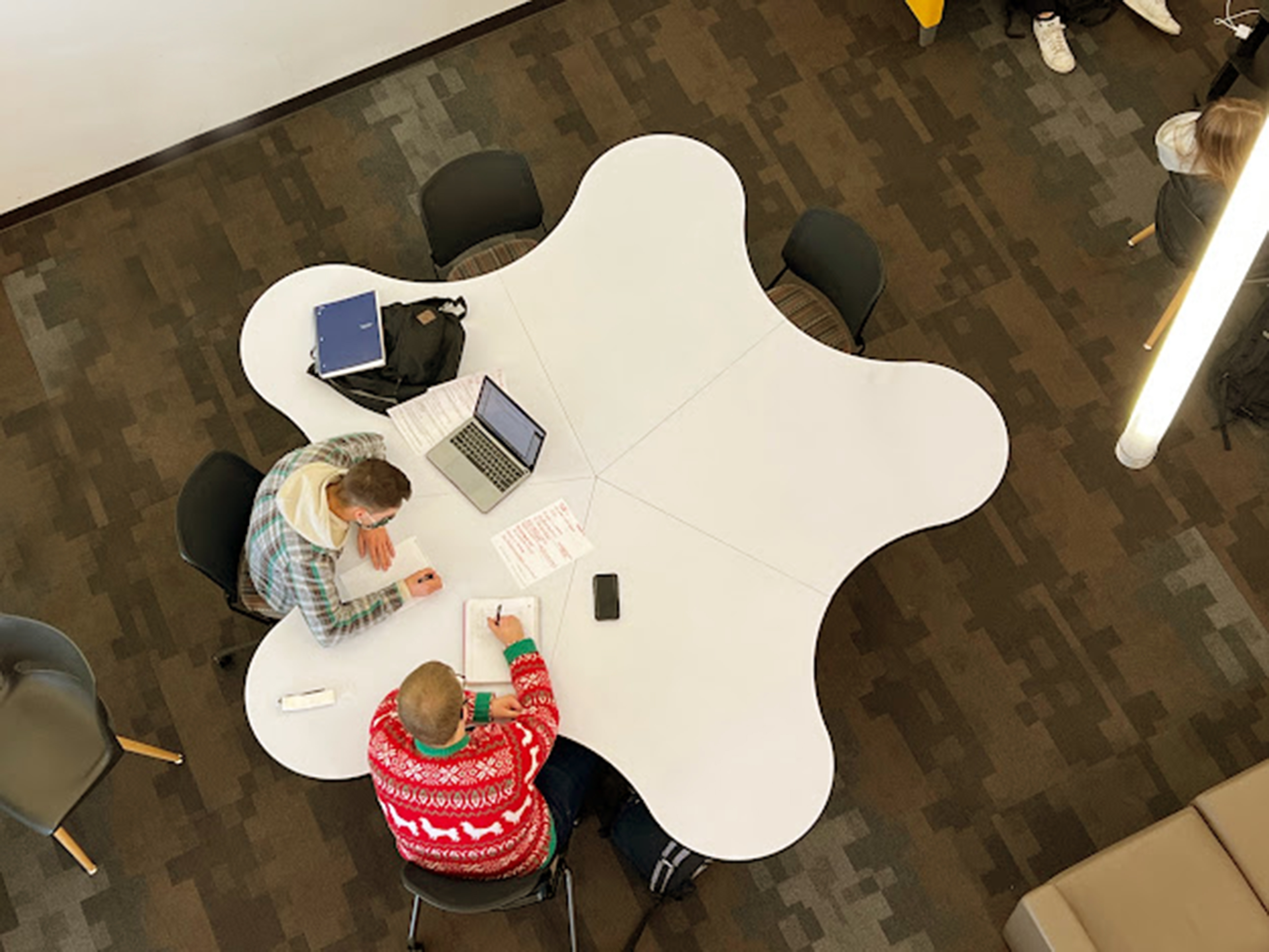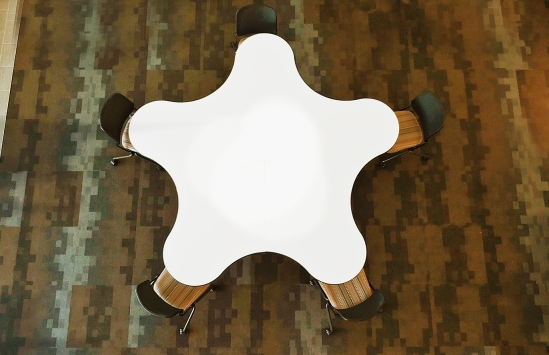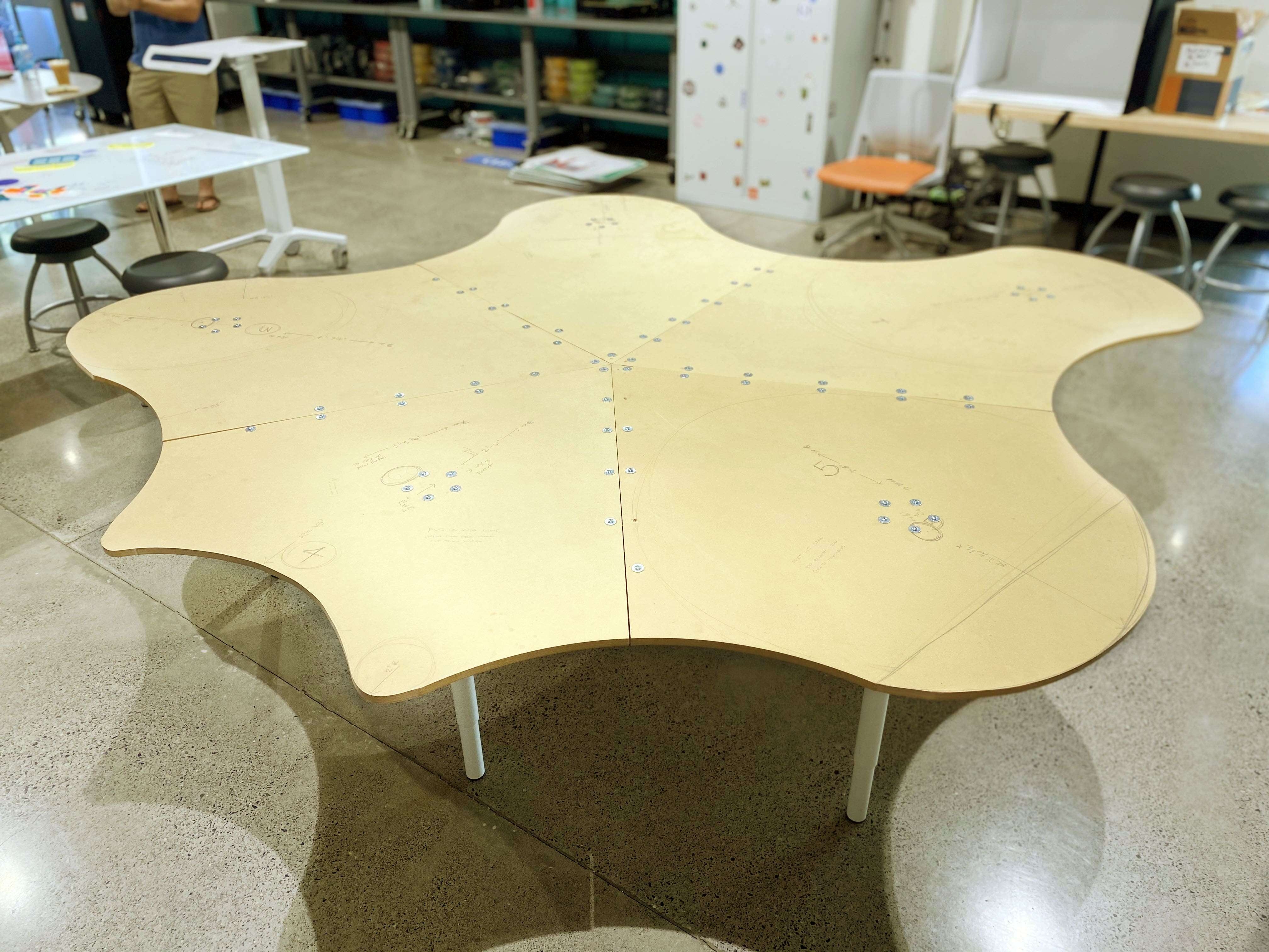 Through the construction of 6 full-scale prototypes and a series of controlled focus groups, a radial arrangement of petals and pockets emerged that allows users to customize their position and involvement at the table. Visual access to every user is achieved simply by rotating in one’s chair. The table can be used by a group of 10 or by multiple smaller groups simultaneously. The size and shape allows users enough space for a laptop and accessories or provides educators enough space for classroom learning tools. The leg arrangement meets ADA requirements and allows all users ease of movement. Social distancing is achieved at half capacity and the non-hierarchical layout solves the problem of social awkwardness in public spaces, especially post-COVID.