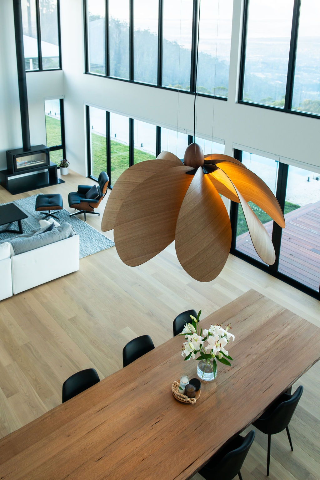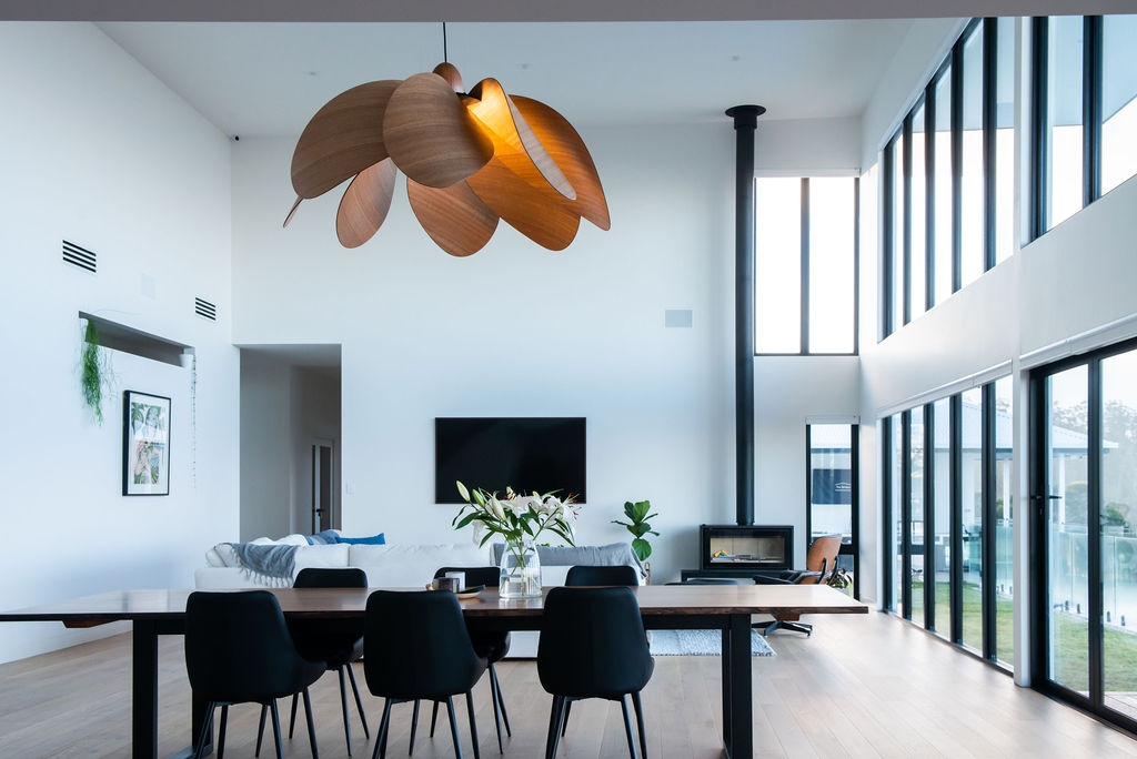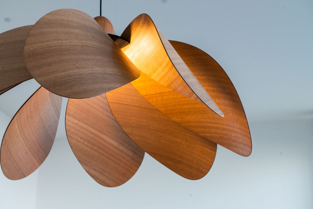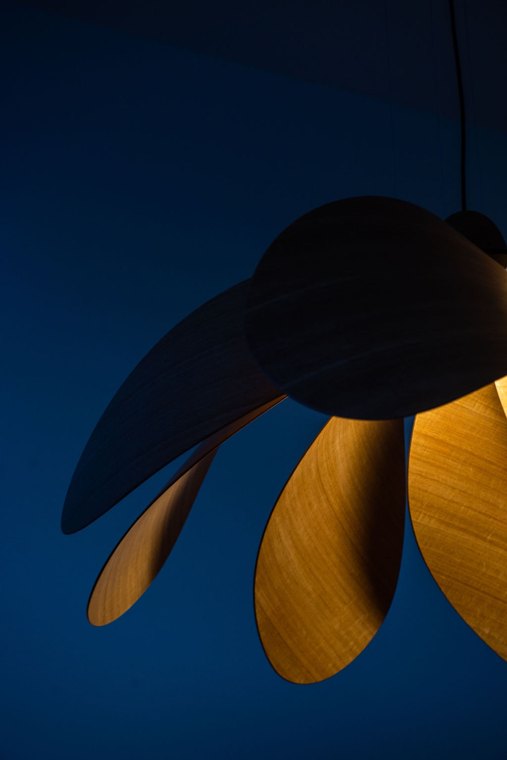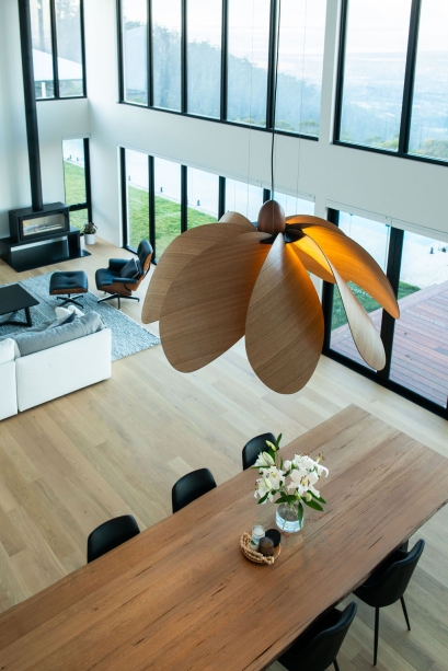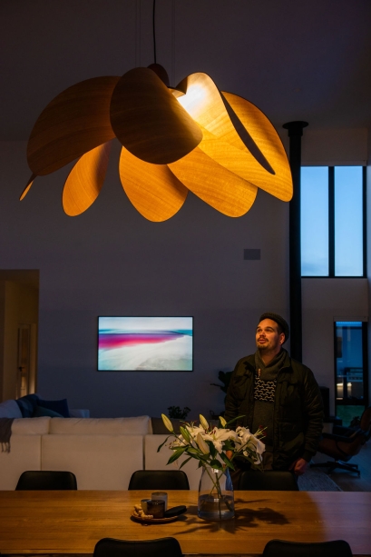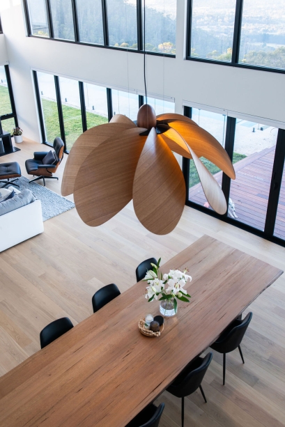 Propeller Bloom, a 1500mm wide show stopping feature piece is the latest addition to the Propeller Light range. The light commands presence and is designed and destined to occupy high ceilinged rooms and architectural void spaces. 8 petal-inspired Tasmanian Eucalypt blades slot into a custom made black anodised aluminium central disk, gently curving out and down around a single central bulb, with a large hand-turned blackwood nose cone completing the Propellor Bloom.