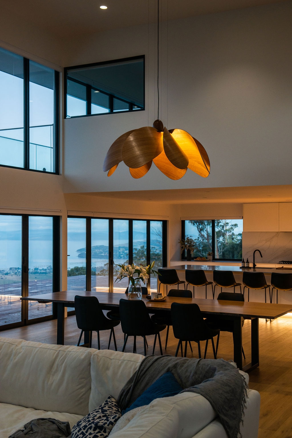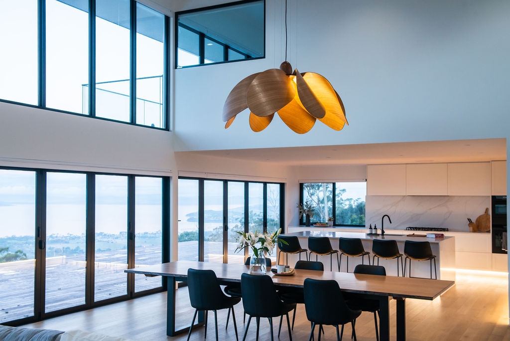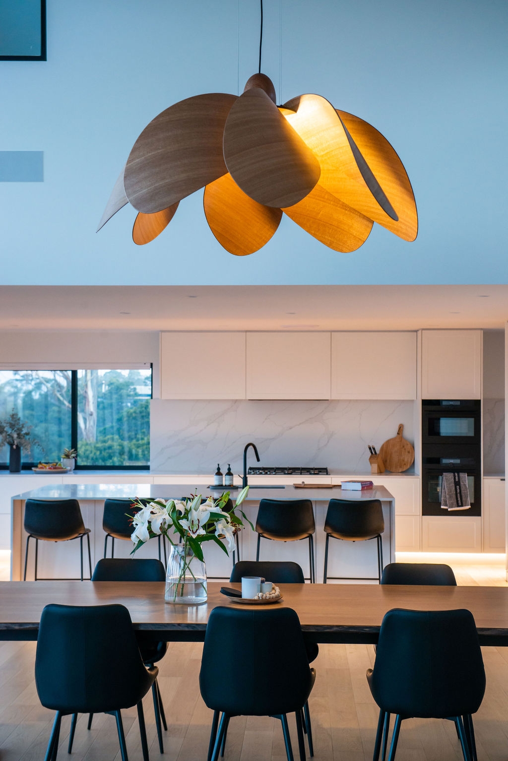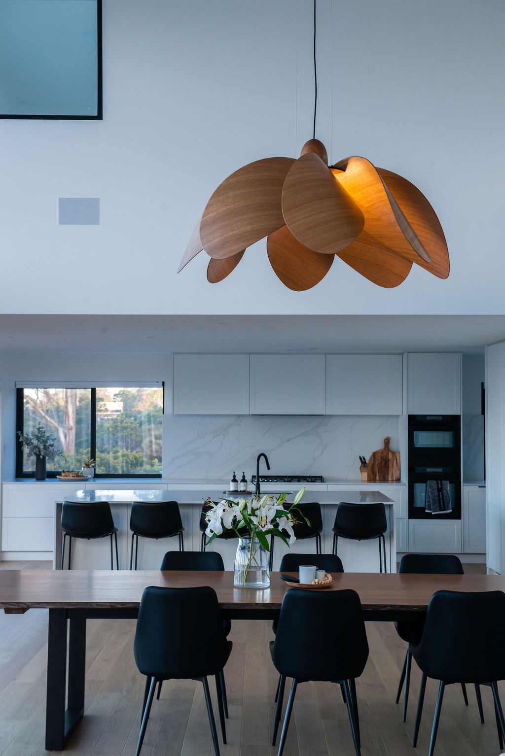 Propeller Bloom, a 1500mm wide show stopping feature piece is the latest addition to the Propeller Light range. The light commands presence and is designed and destined to occupy high ceilinged rooms and architectural void spaces. 8 petal-inspired Tasmanian Eucalypt blades slot into a custom made black anodised aluminium central disk, gently curving out and down around a single central bulb, with a large hand-turned blackwood nose cone completing the Propellor Bloom.
