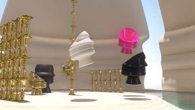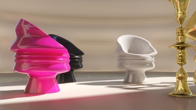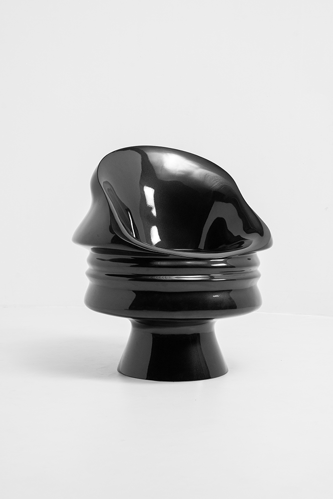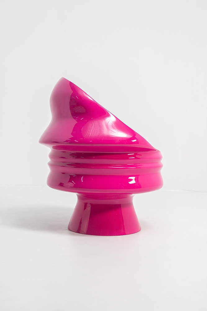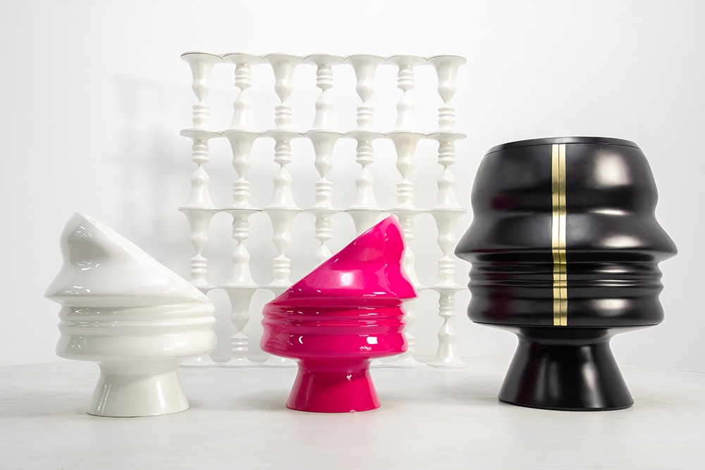 The Ego Collection’s exquisite pieces include: a dramatic and thought-provoking black cabinet with a gold brass inlay, a sumptuous human face chair available in Hot Pink, Pearl White, and Black, and a breathtaking Pearl White screen.