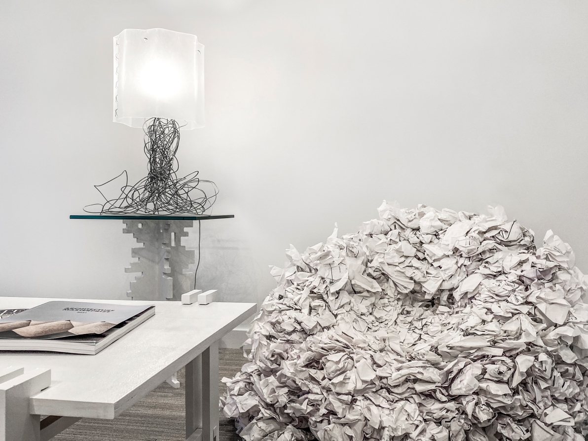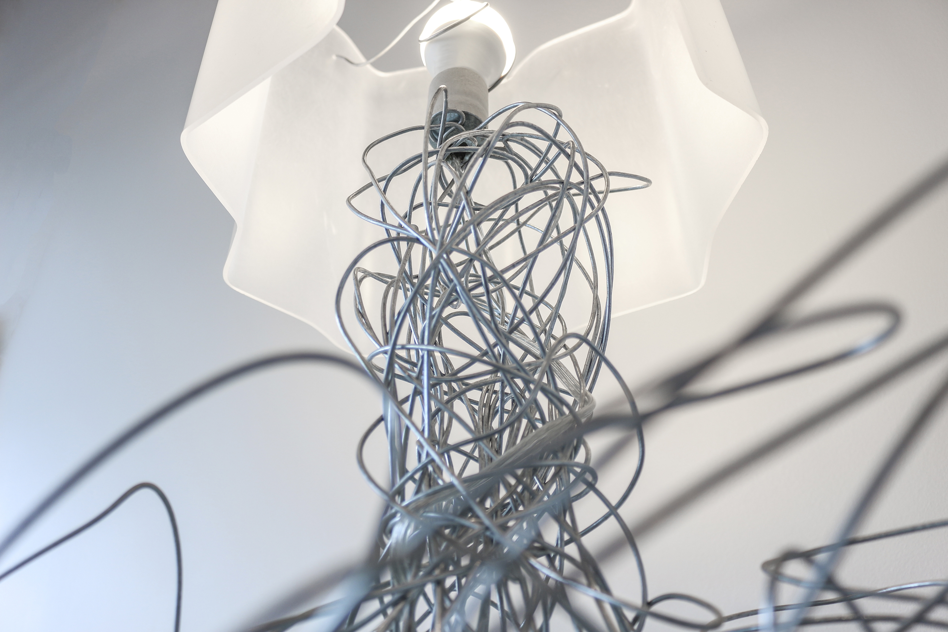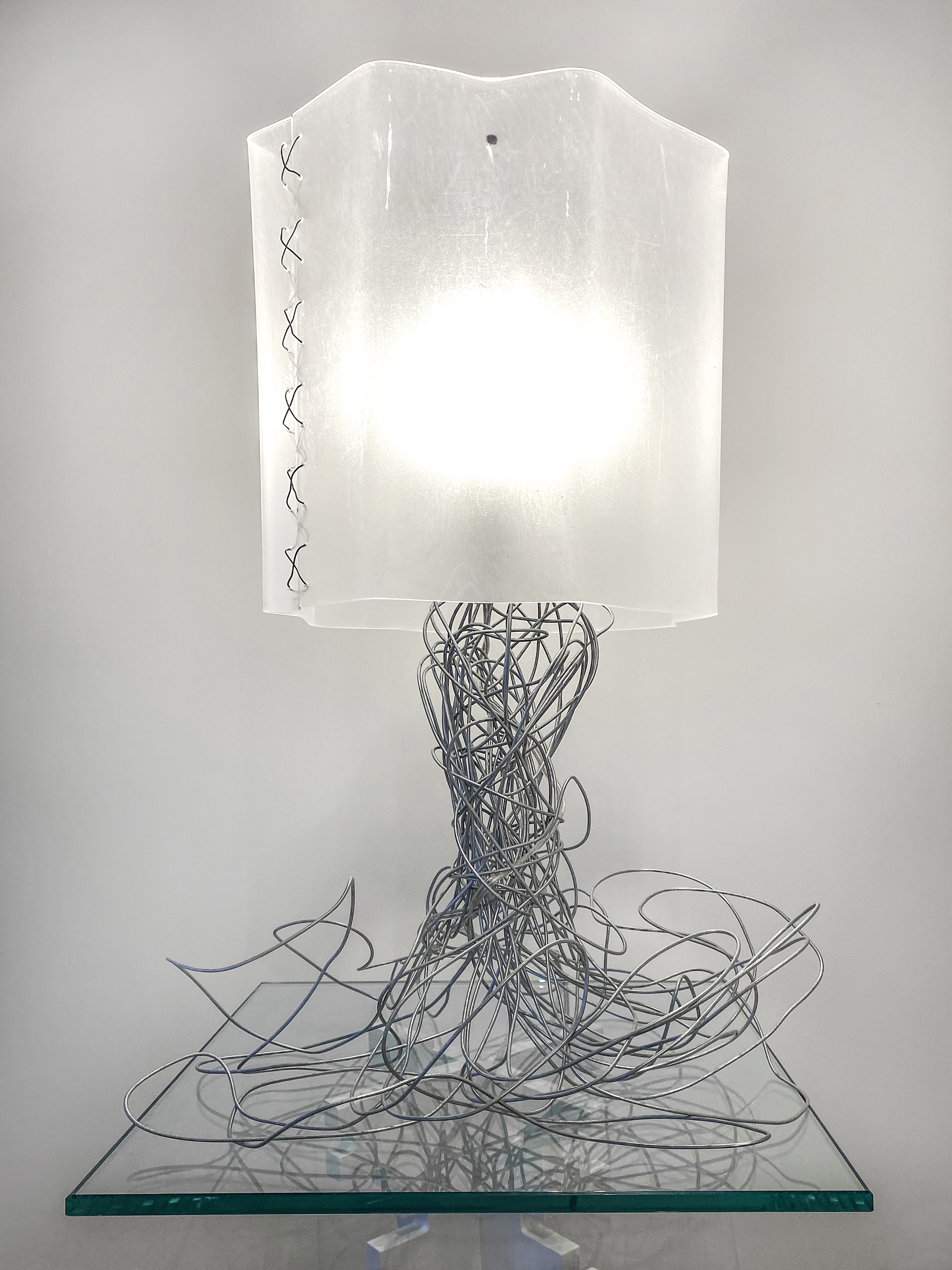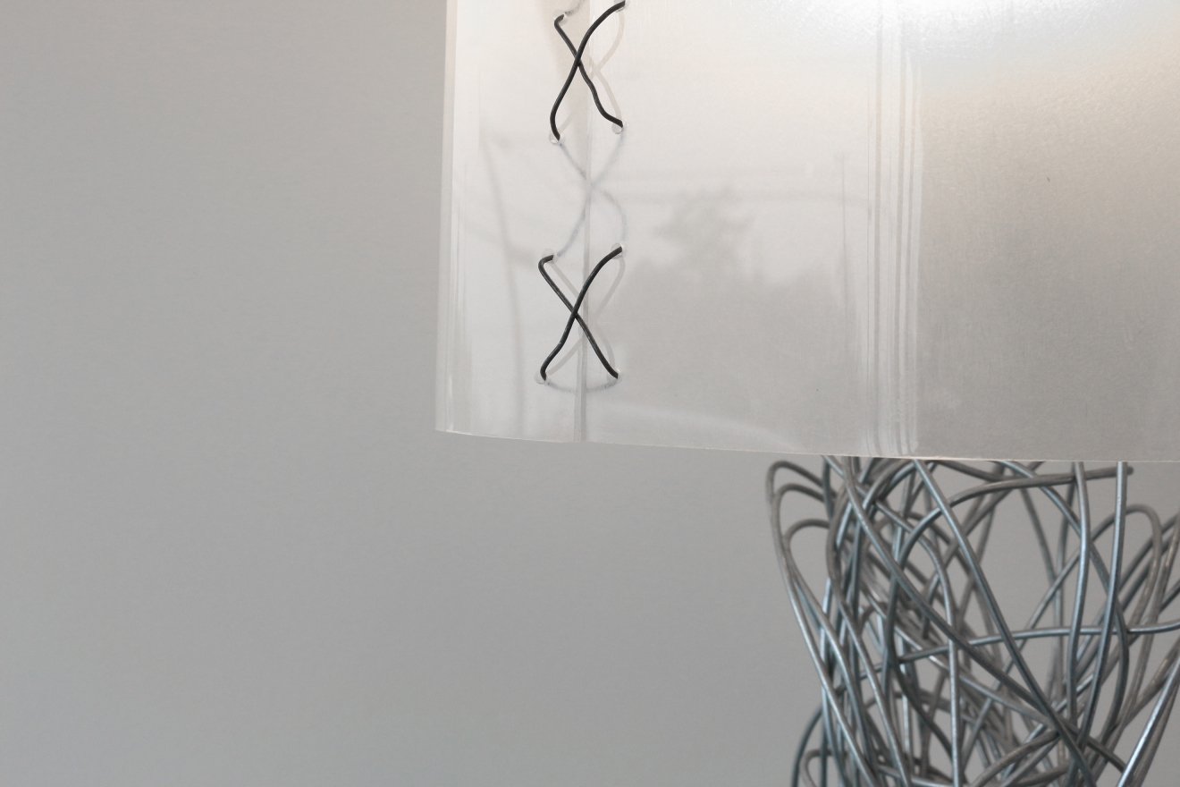 When looking for a medium or material for a design, inspiration is often found in the strangest places. In the case of the Sketch Lamp, chances are it’s just above your head and out of sight. Taking 12-gauge hanger wire from its typical use of suspending ceiling grids loaded with fluorescent fixtures and crafting it into a personal tabletop light fixture, our design team thought it was just quirky enough to work. Distorting the wire by hand, we began to understand that this was leading toward creating a base for the lamp. And then caping the new fixture with a custom plexiglass canopy methodically crafted using a heat gun and applying gentle pressure. Hand sculpted, the wire recalls both the elegant lines of art nouveau and the frenetic energy of a conceptual sketch. The lamp also incorporates some conventional elements such as a shade, simple switch, and chord selected to blend in with the color and lines of the lamp. Both familiar and foreign simultaneously in its resemblance to other table lamps, its sculptural qualities shift from bend to bend allowing each one to become an improvisation to the question of, “What is a lamp?”