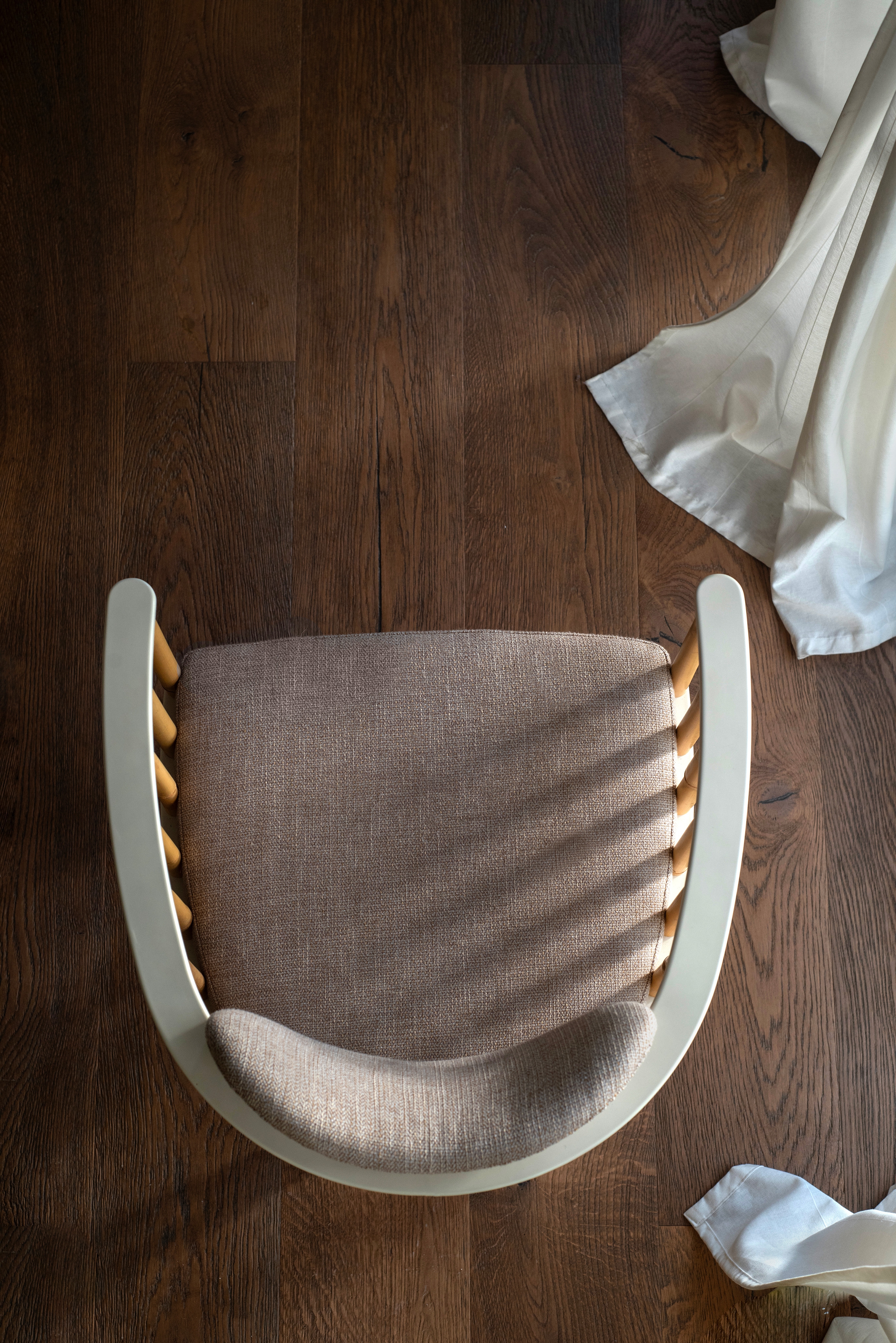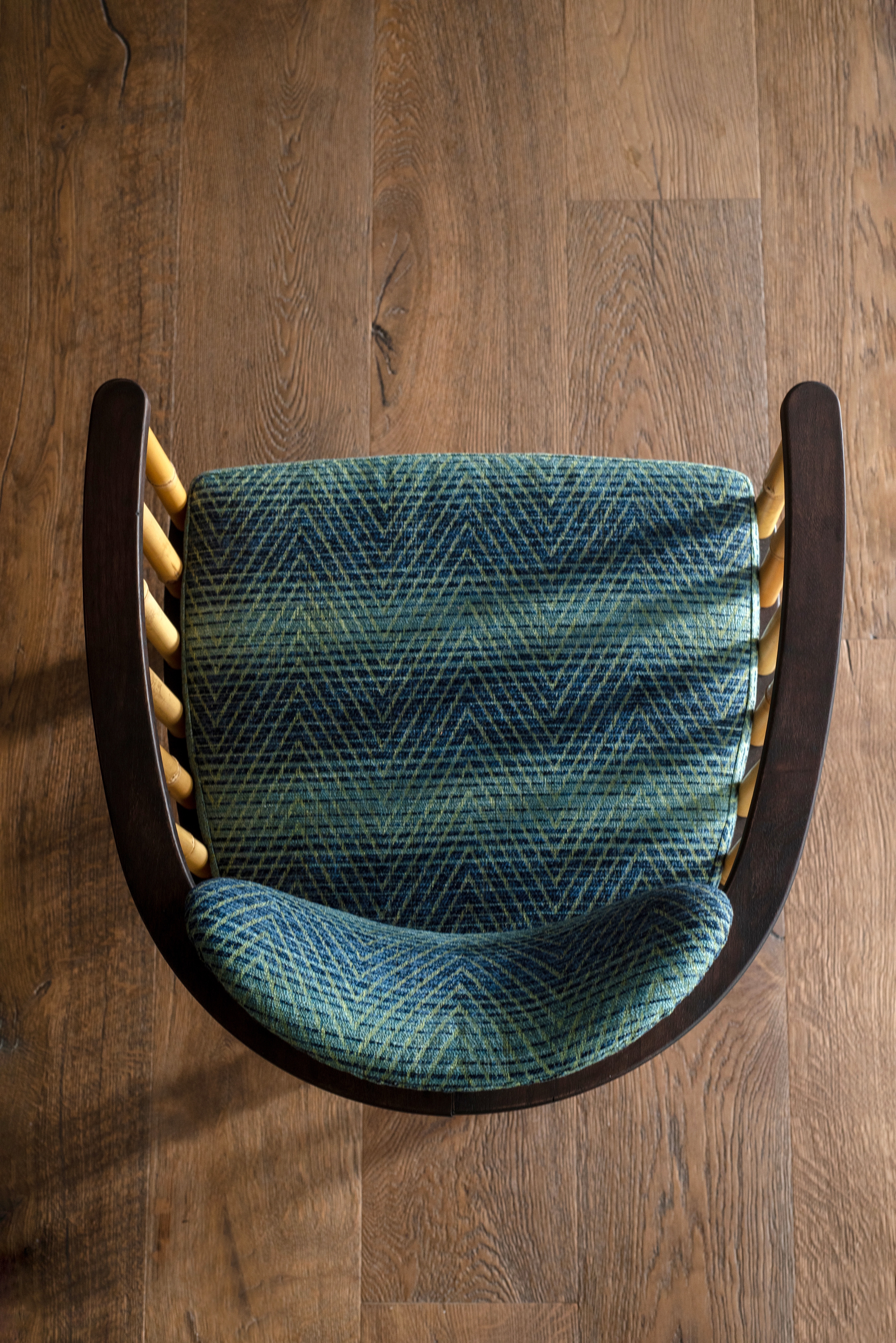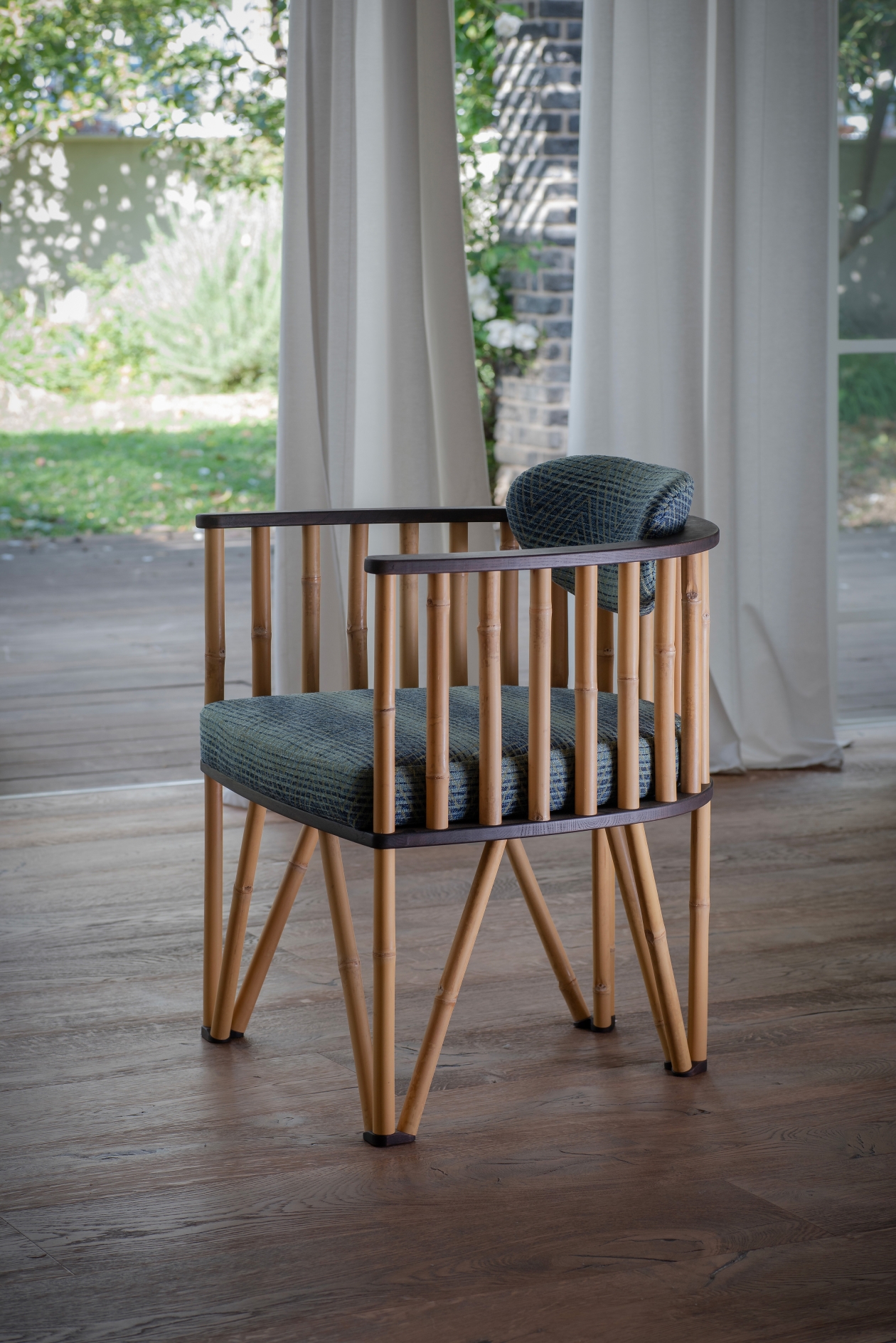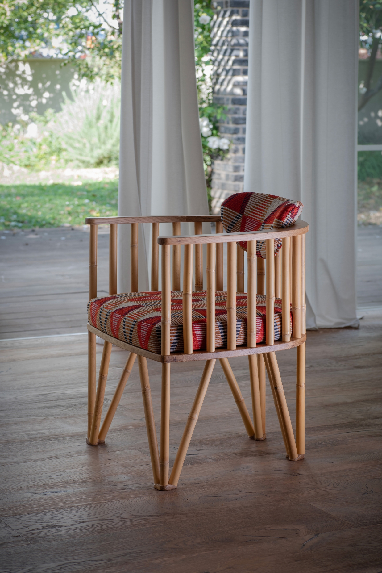 The legs of the chair are made of triangles which provide stability and rigidity without increasing its weight. The upper part of the chair is constructed with a round bamboo and wood frame, which serves as a comfortable armrest. This armrest incorporates a floating backrest, that allow it to adjust itself naturally to the lower back.