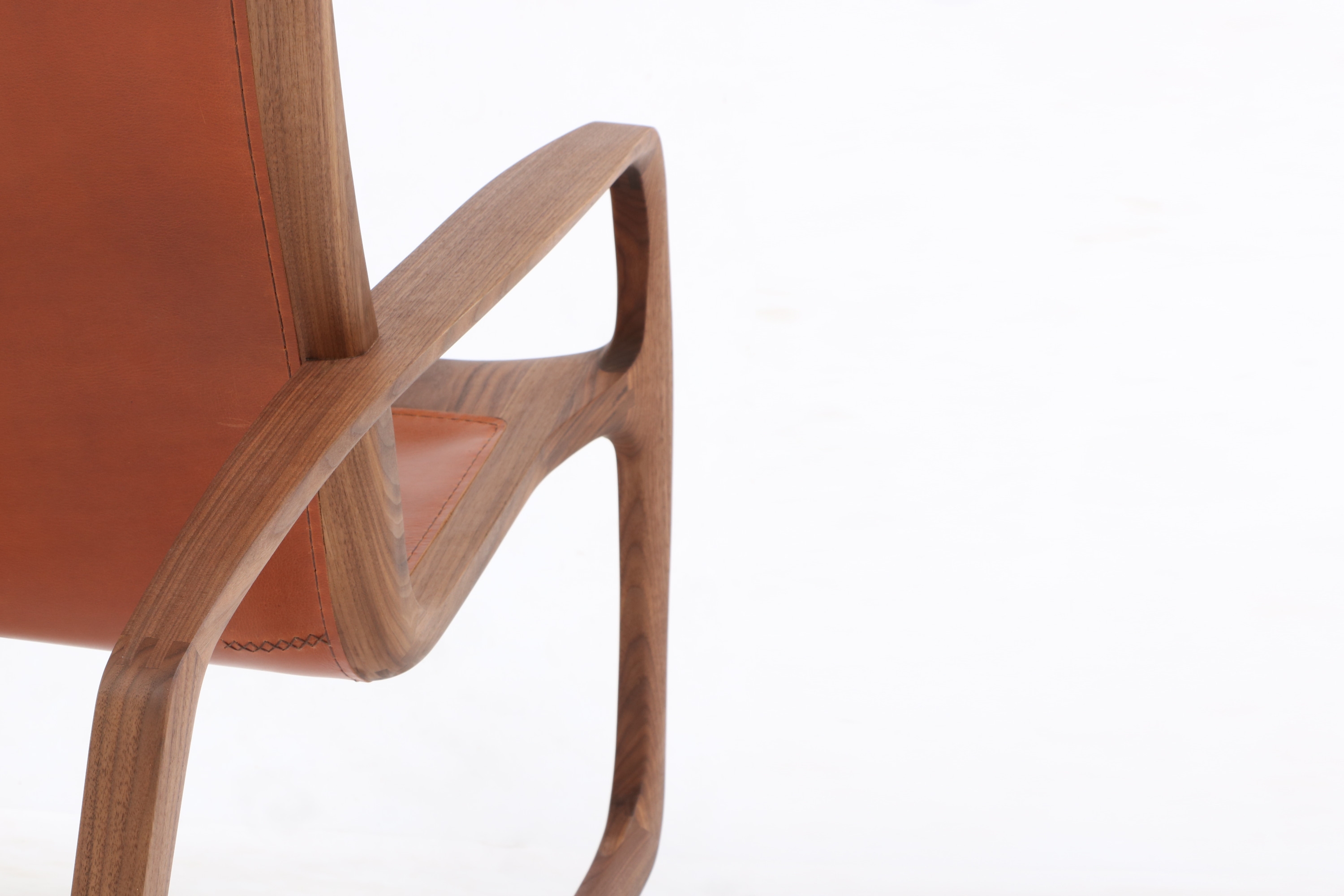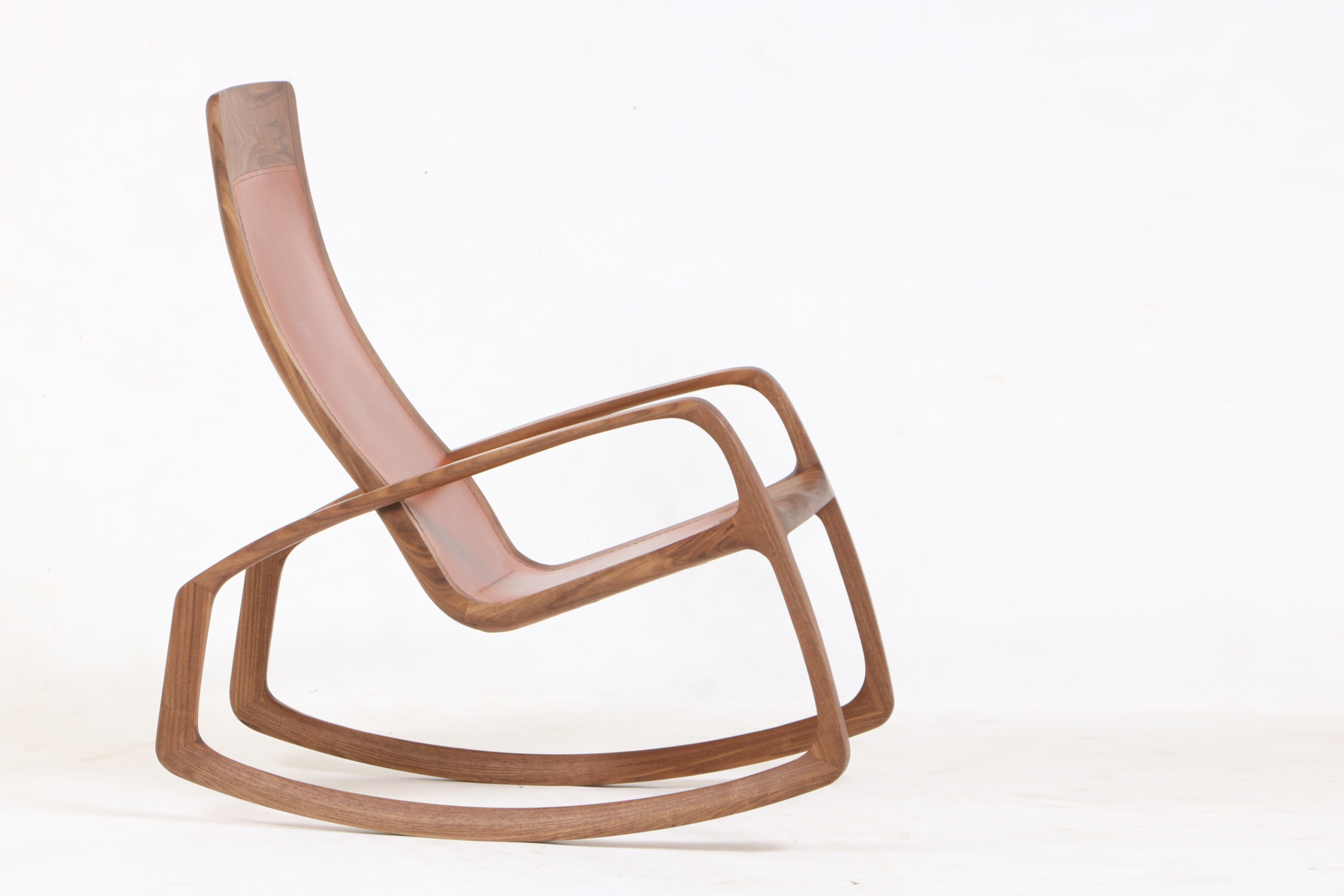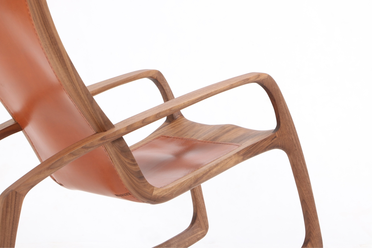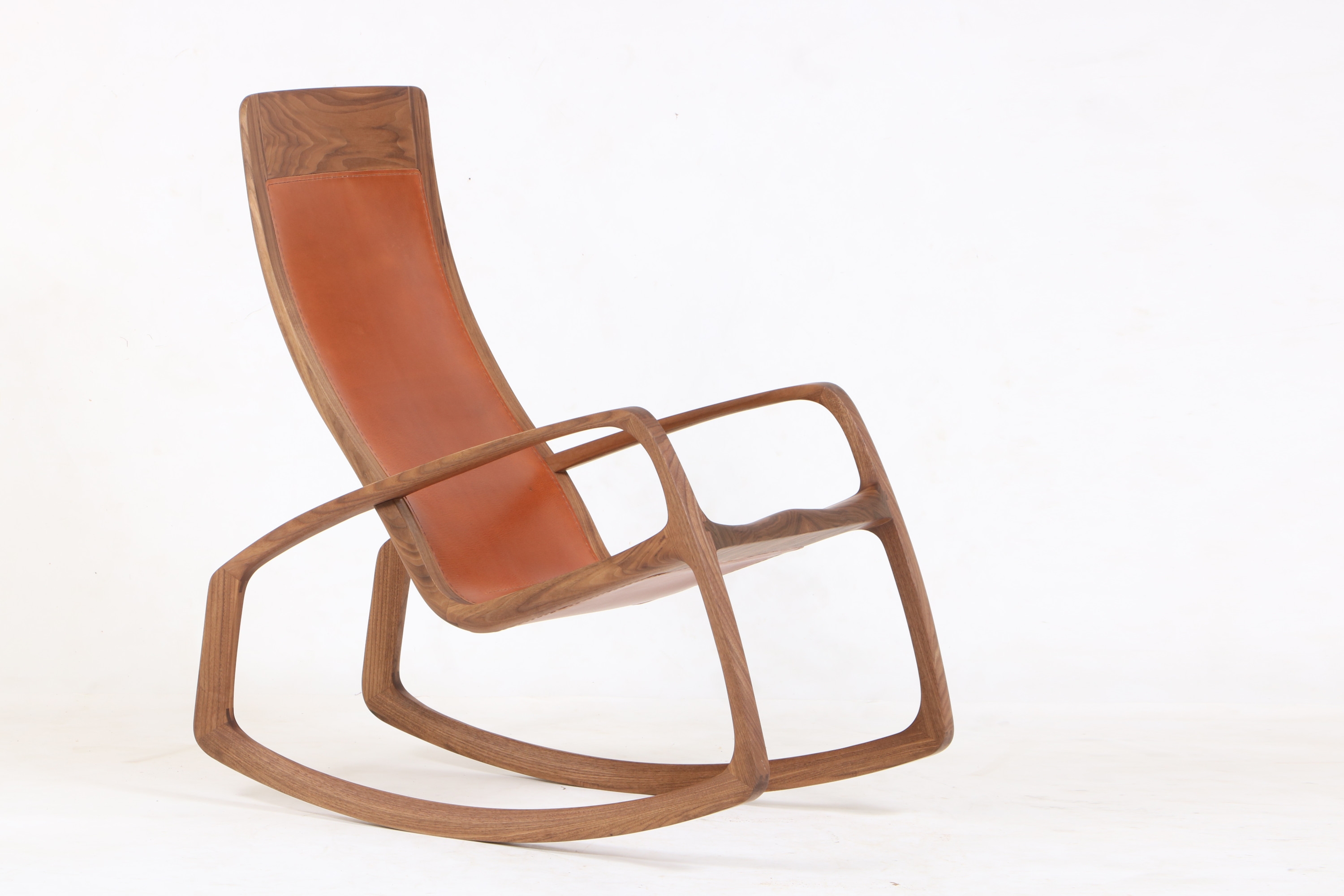 The ergonomically shaped backrest and seat of this rocking chair are made of a frame construction made of solid wood. Both sides of the frame are covered with 3.5 mm thick cowhide, which is sewn by hand. The leather is vegetable tanned and available in many colours. The rocking chair is made entirely by hand from solid wood and can be adjusted to the owner's height.