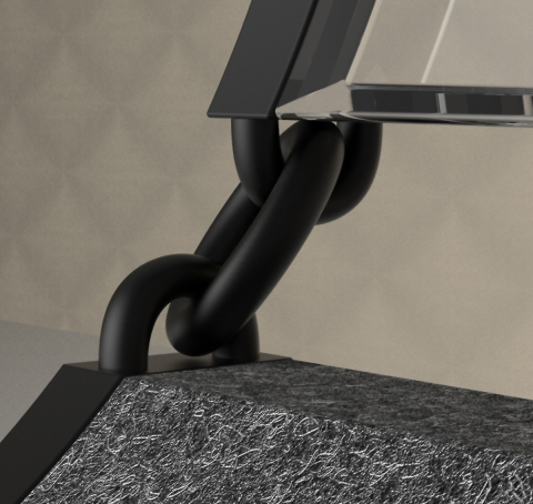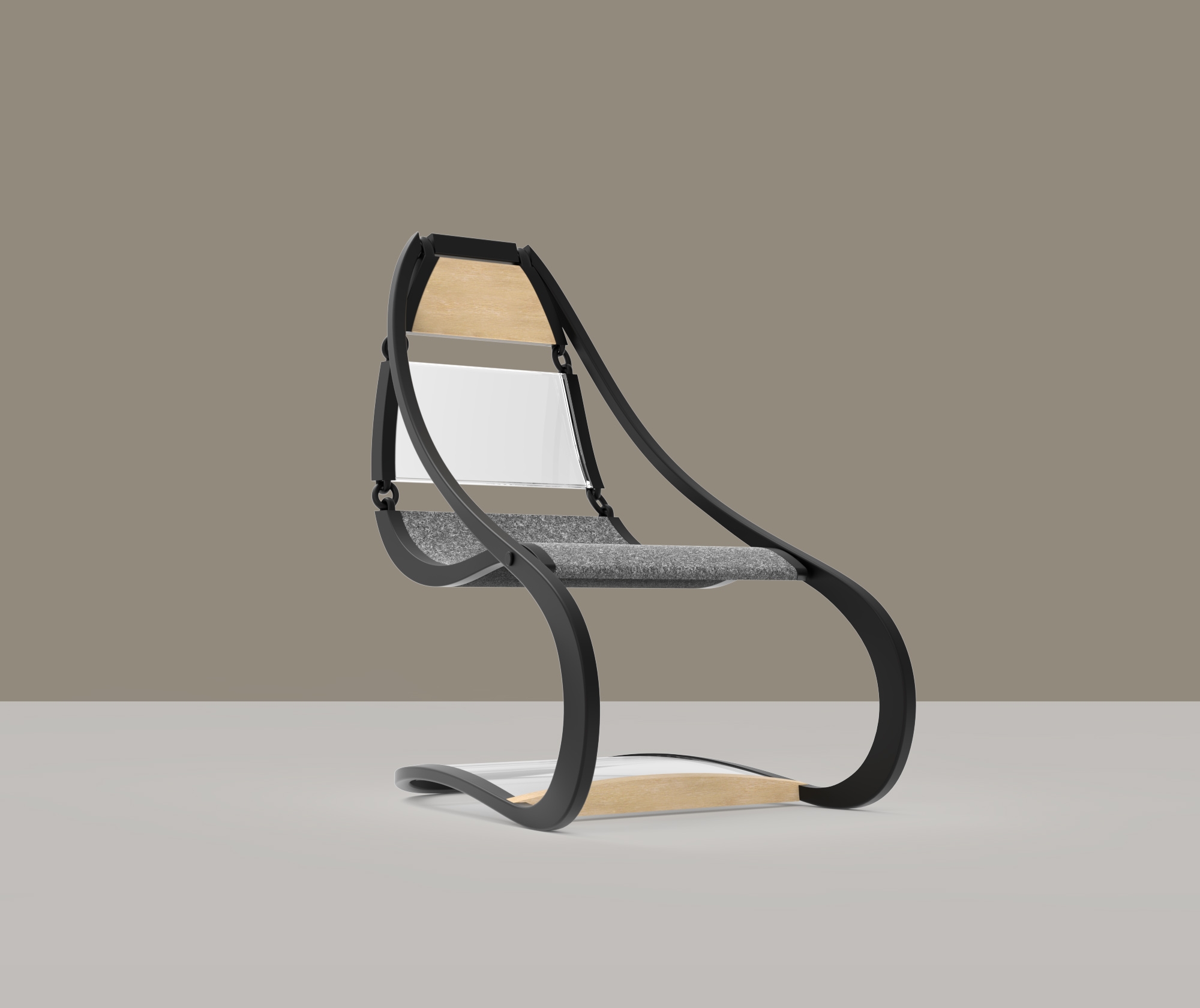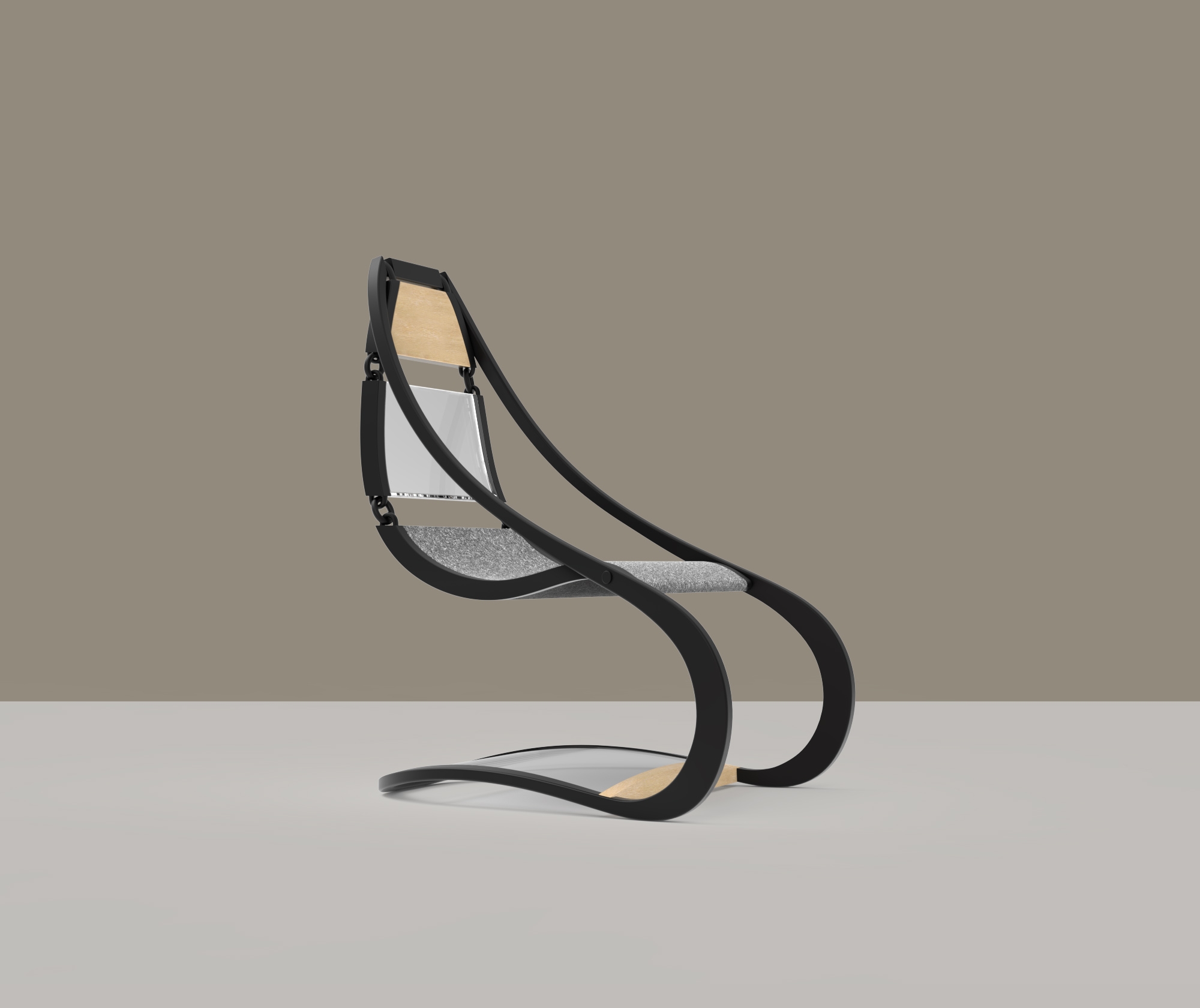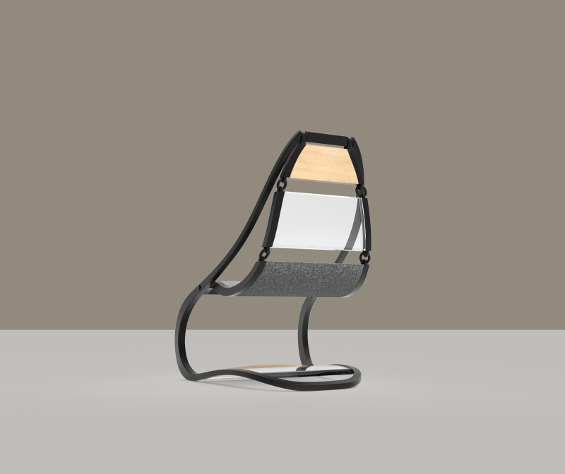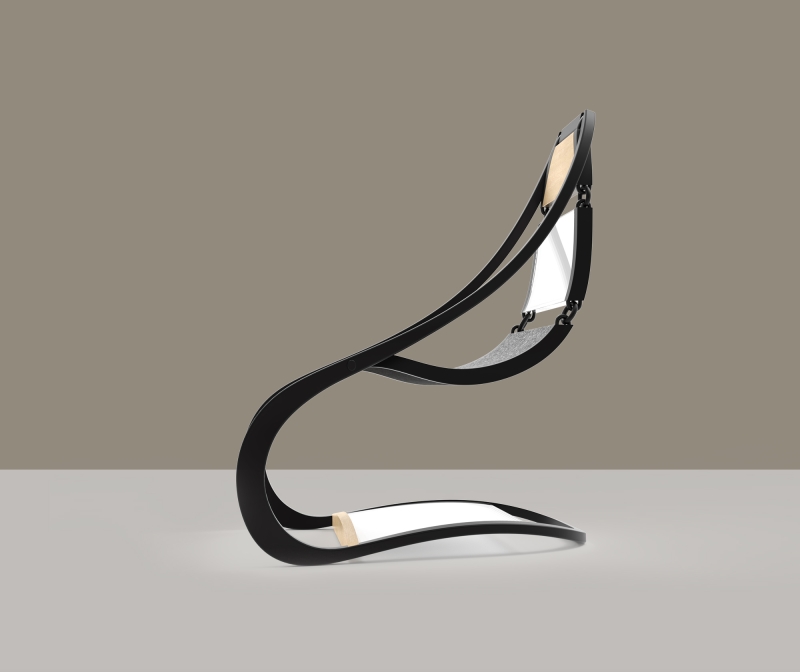This chair's design establishes a captivating tension reminiscent of a suspended bridge between the seat and the frame. Links that connect the seating components create a subtle, swaying motion, adding to the chair's dynamic allure.