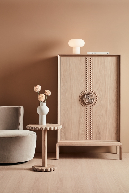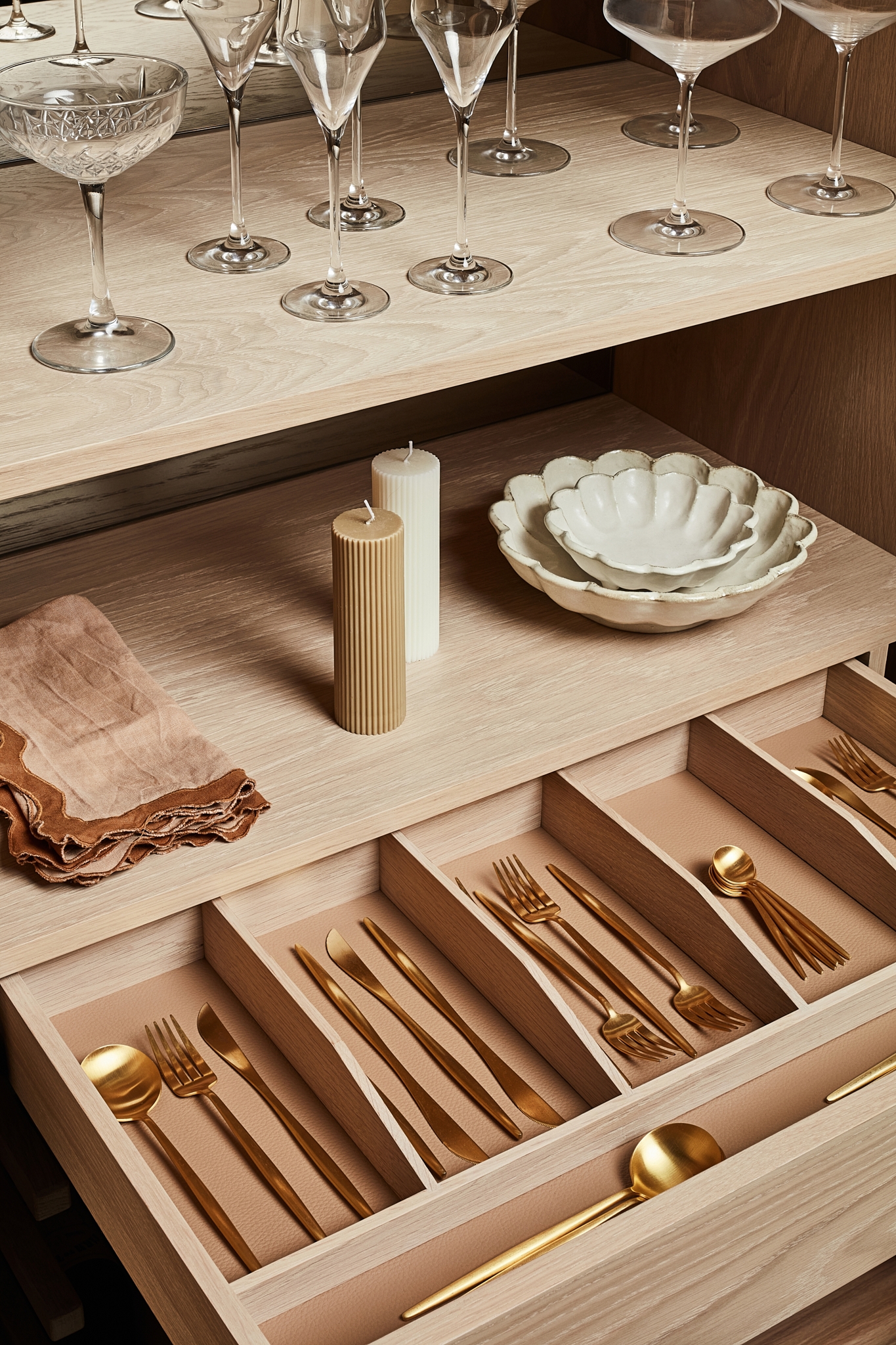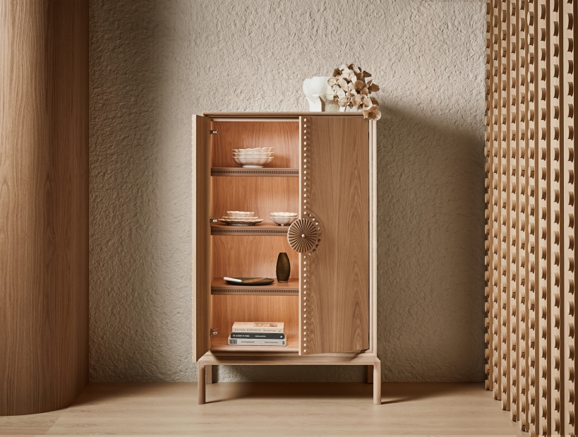 Adorn Marigold Cocktail Cabinet with internal glass and wine storage and pull out lined cutlery drawer. The cabinet is powered with LED strip lighting to illuminate internal shelving and reflected with a bronze mirror backing.