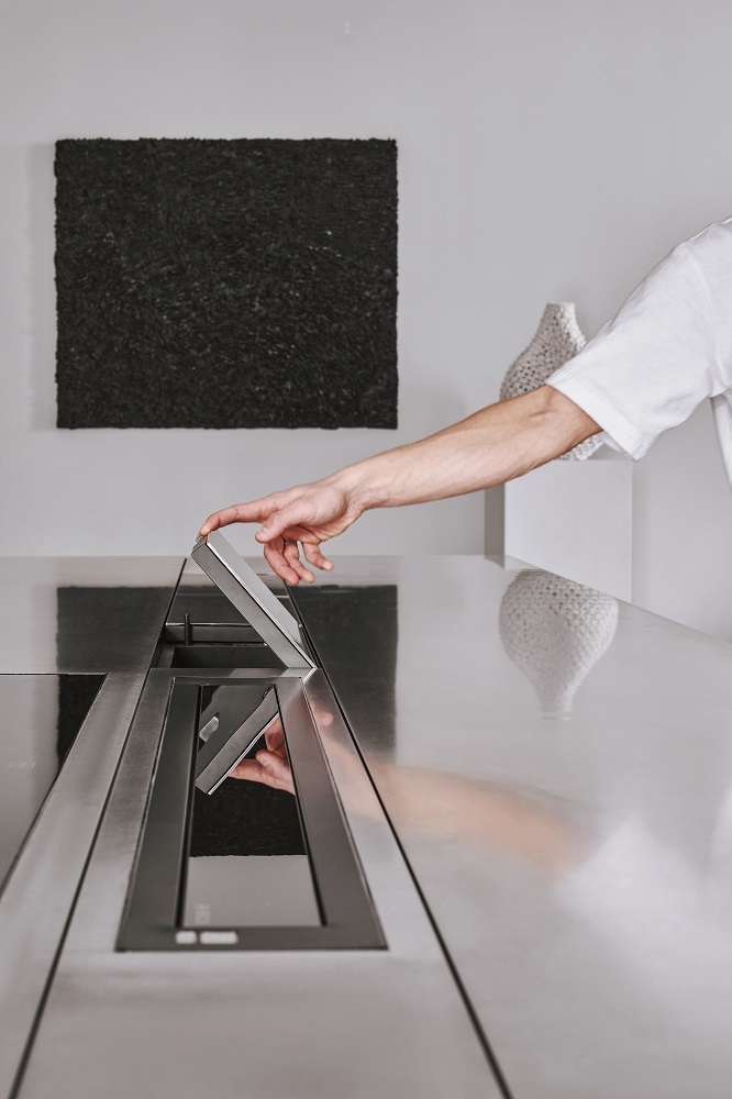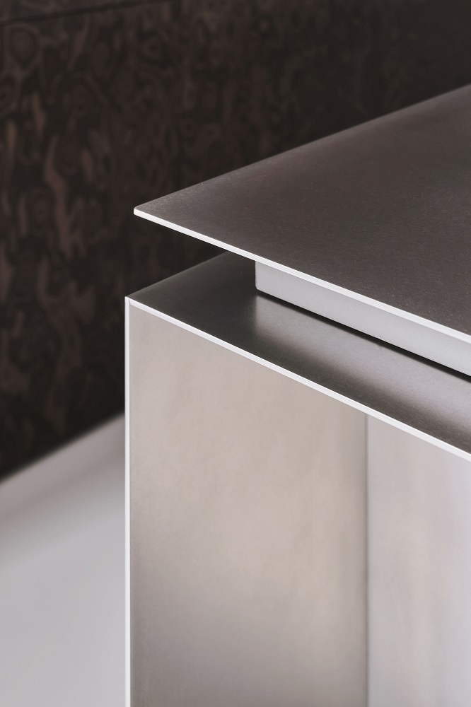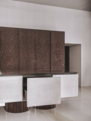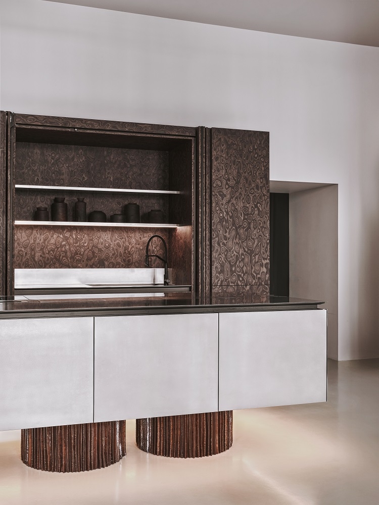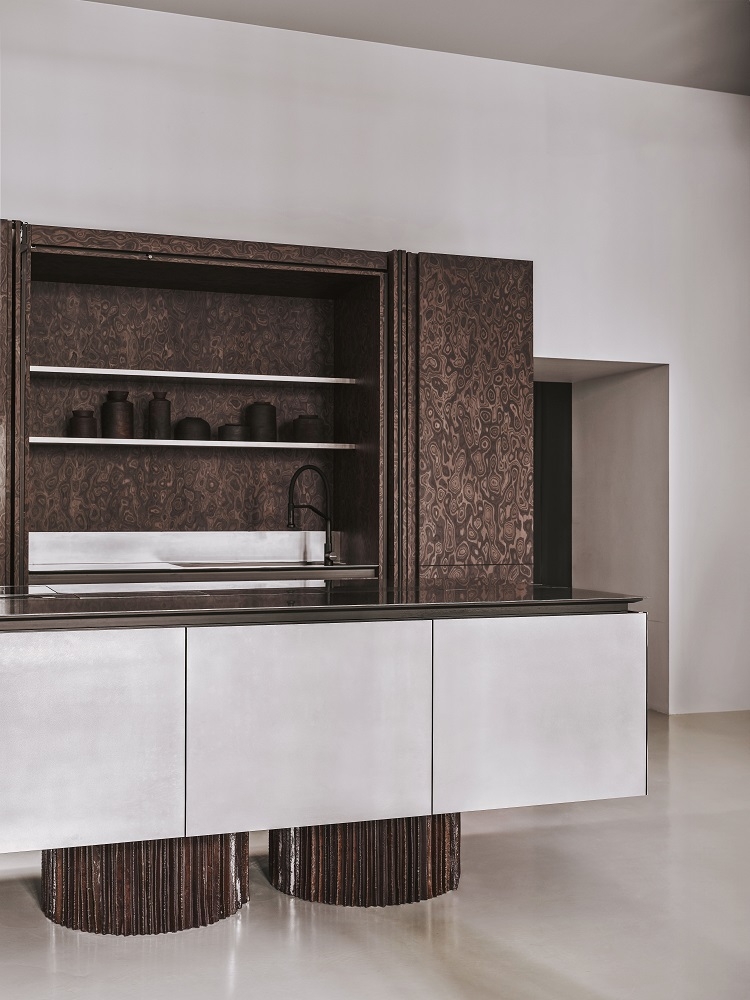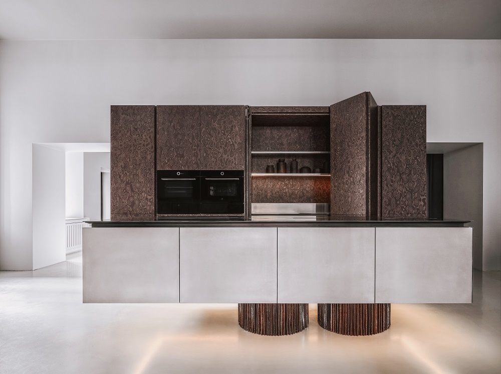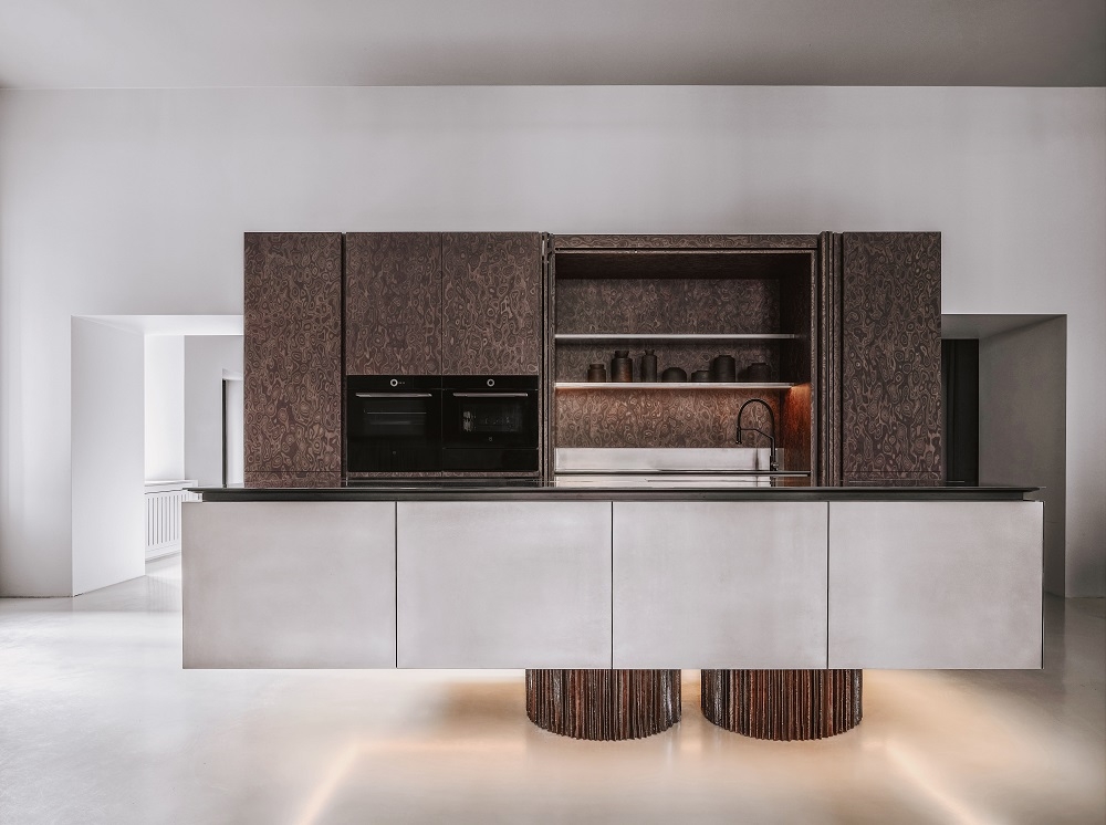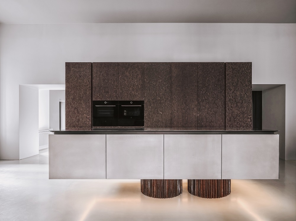 Materials and finishes have been carefully selected: stainless steel is ideal for the kitchen, it is hygienic and wear-resistant; and we used veneer and textured ceramics to contrast with the strictness and coldness.