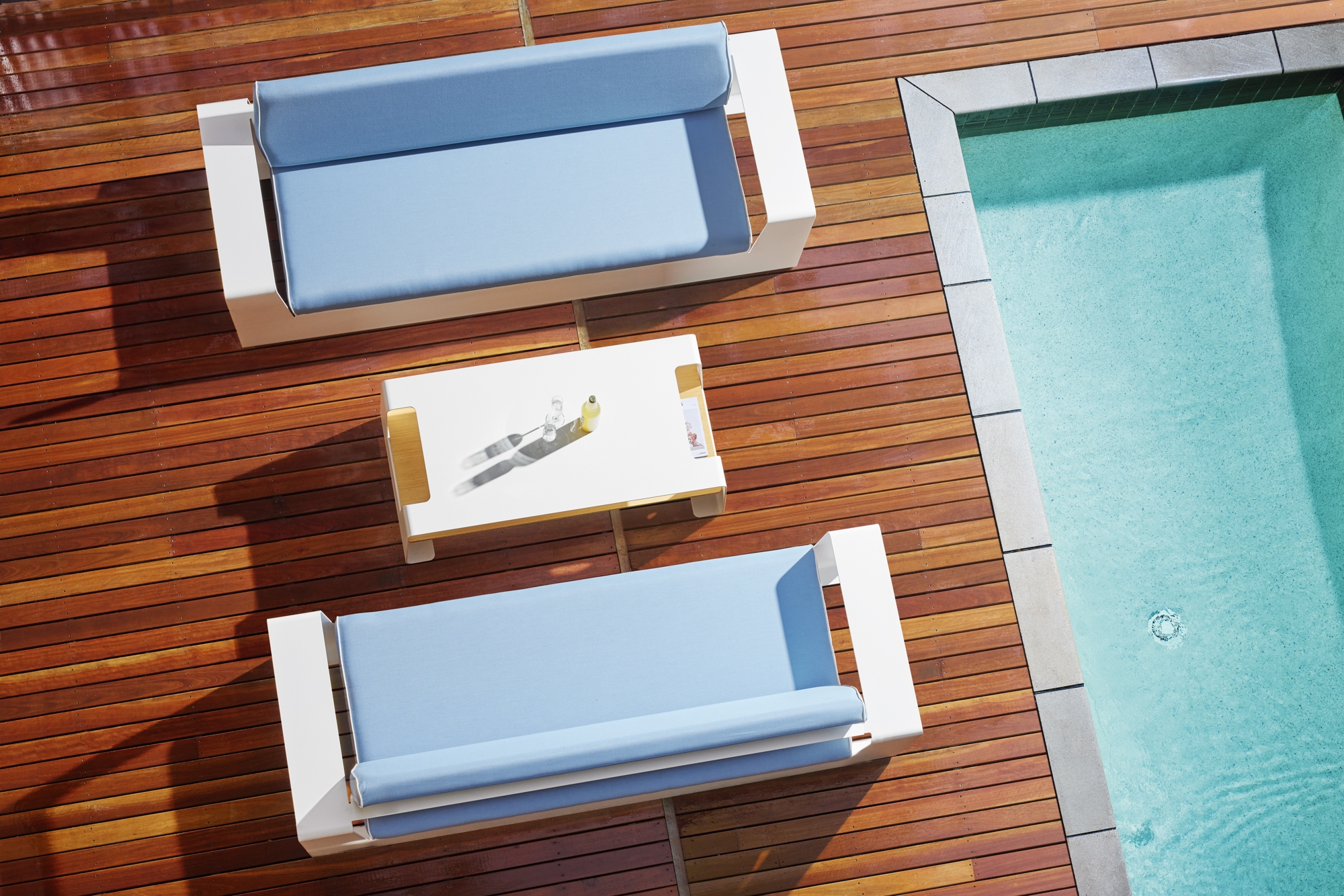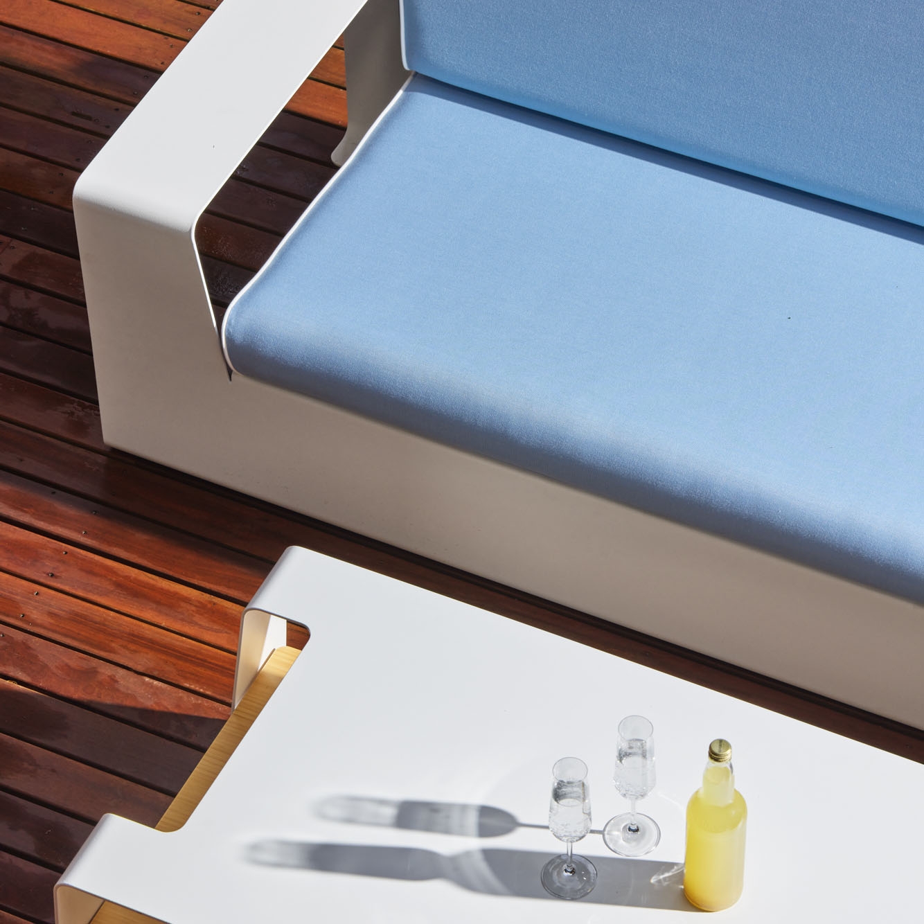 The F + B lounge suite is Designed for multiple outdoor spaces but is especially suitable for pool side patios. Incorporating outdoor UV stable upholstery for ultimate durability and flexibility and showcasing our refined use of sheet metal to create a seamless “one piece” frame design constructed in light weight aluminium making it easy to move around. The suite is designed for ultimate comfort with generous proportions suited to relaxed, laid back lounging.The suite includes a complimentary coffee table.