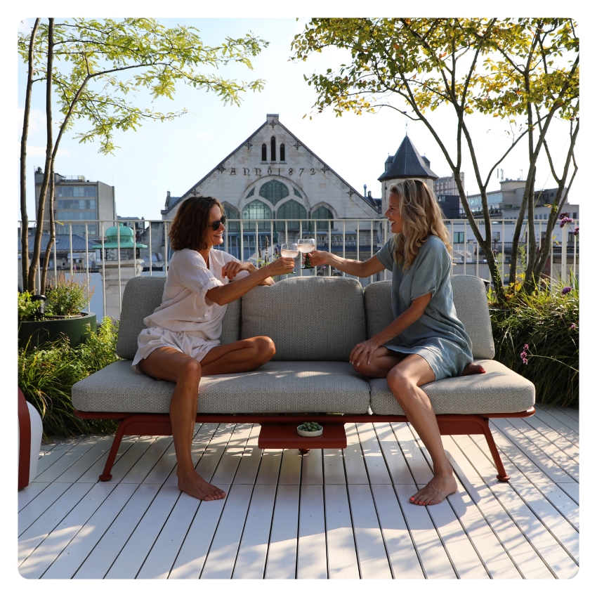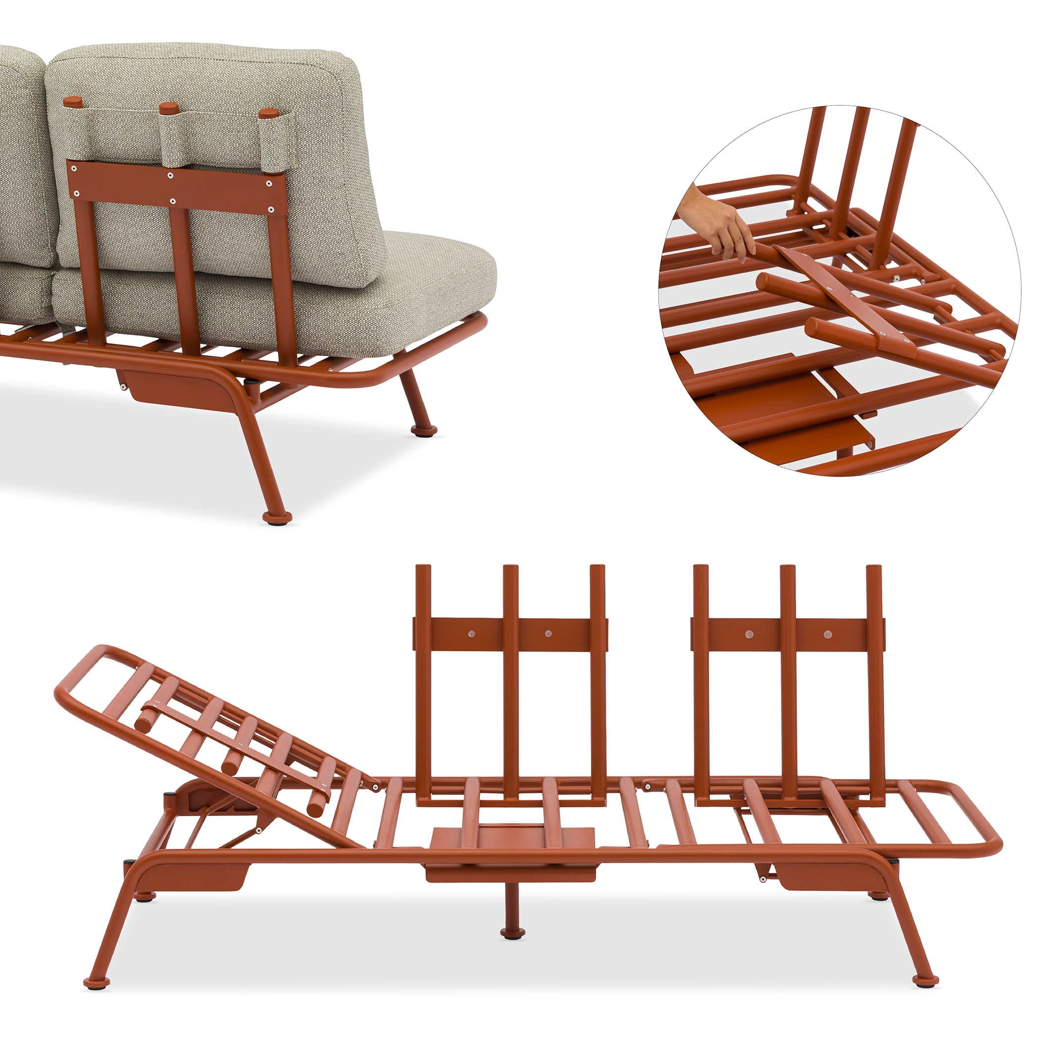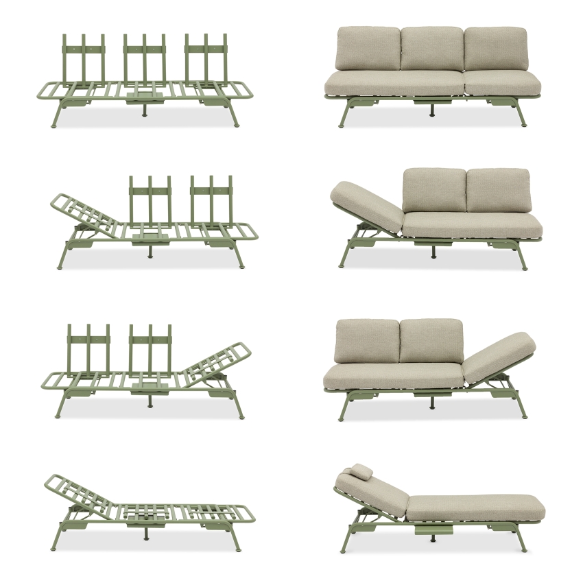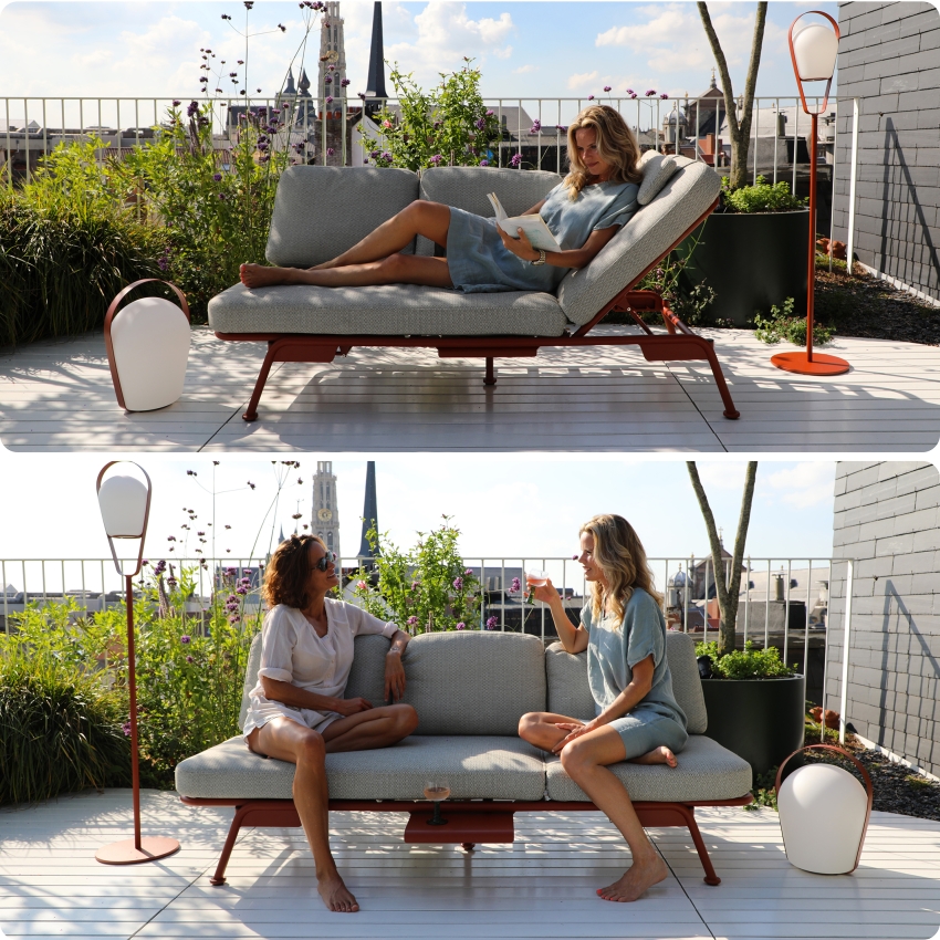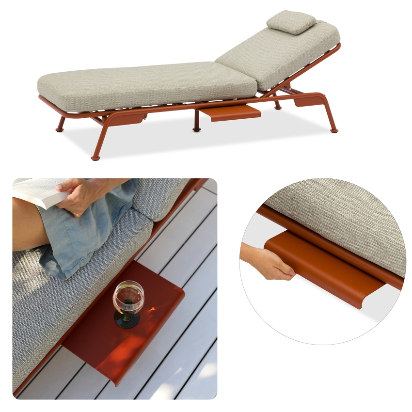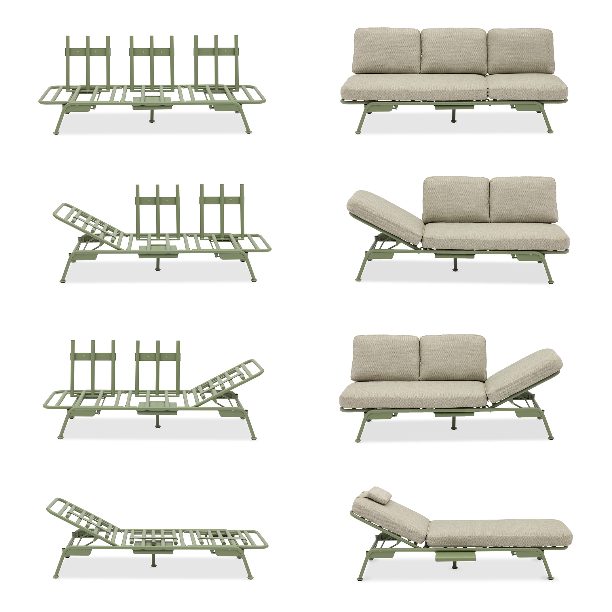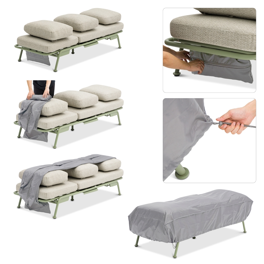 Small outdoor spaces require smart, innovative and functional pieces of furniture. This is exactly what the Sunset Sunlounger stands for. The lounge sofa works double duty, with folding backrests that let you go from sofa seating to a classic sunlounger in just seconds. Ideal for relaxing or enjoying outdoor quality time with friends and family. The Sunset Sunlounger is an innovative and multi-functional piece of outdoor furniture. It can be used as a regular sun lounger and can easily be transformed into a sofa, simply by flipping up the backrests and installing the backrest cushions. No screws or complicated fixations, simply flip up the backrests and enjoy! The aluminum base has a reclining back at both ends so it can easily be used on the LEFT and on the RIGHT side. So, no matter where the sun is, you can always catch some sunshine! No need to rotate your lounger, just enjoy the sunshine during the daytime and use the sofa with friends and family at night. Attached underneath the frame is a nicely crafted bag that you can easily transform into a full nylon raincover.No need to take the cushions indoor when it rains, simply open the zipper and pull out the rain cover.