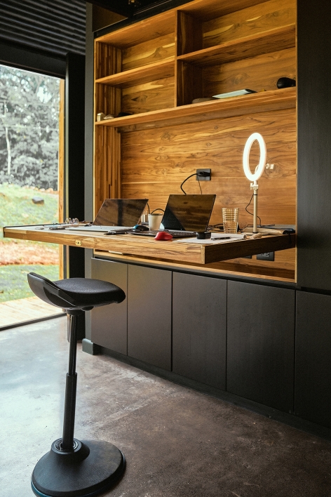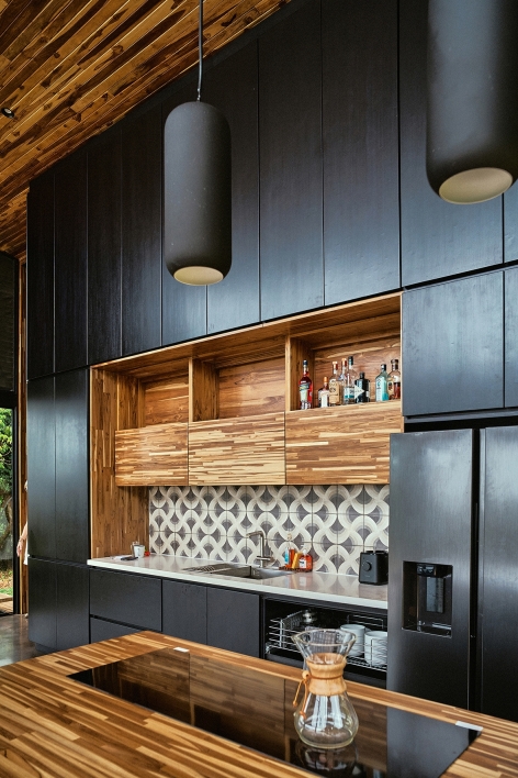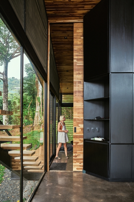 The Black House is located along the southern Pacific coast of Costa Rica. It has been developed as a new prototype for the modular No Footprint House series (NFH). The climate-responsive design of the NFH variations is based on passive strategies such as site-specific positioning and the use of natural resources for cross ventilation, solar shading and energy production, as well as rainwater harvesting and biological water filtration. Industrial building techniques and prefabricated components are used to create a high level of efficiency that can be delivered to any target location. Since the creation of the multi-award winning first prototype of the NFH, new and alternative construction materials have been developed and integrated to continuously lower the environmental impact of the overall project while stimulating local and circular economies. The Black House was designed as a three-level typology with steel structure and wooden finishes, providing the spaces for its owners to live and work in one compact unit. Operable facade elements open the building interiors towards their natural surroundings, resulting in a symbiotic relationship among nature and the built environment.