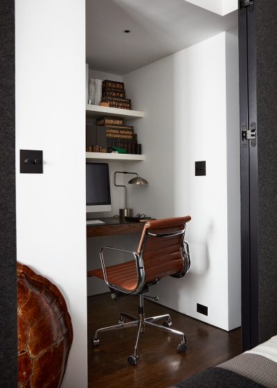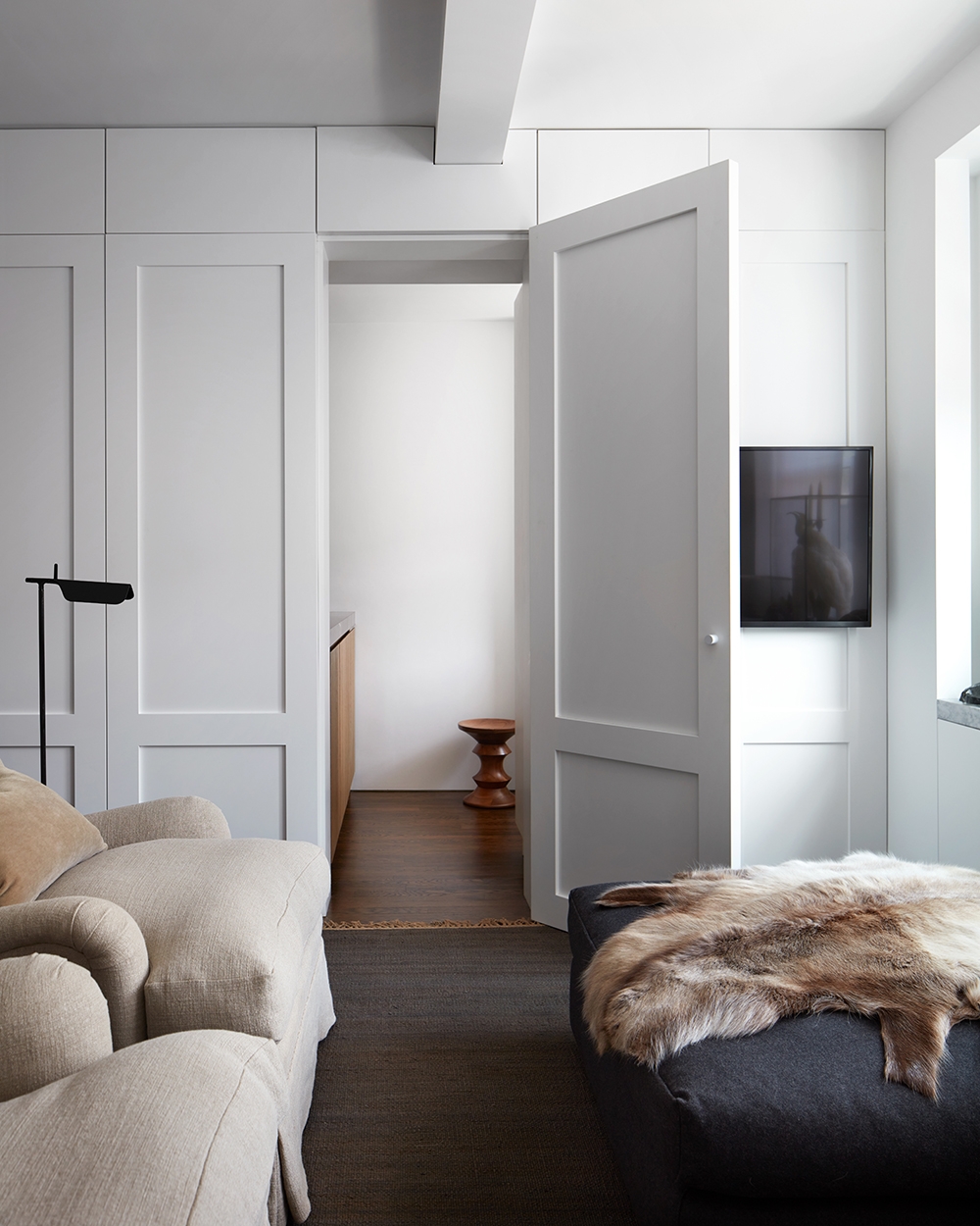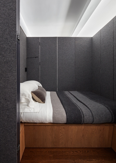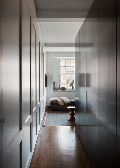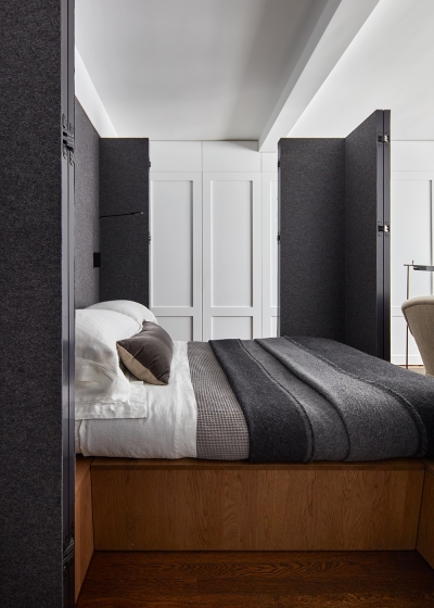 The design scheme represents a variation and refinement of our earlier jewel box studio apartment project, in which the bed chamber is articulated as an independent volume floating within what would otherwise be an open, undifferentiated space. Here, the freestanding sleep pavilion, which opens out to the apartment on three sides, is finished in matte-gray lacquer on the outside, and swathed in gray felt on the interior. The taut, minimalist lines of the bed chamber play against the apartment’s original oak floors and the more traditional paneled walls we installed to conceal storage, creating a subtle tension between history and modernity.