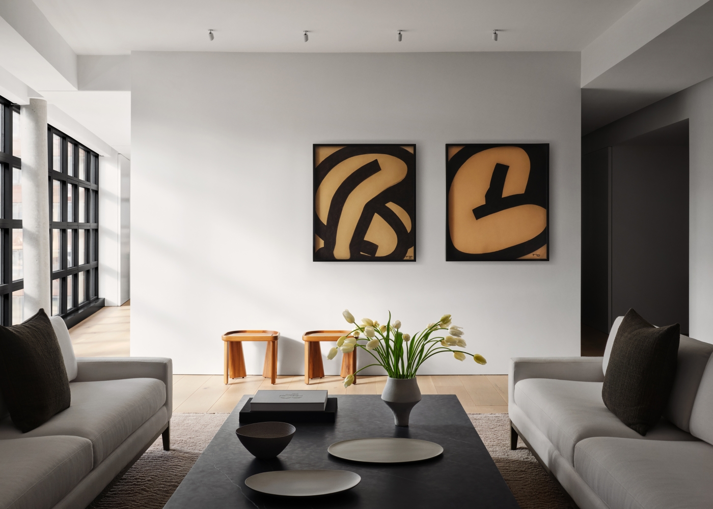 With a striking correlation to its industrial neighborhood, this Manhattan condominium radiates a calm energy in the midst of a vibrant tableau. The open plan makes the apartment initially appear as one sweeping expanse, with a wall of windows on the south that floods the interior with sunlight. In actuality, the interior features clearly distinct but interrelated zones, each with its own particular views. An oval-shaped, open corridor unites the spaces, eliminating any dead ends and giving the residence an uninterrupted flow.