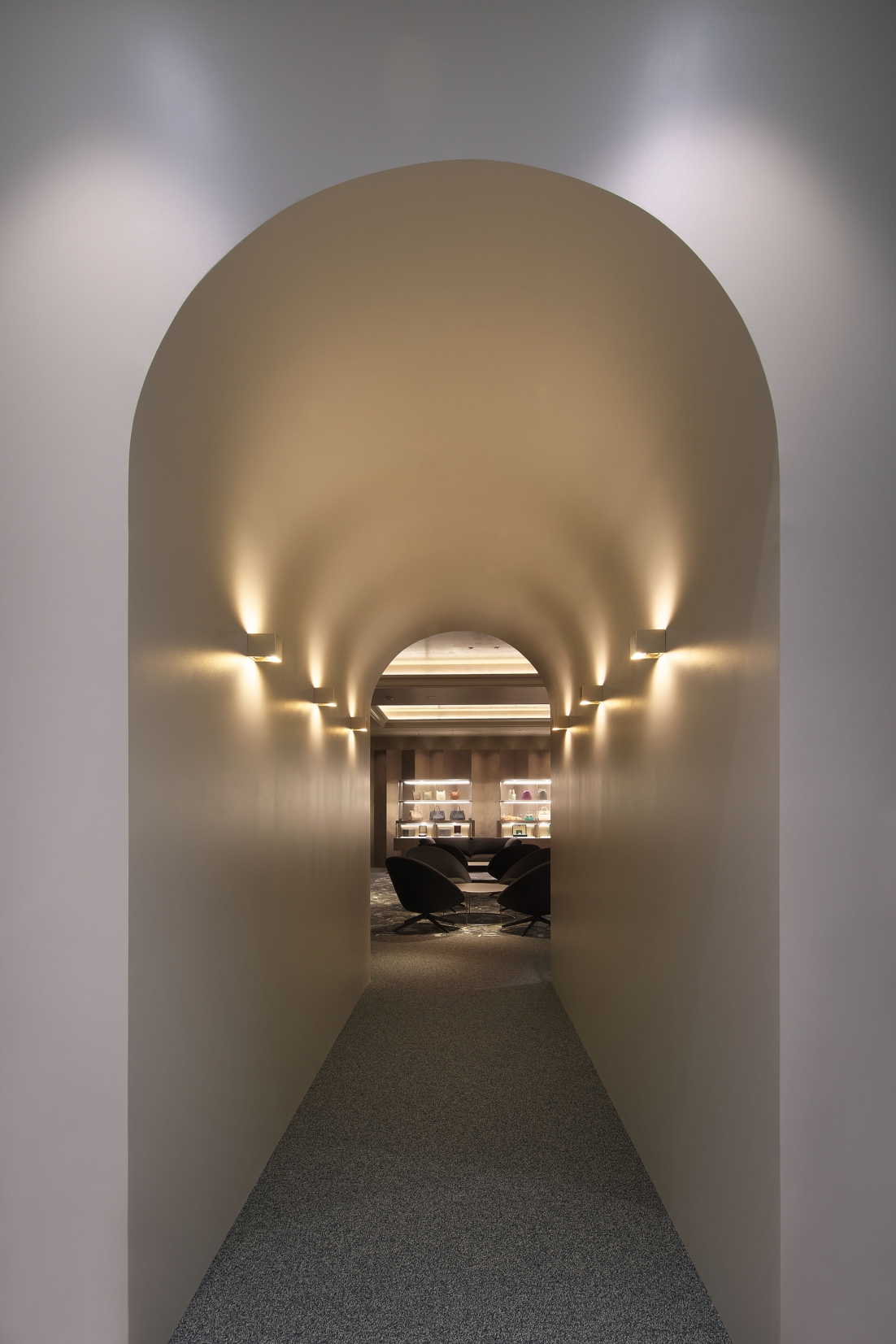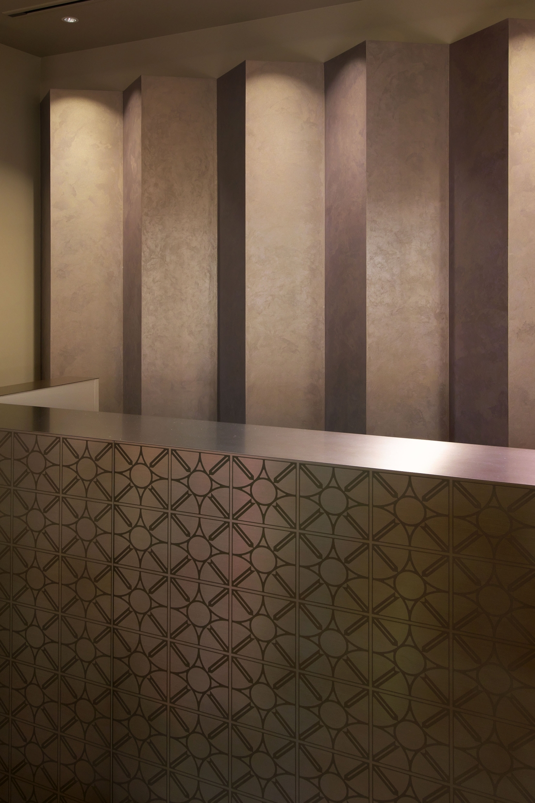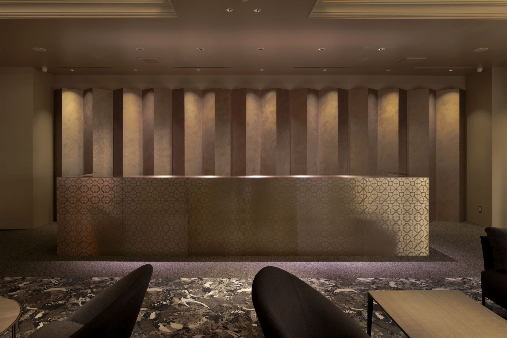 A wall is decorated in the form of folding screen in this Western-style room with subdued illumination. Pearlescent pigment is applied on the orderly folded accordion surface. A pattered design is drawn on top of it by hand work, adding warmth and shade of light. The same pearlescent pigment is similarly applied to the coved ceiling, adding depth to the ceiling height by creating contrasting intensity of the reflected light.