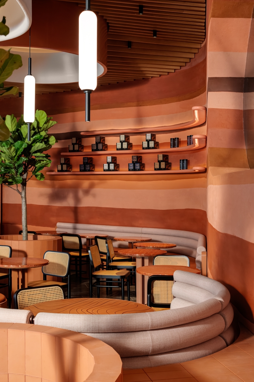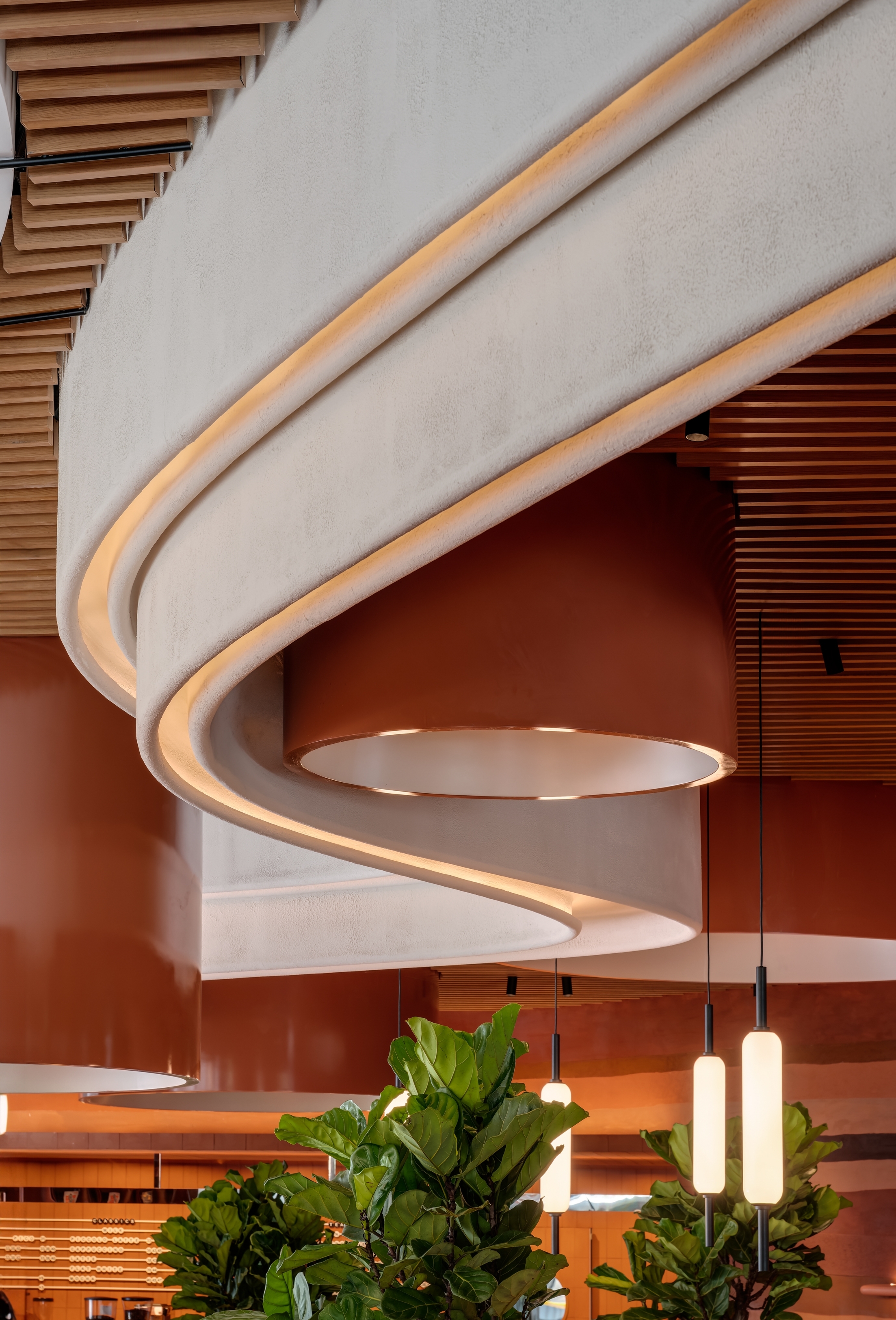 The design features scheme whose colours and form were inspired by coffee origins and the topography of those locations. Coffee is sourced from across the globe and is grown in vastly different topographic and environmental conditions. Metagram carefully sculpted the layout and key architectural features as dramatic curved objects synchronised with the challenging shape of the site. The outcome was a richly textural and dynamic cafe environment, with form perfectly tied into its curved context and distinct enough to highlight the Alchemy brand. The design successfully navigated extremely complicated geometry and external input, whilst complementing context and creating a successful brand and dining experience.