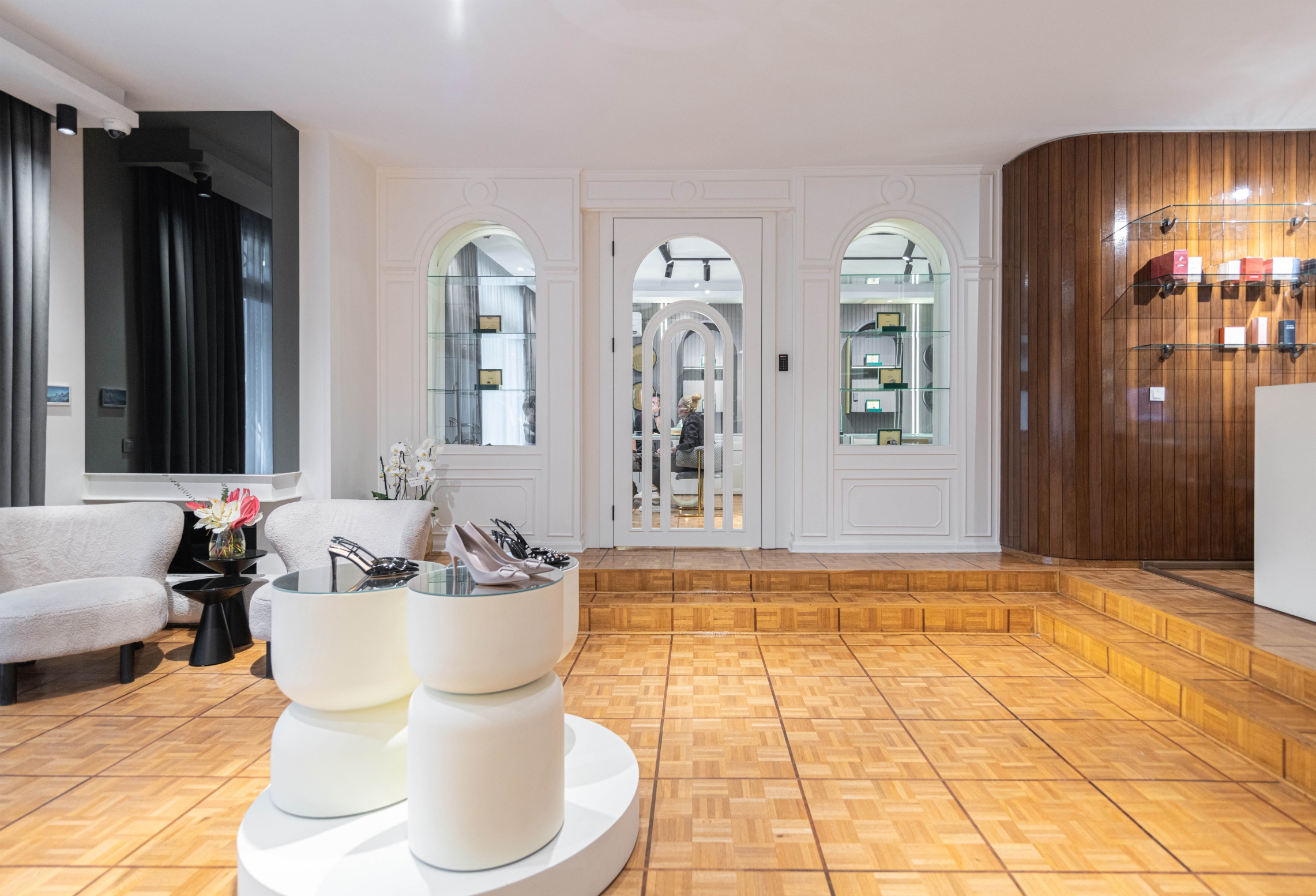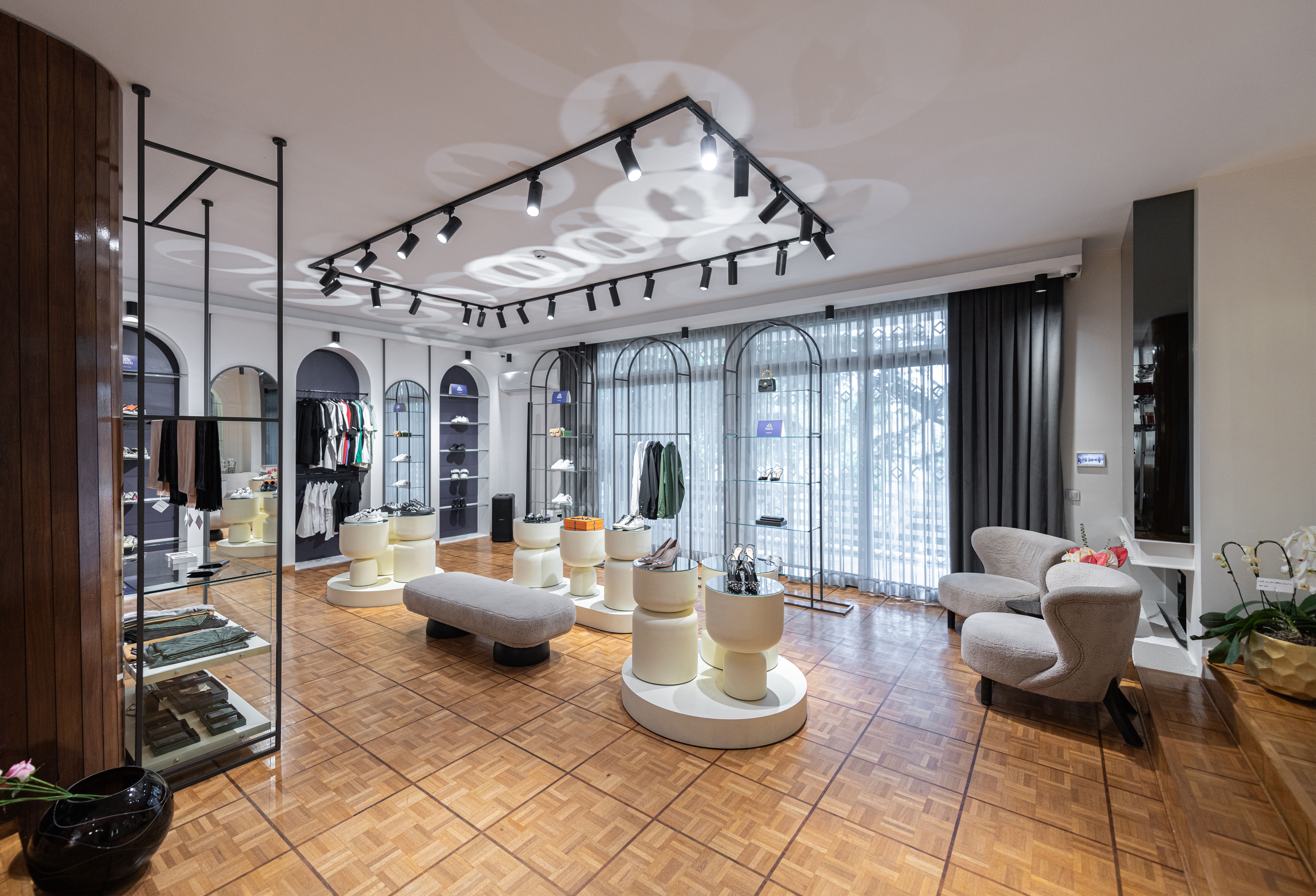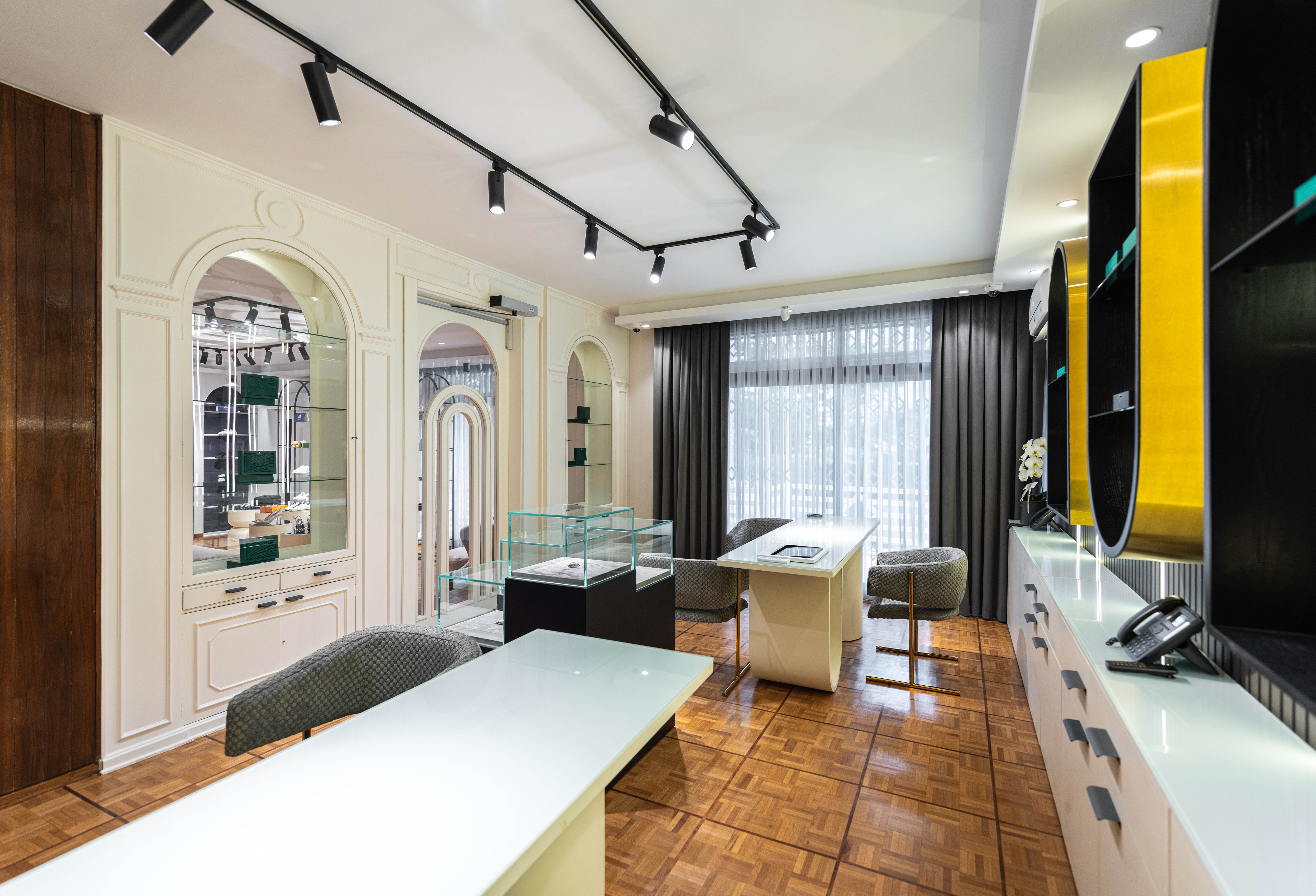 Porch is a multifunction building which makes it an attractive and challenging project for us, the organizational colors of this brand are blue and grey, so these colors are vividly implemented in the design. Porch is a three stories villa house that has multifunctional working spaces of different sectors. Engineering, design, manufacturing of furniture, installation and etc. have been executed within 6 months. All the furniture and wooden objects and segments of this project have been personalized by using curved lines to harmonize with the old structure of this magnificent building. Enclosed are pictures of the sales gallery, trading room, watch and jeweler room, hallway and management room respectively.