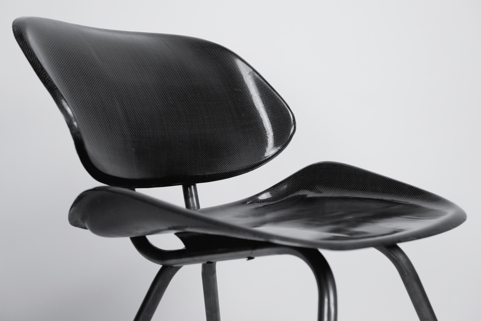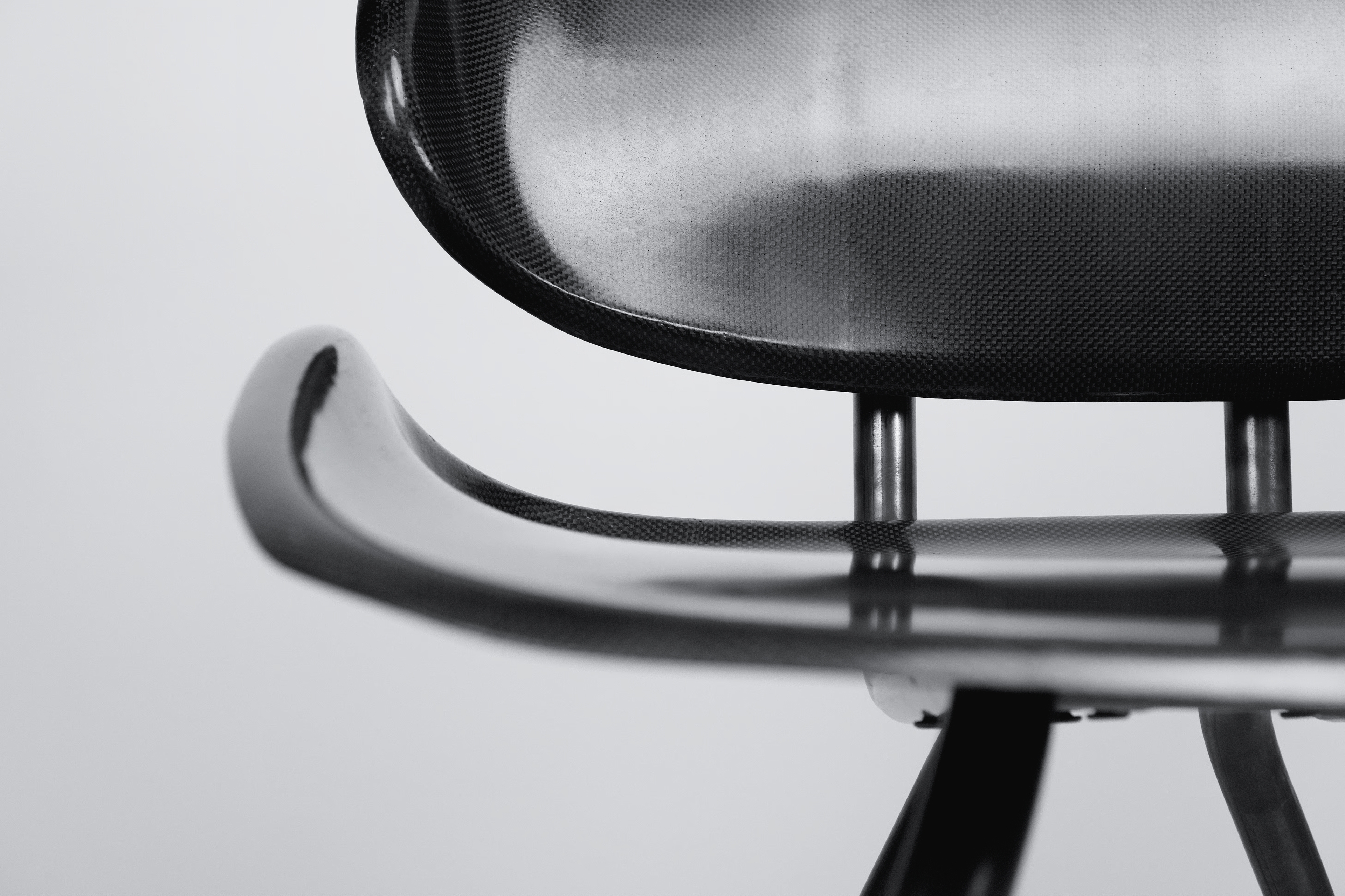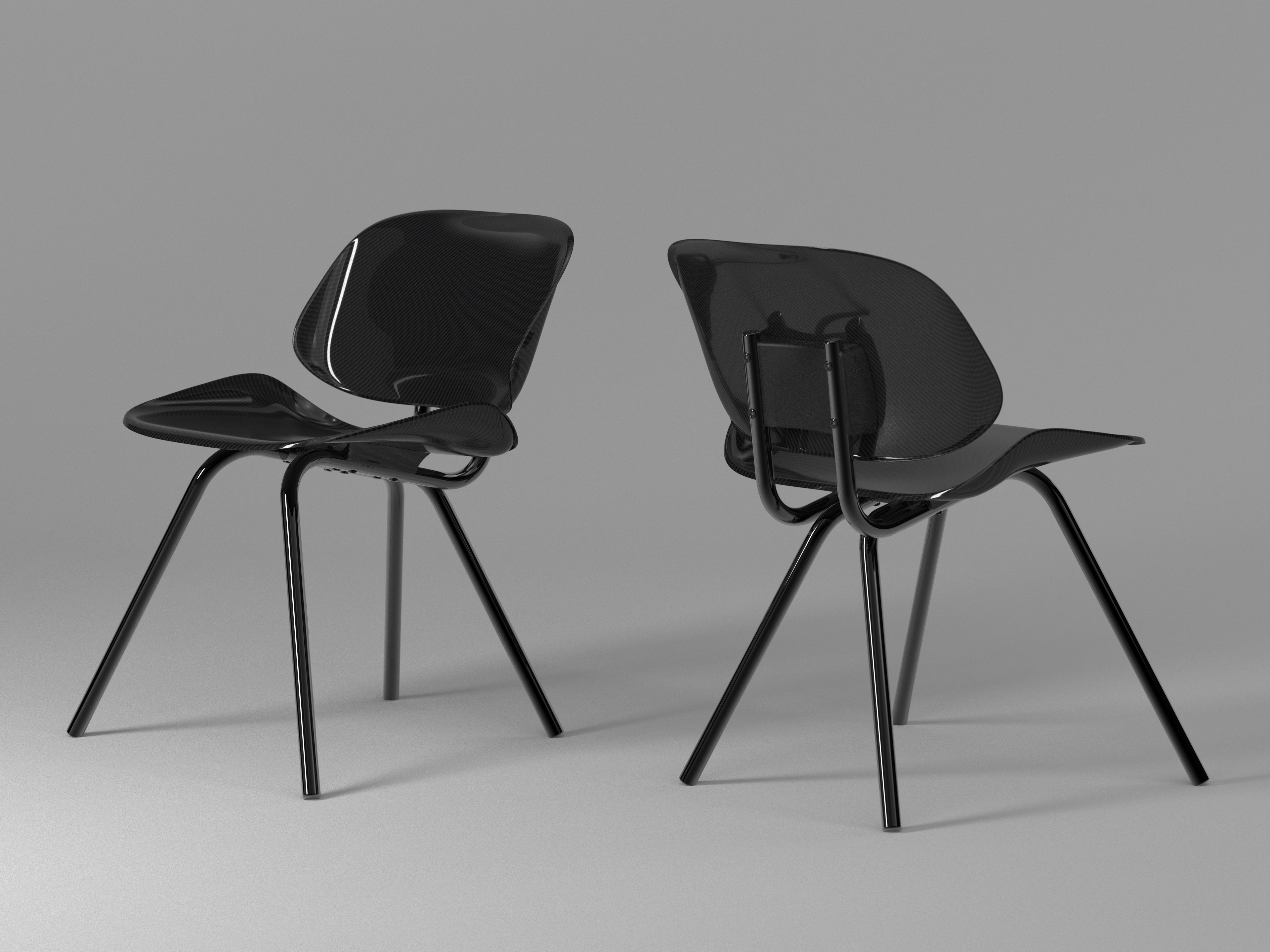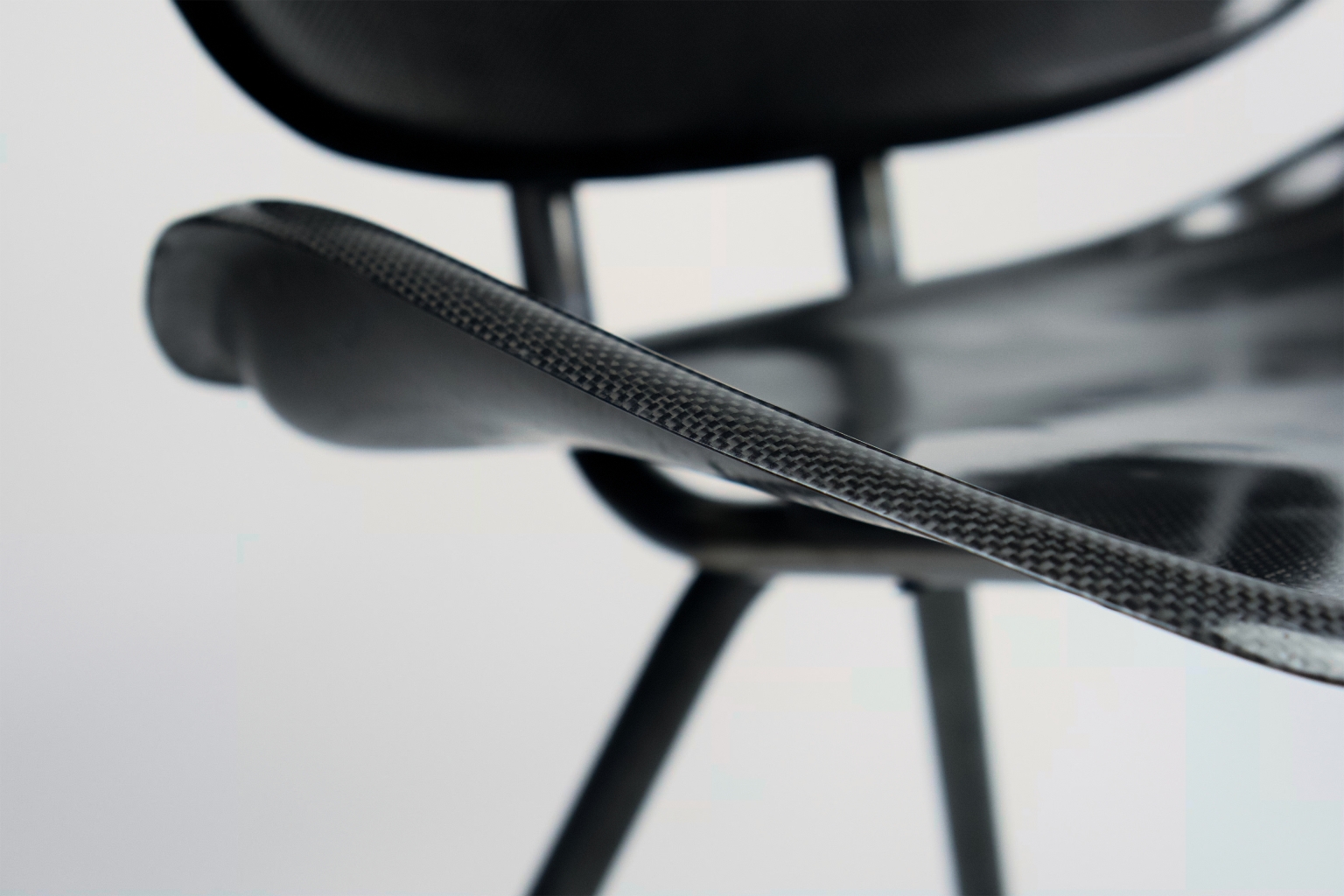 Intanso is a sleek and lightweight side chair designed to stand out with its unique material choice and form. The chair's striking silhouette is the result of a custom-molded carbon fiber seat and back, chosen for its high strength-to-weight ratio allowing for a slim profile with the necessary strength. This material was selected not only for its physical properties but also for its aerodynamic visuals.