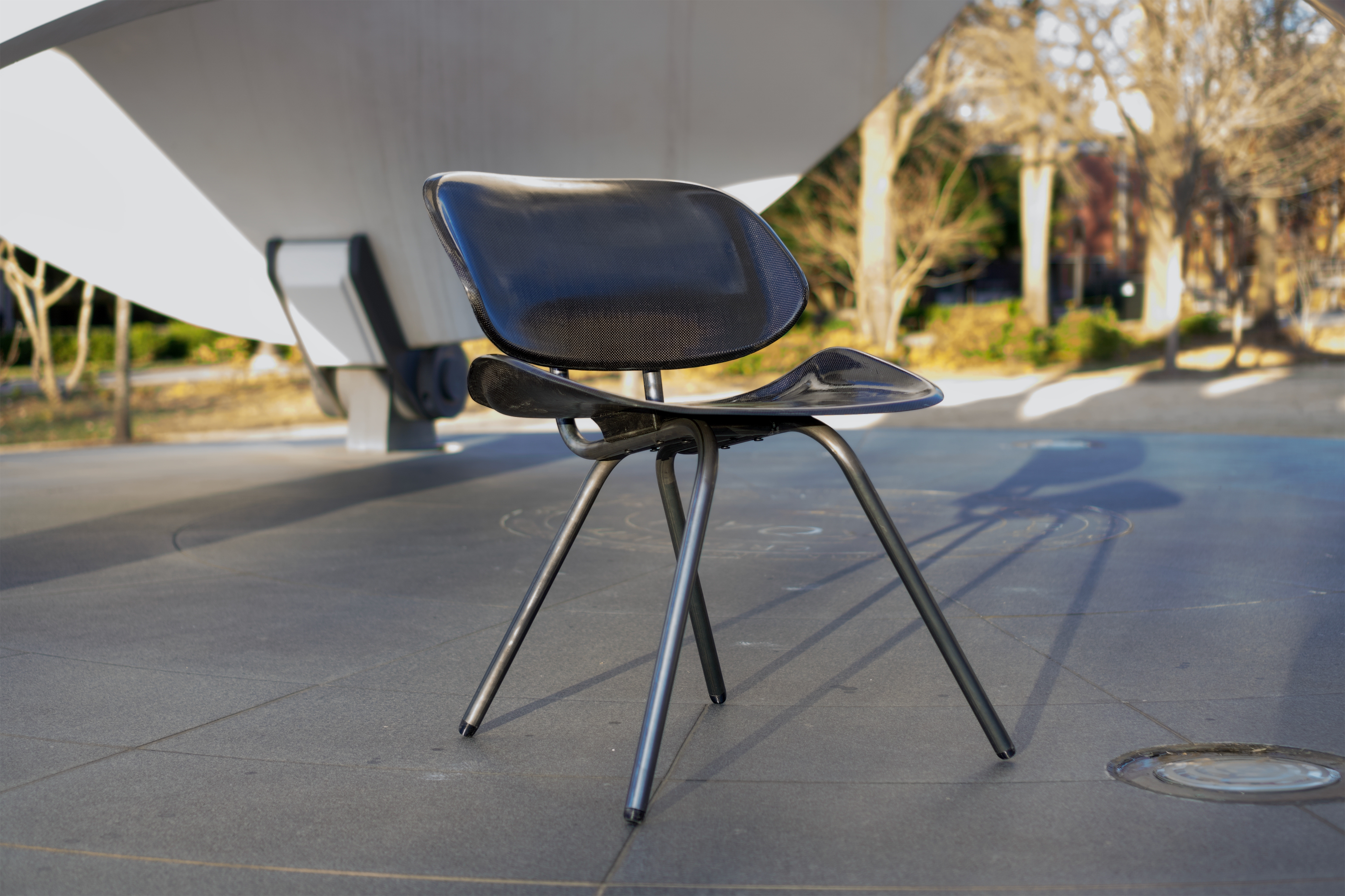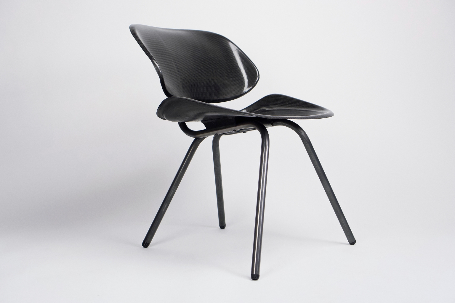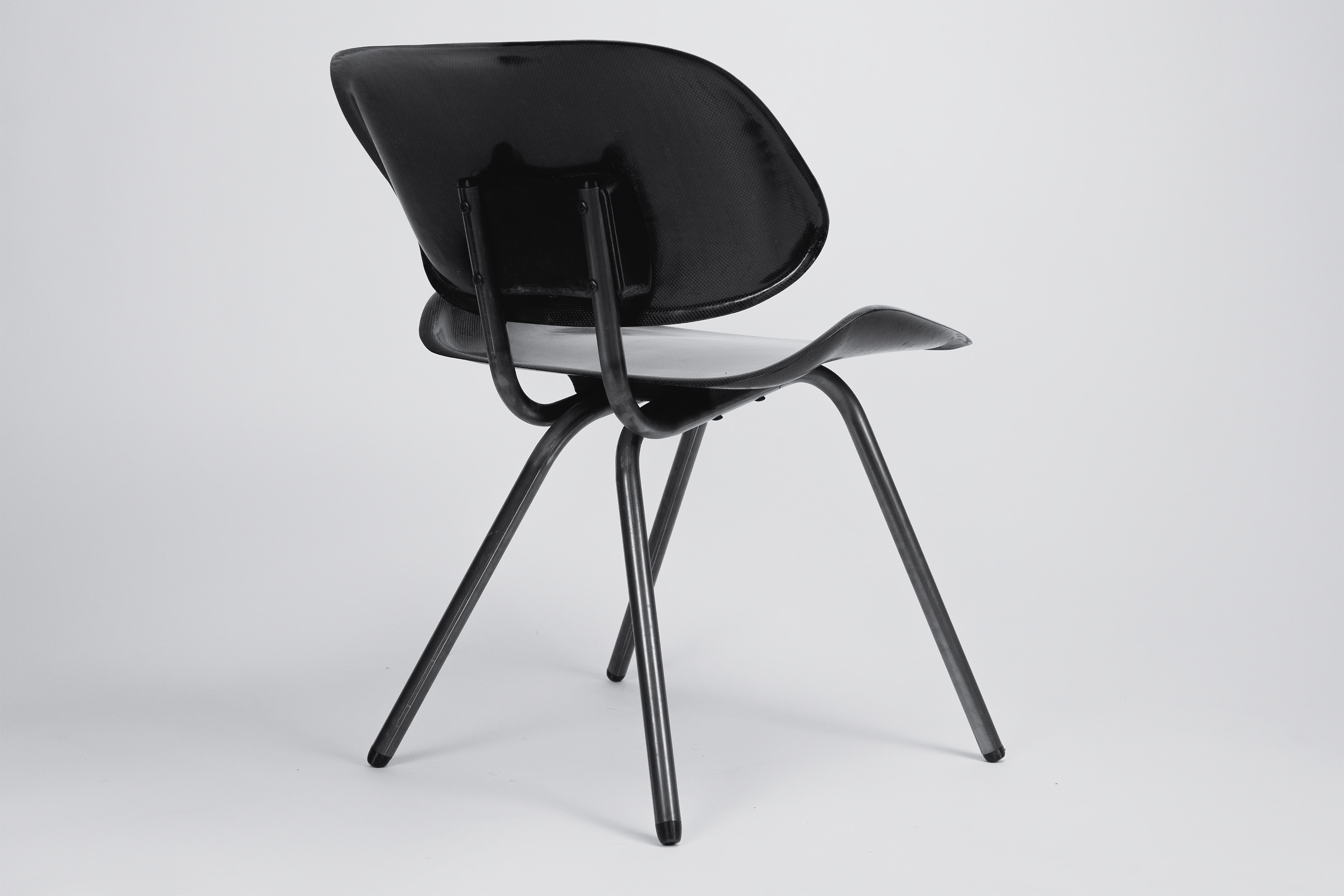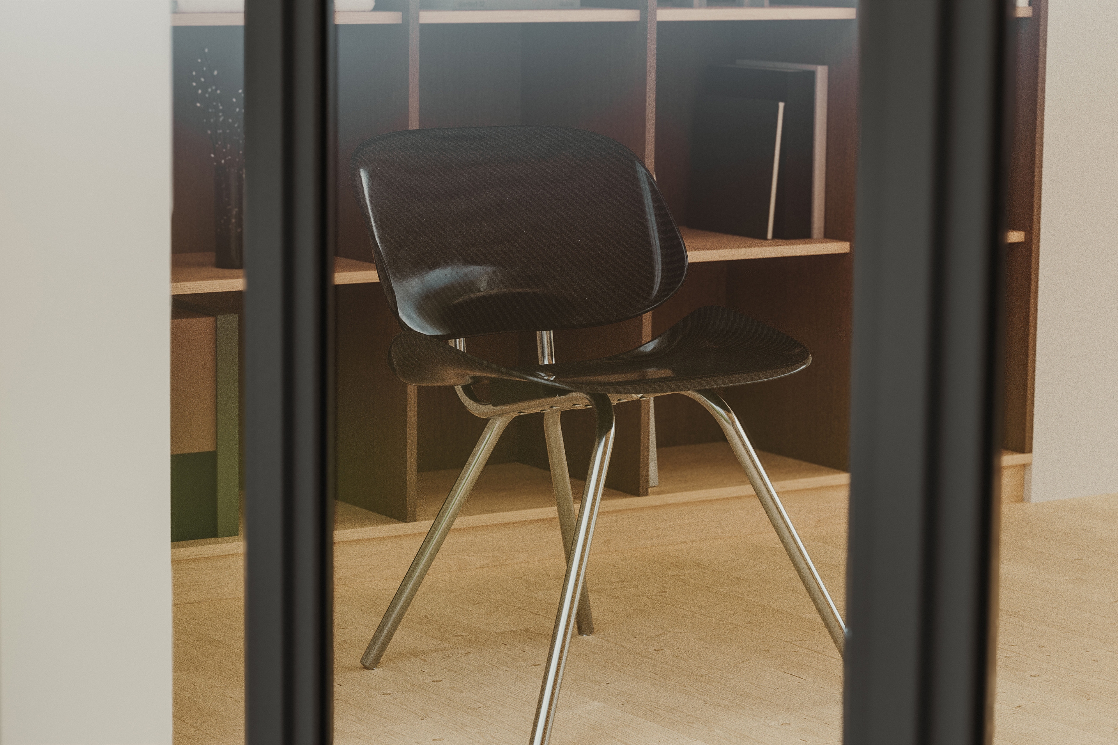 Intanso is a sleek and lightweight side chair designed to stand out with its unique material choice and form. The chair's striking silhouette is the result of a custom-molded carbon fiber seat and back, chosen for its high strength-to-weight ratio allowing for a slim profile with the necessary strength. This material was selected not only for its physical properties but also for its aerodynamic visuals.