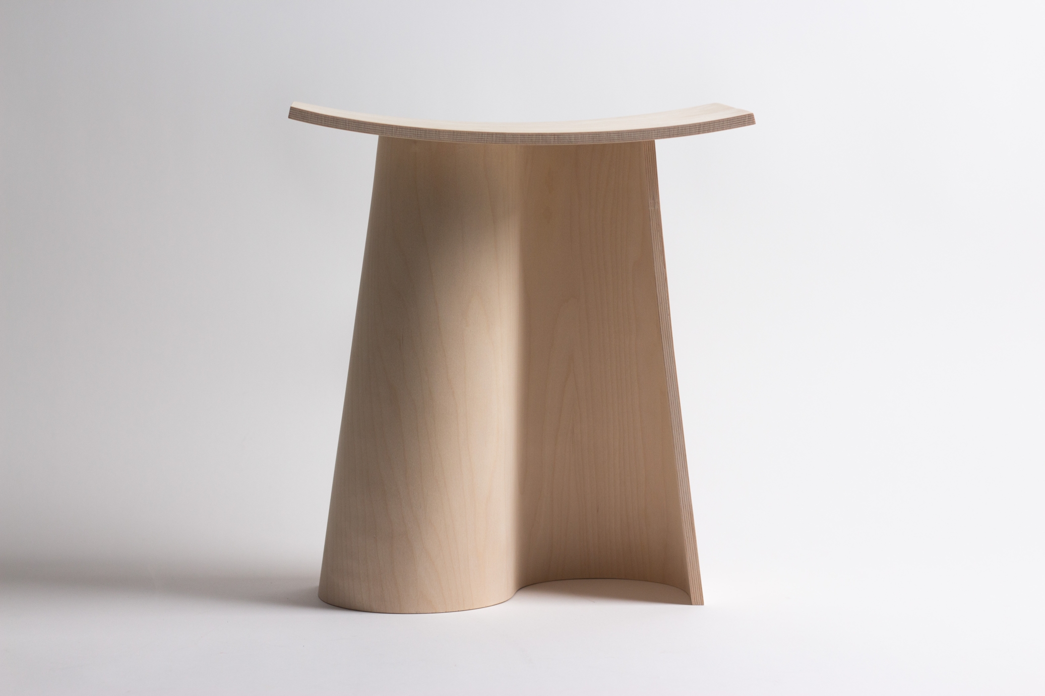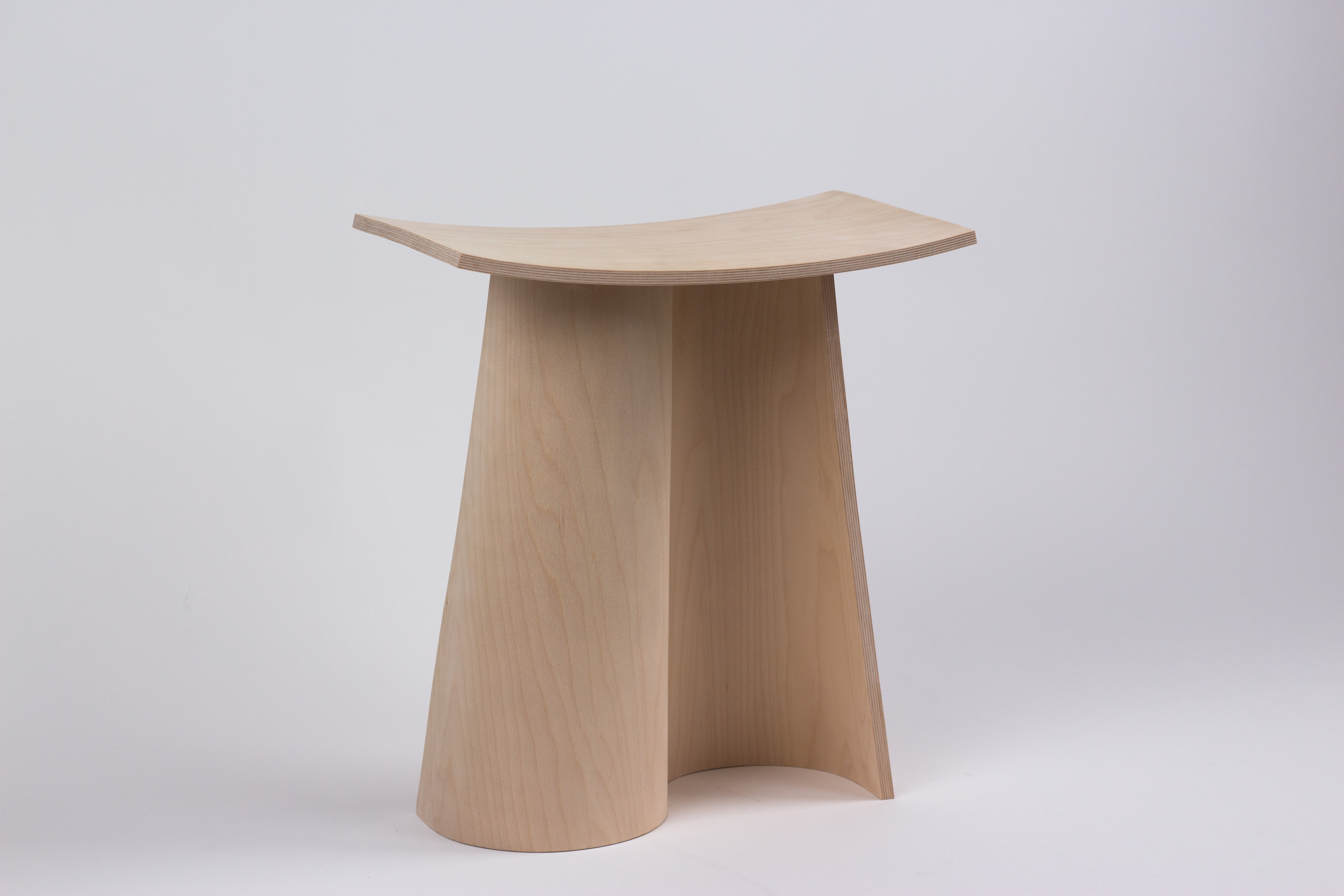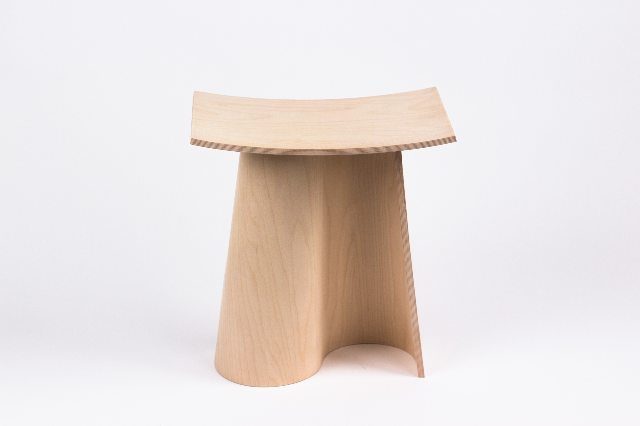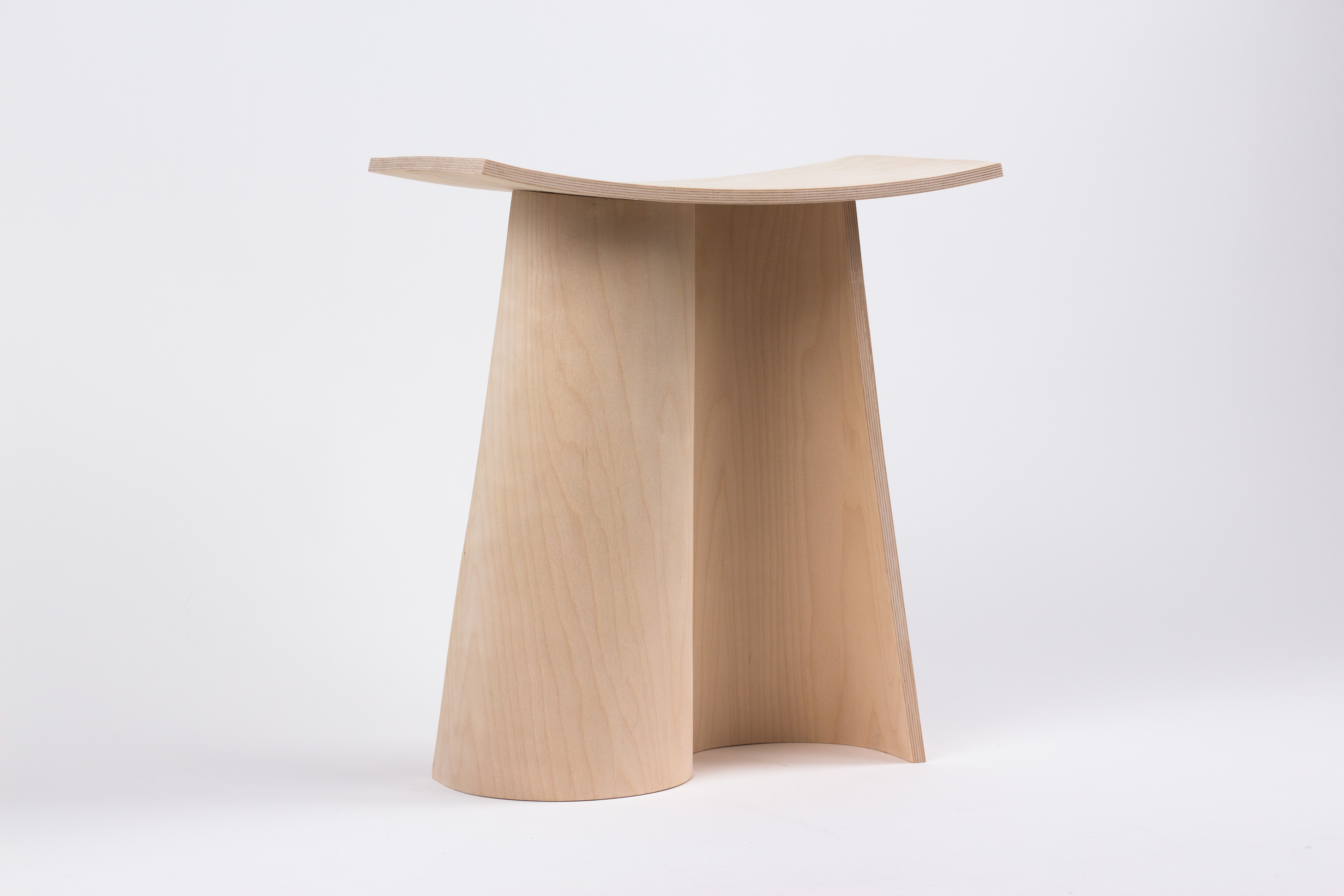 The stool consists of two main components: a seat and a base. The seat is a single curved and concave rectangular volume. It appears to be floating above the base and gives the impression of lightness. The base is a single curved flat volume, duplicated and rotated symmetrically around the center axis. The silhouette is vertically converging and the volume creates interesting negative space in the shape of half cones, disrupted by the seat.