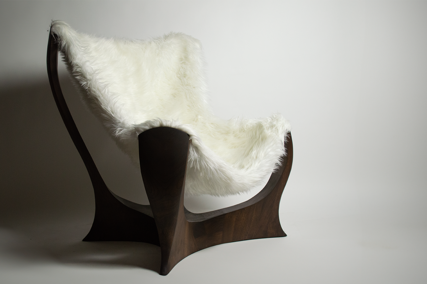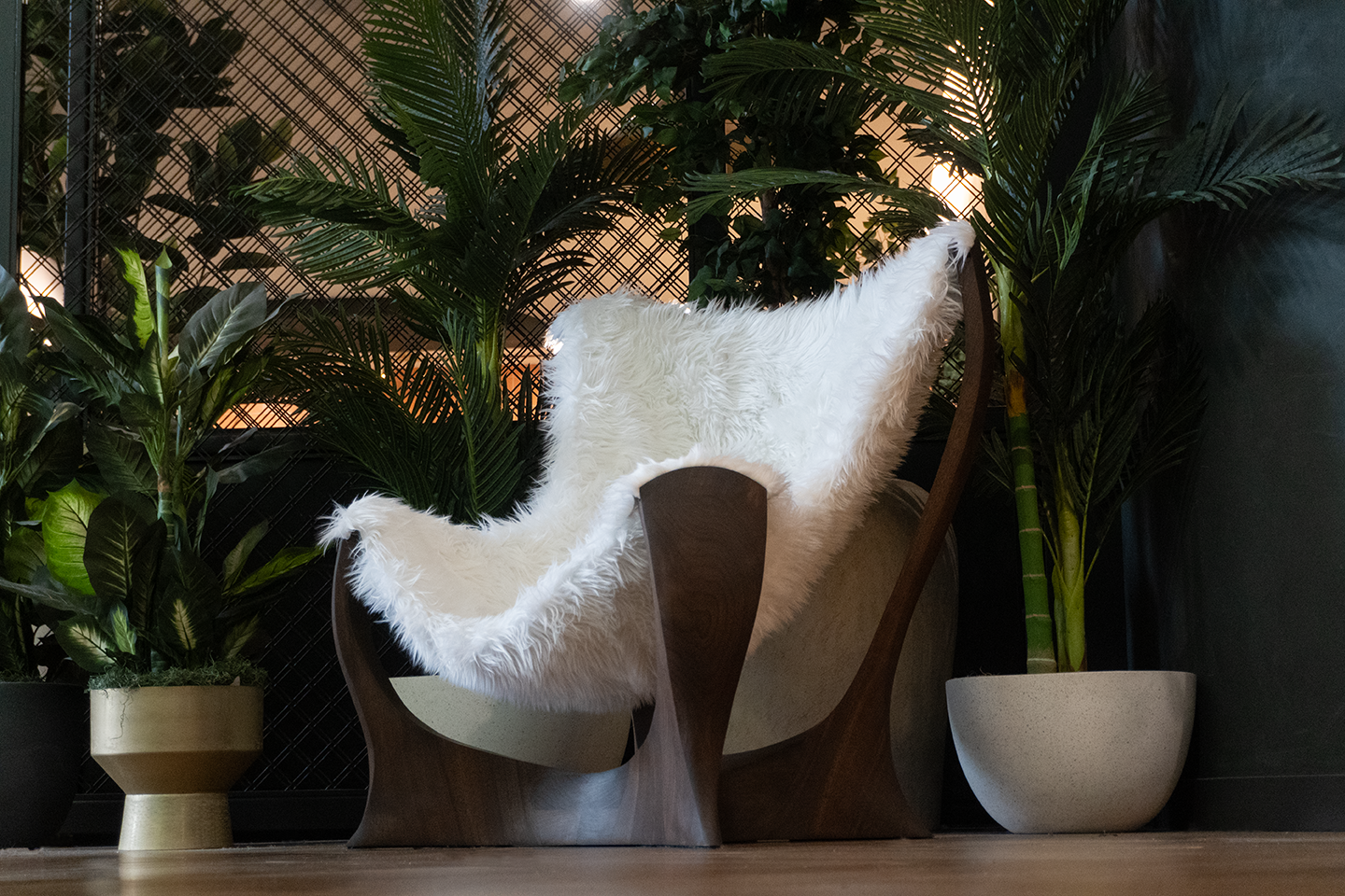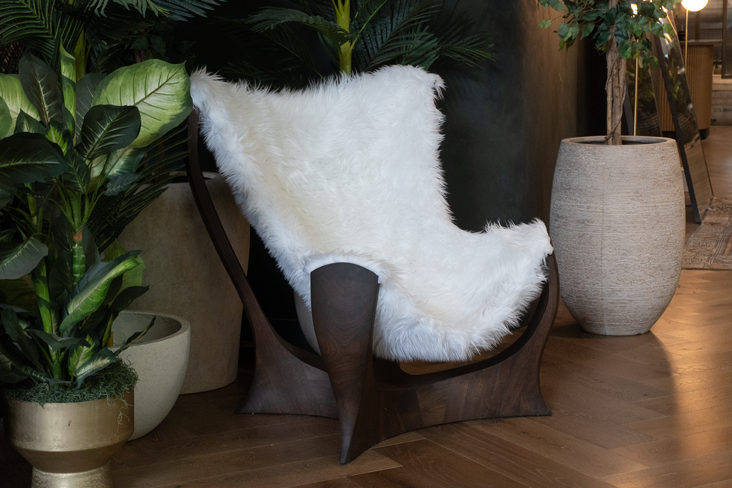 This statement lounge chair draws the eyes in with continuous curves that sweep seamlessly throughout the form, creating a visually stable yet flowing structure. The suspended seat is made from faux fur, its form displaying how it would hold one’s body perfectly, inviting oneself to experience the comfort of its embrace.