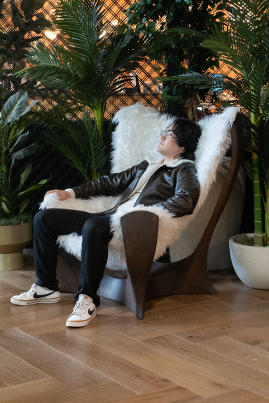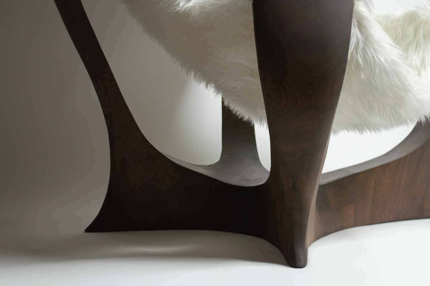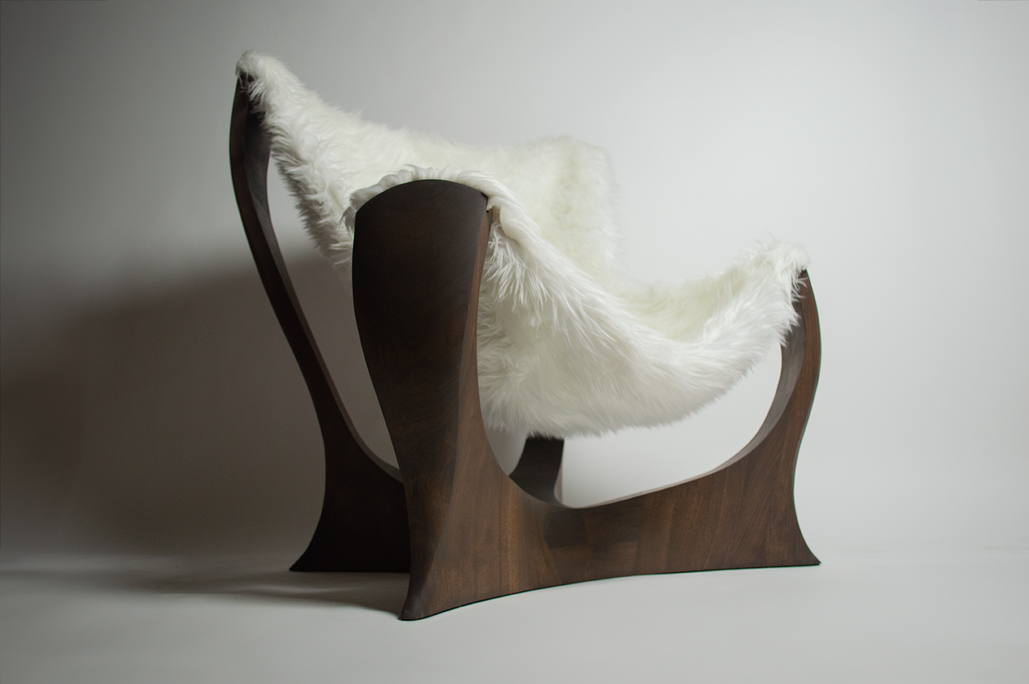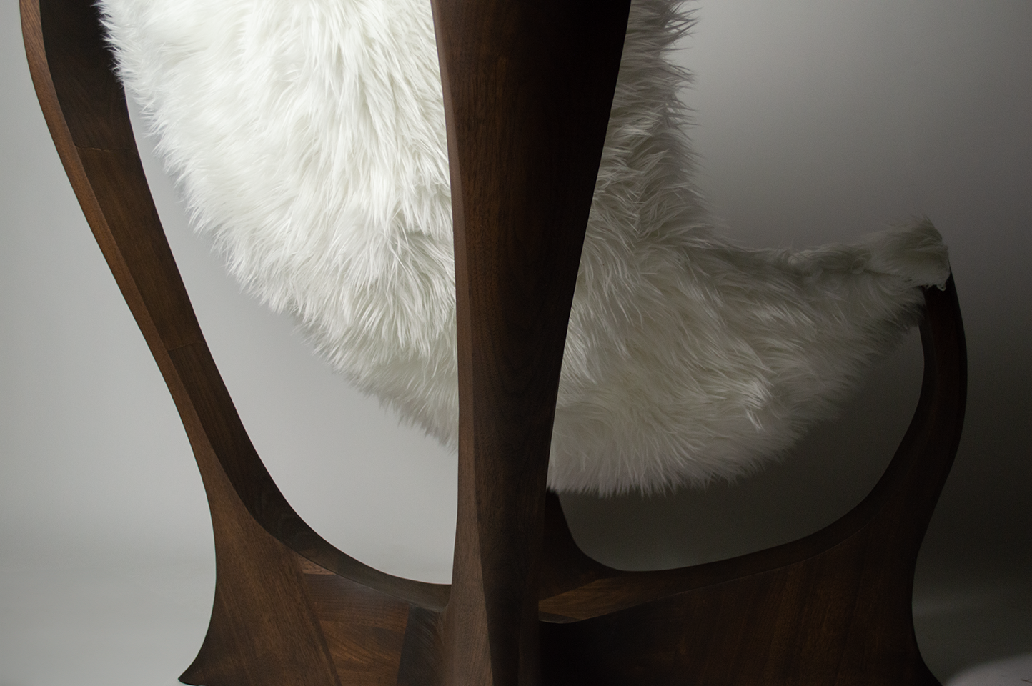 This statement lounge chair draws the eyes in with continuous curves that sweep seamlessly throughout the form, creating a visually stable yet flowing structure. The suspended seat is made from faux fur, its form displaying how it would hold one’s body perfectly, inviting oneself to experience the comfort of its embrace.