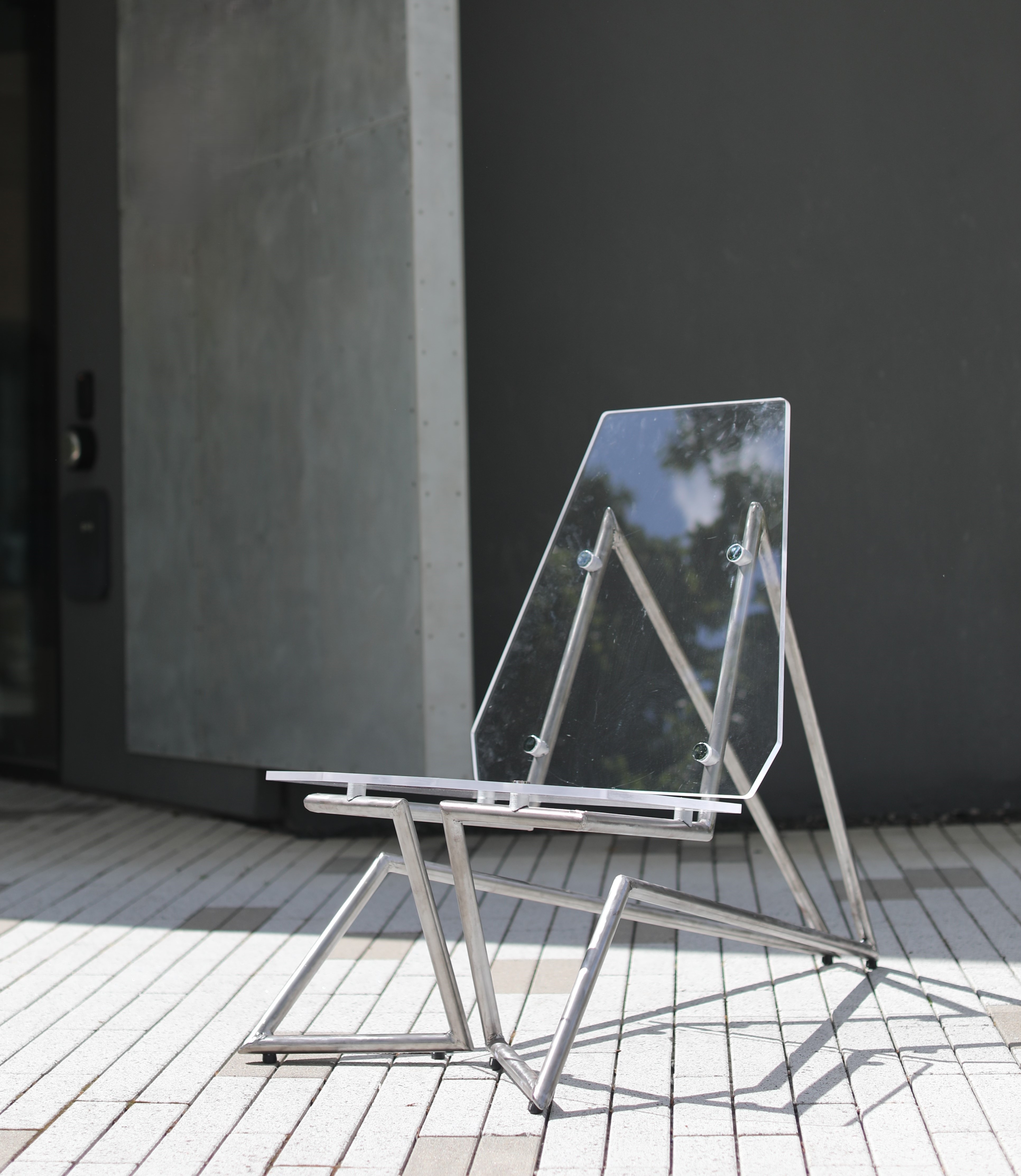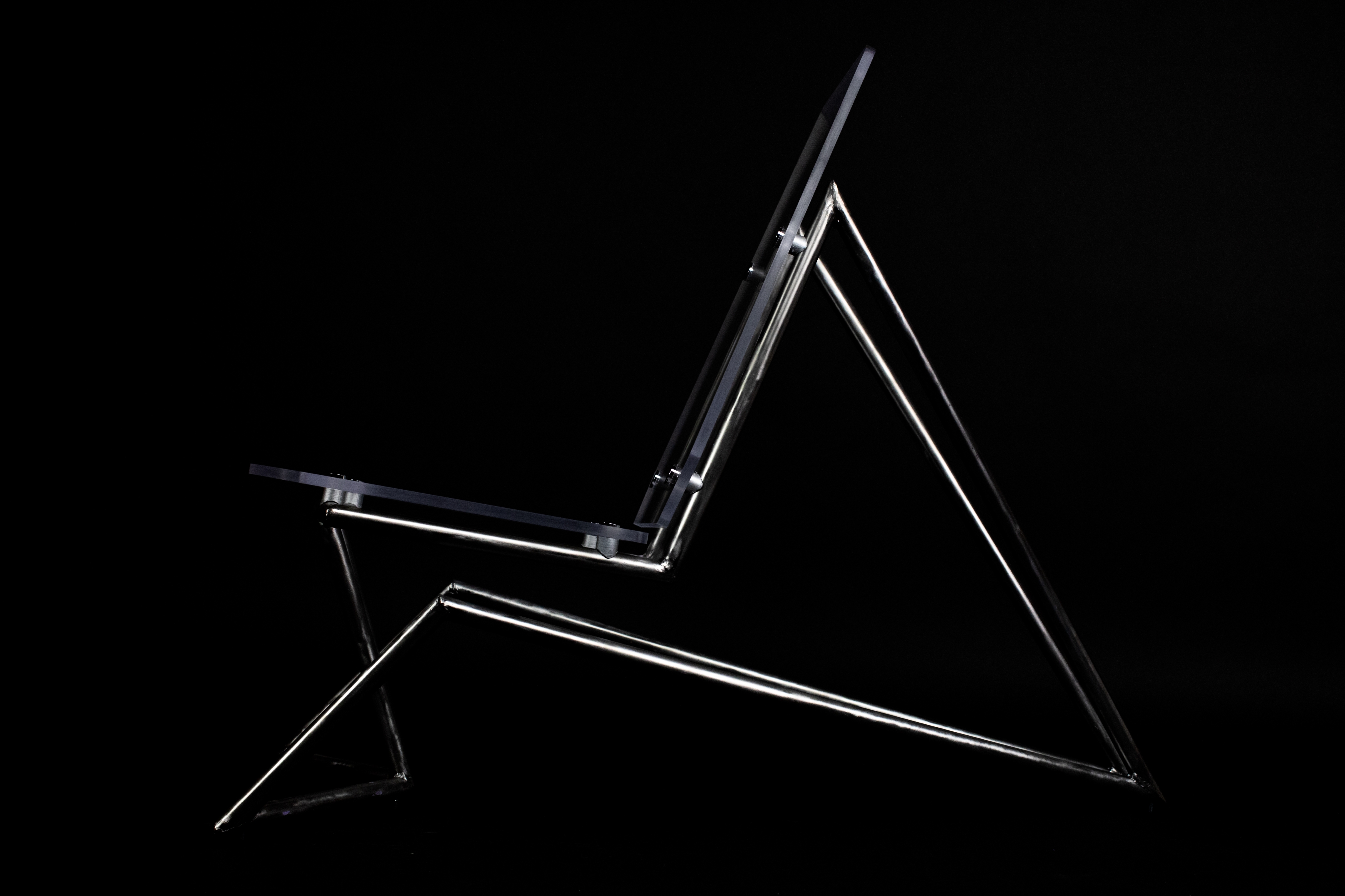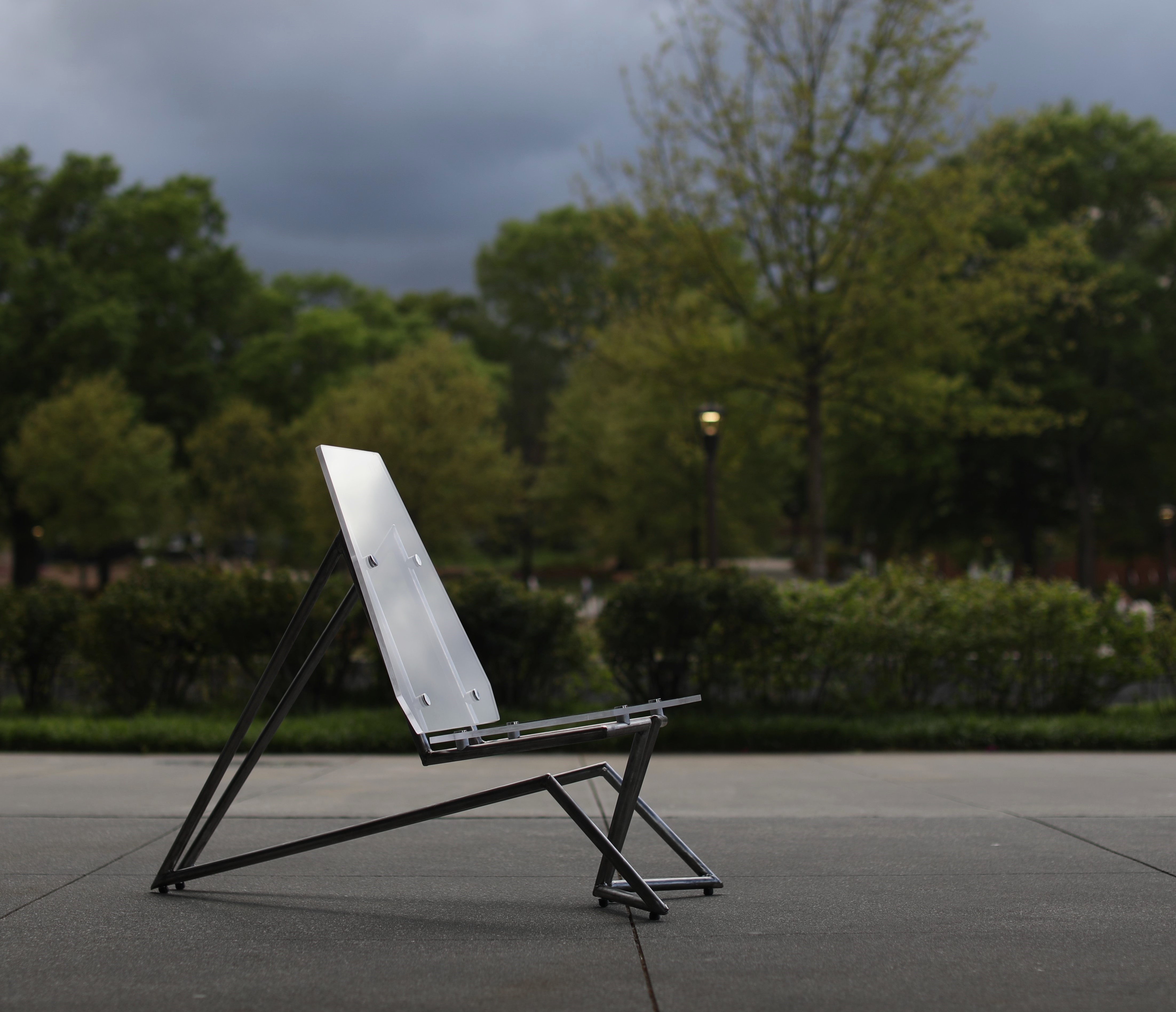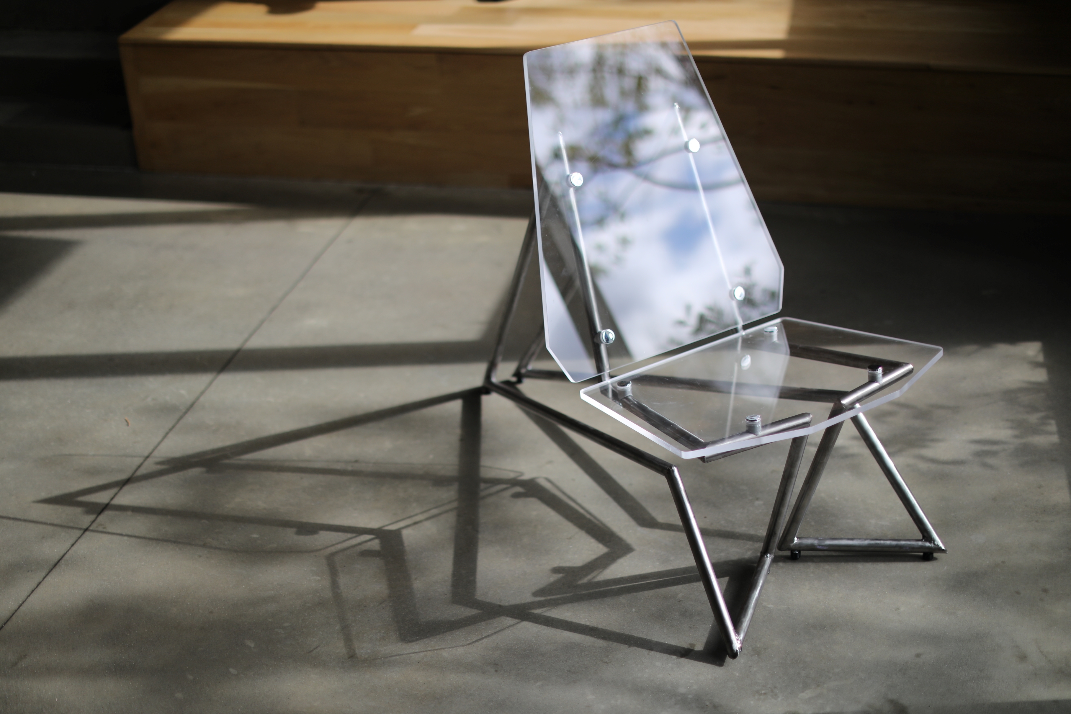 Vue is a lounge chair fabricated from a ½ inch acrylic sheet and steel tubing in a dramatic silhouette designed to be the focal point of a modern living room. The sculptural floating quality created by the suspension of the seat through non-traditional leg locations is permitted by the strength of the steel legs. The connections from acrylic to steel allows the clear seat to float above the 2 symmetrical legs. It features a comfortable high back rest and slightly reclined seat angle designed from ergonomic testing to support a range of body types. Visually, the chair looks as though it was in perspective from any view point (point de vue).