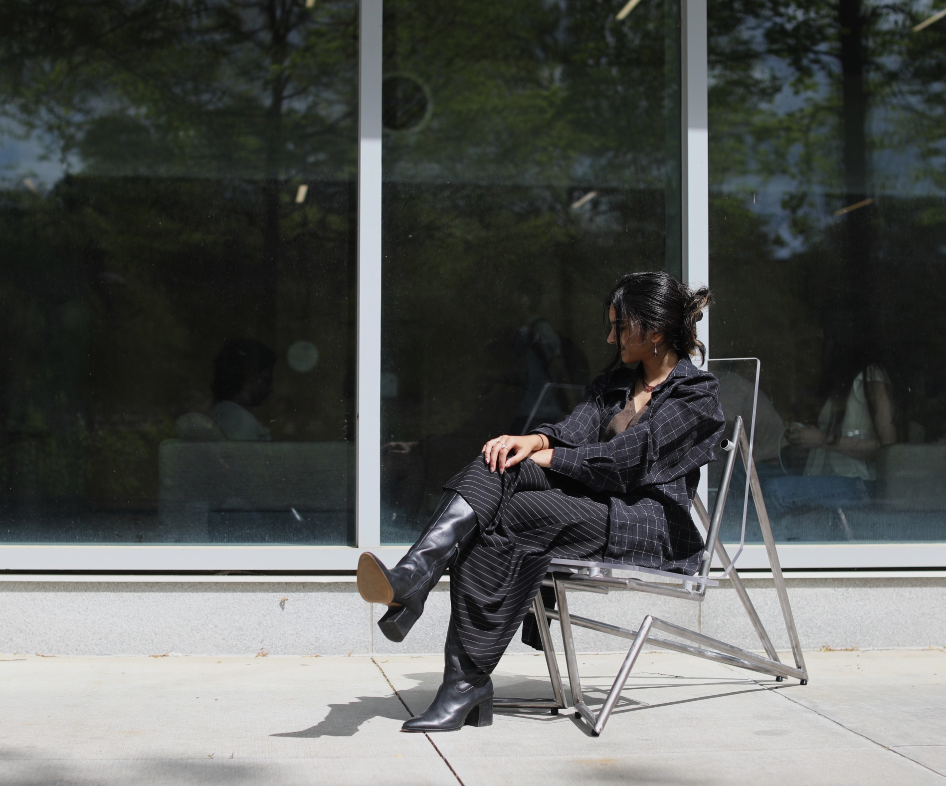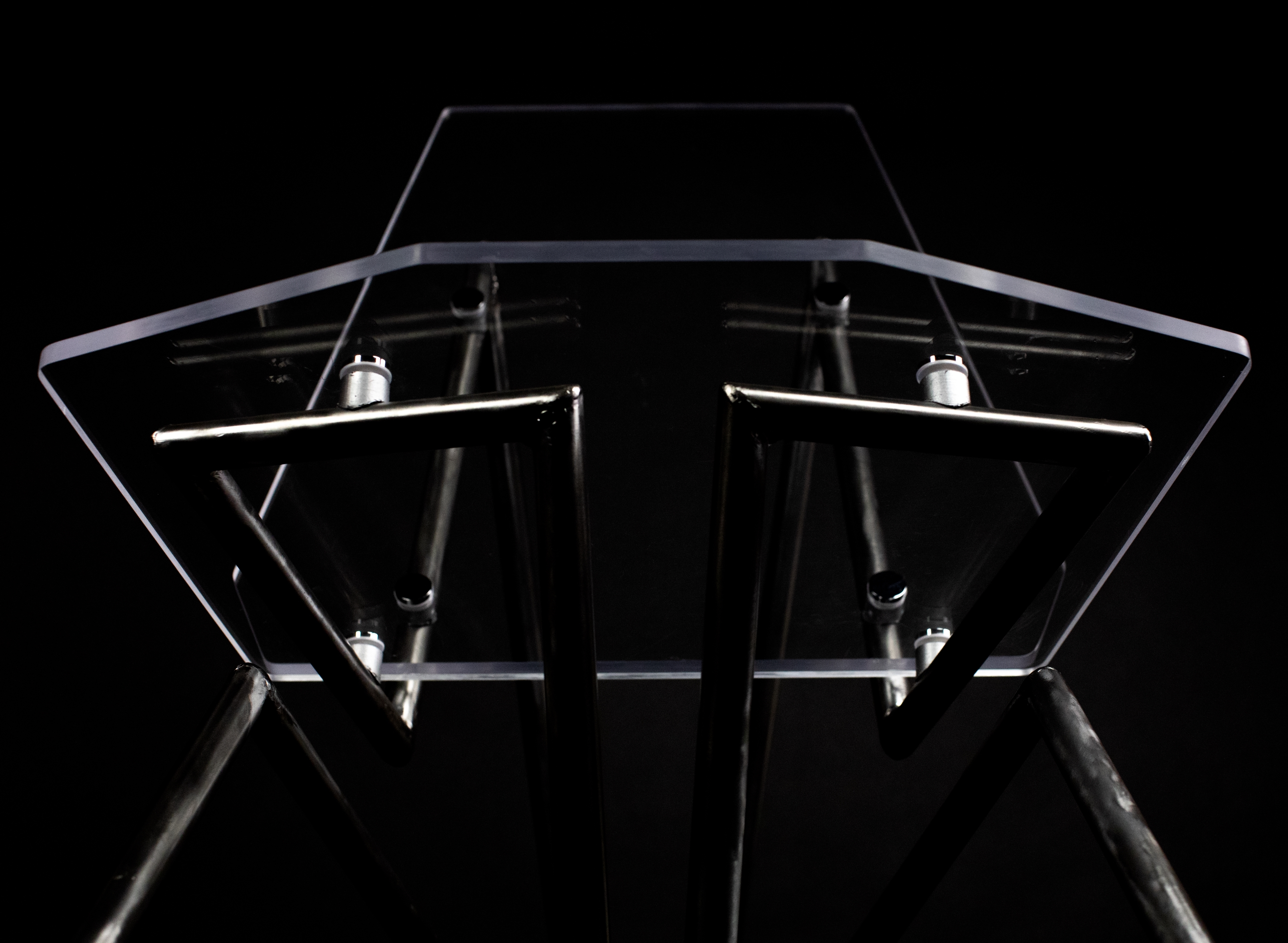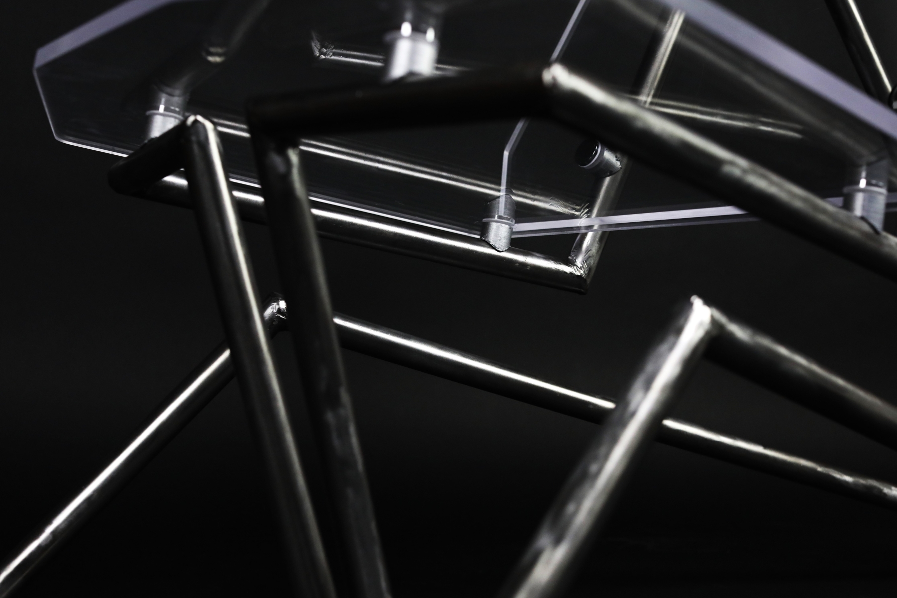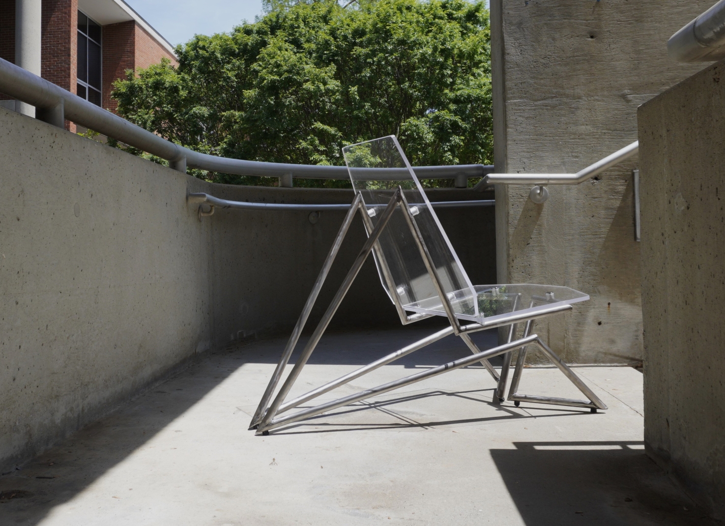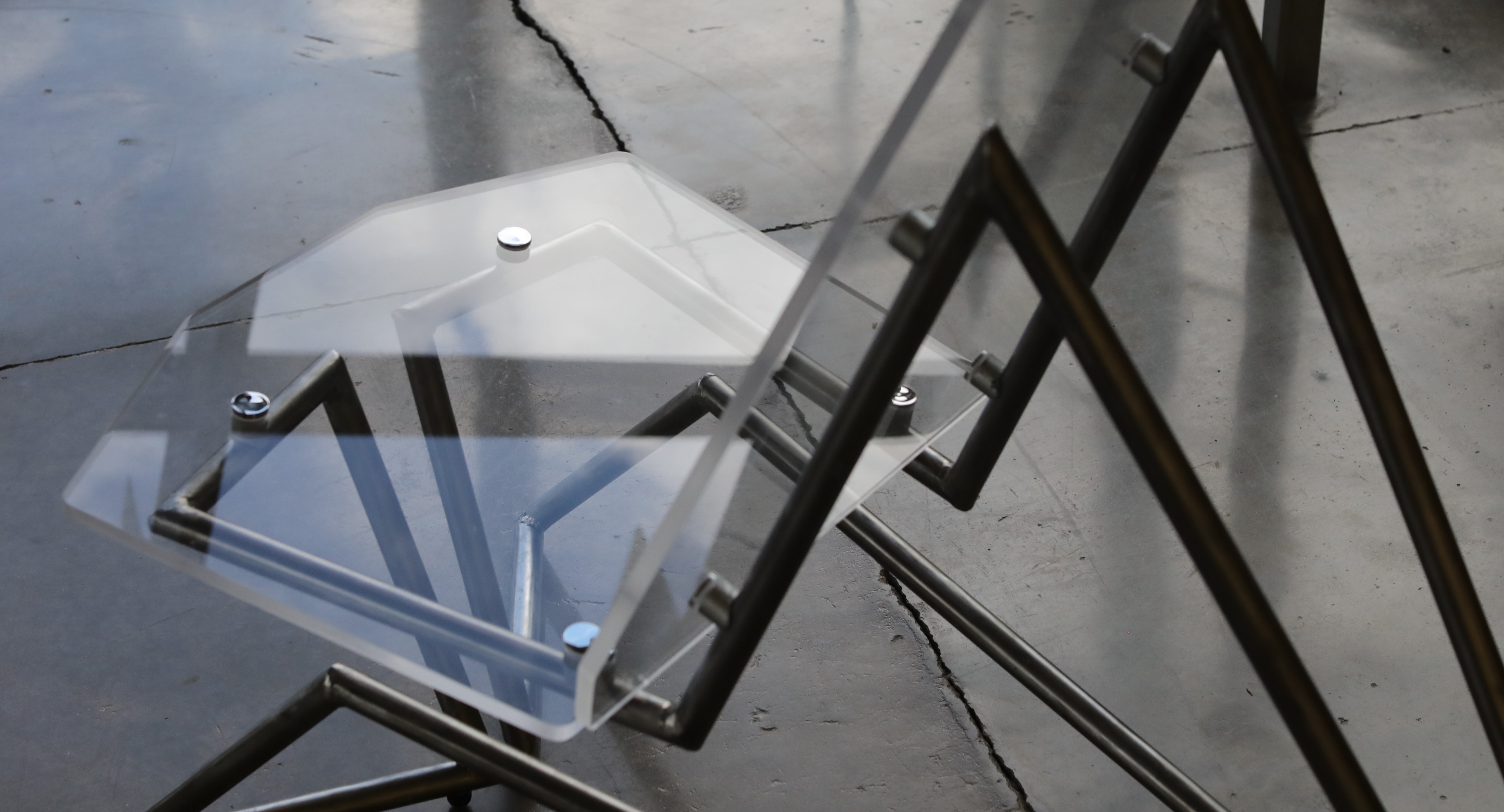 Vue is a lounge chair fabricated from a ½ inch acrylic sheet and steel tubing in a dramatic silhouette designed to be the focal point of a modern living room. The sculptural floating quality created by the suspension of the seat through non-traditional leg locations is permitted by the strength of the steel legs. The connections from acrylic to steel allows the clear seat to float above the 2 symmetrical legs. It features a comfortable high back rest and slightly reclined seat angle designed from ergonomic testing to support a range of body types. Visually, the chair looks as though it was in perspective from any view point (point de vue).