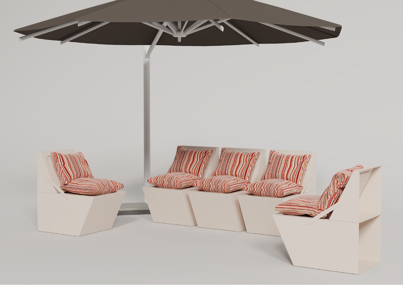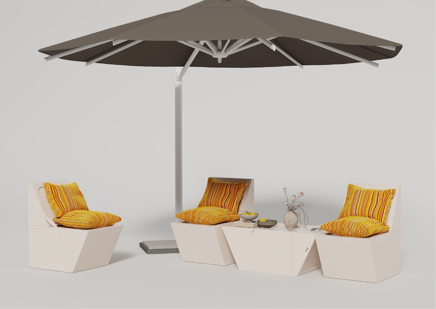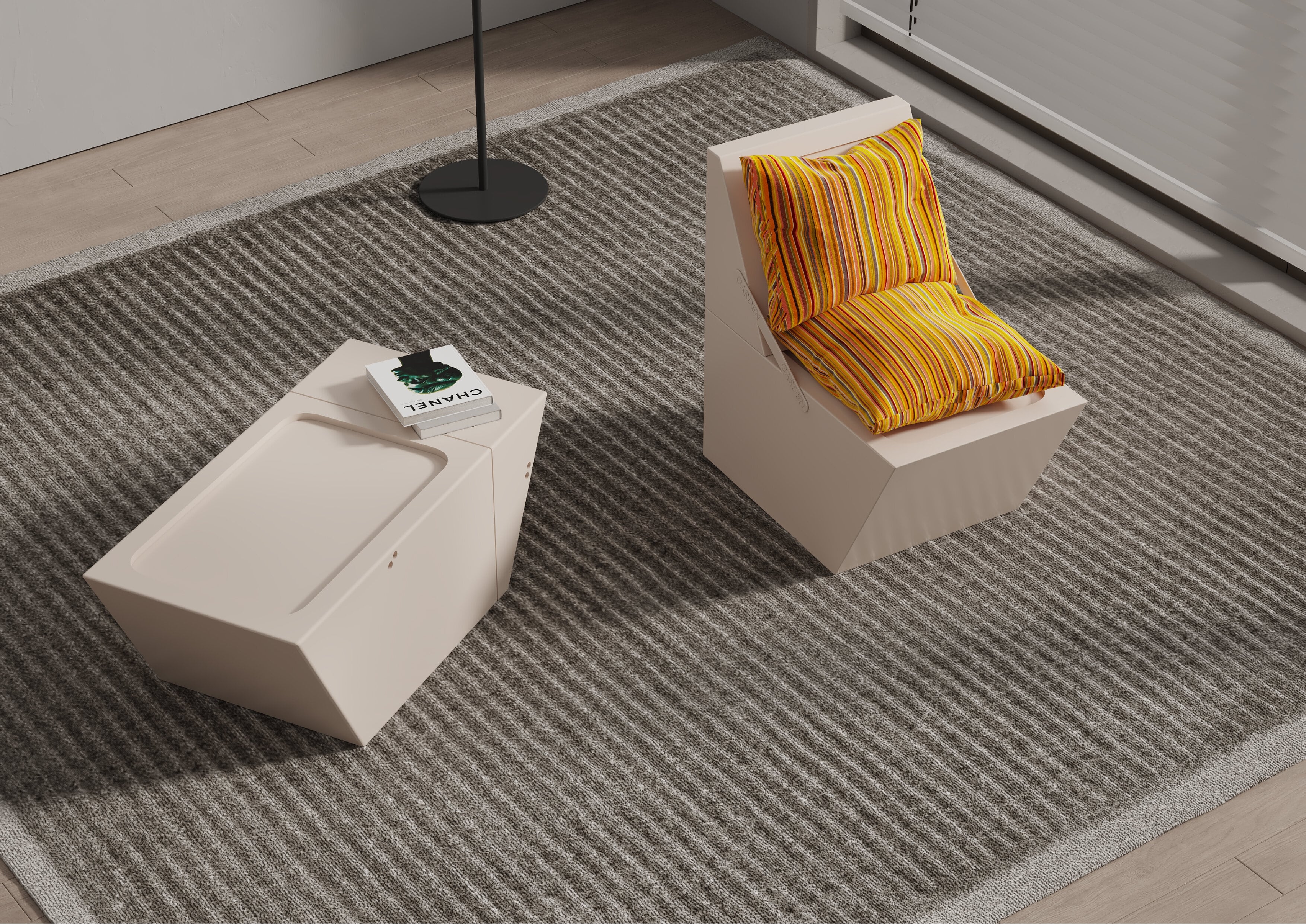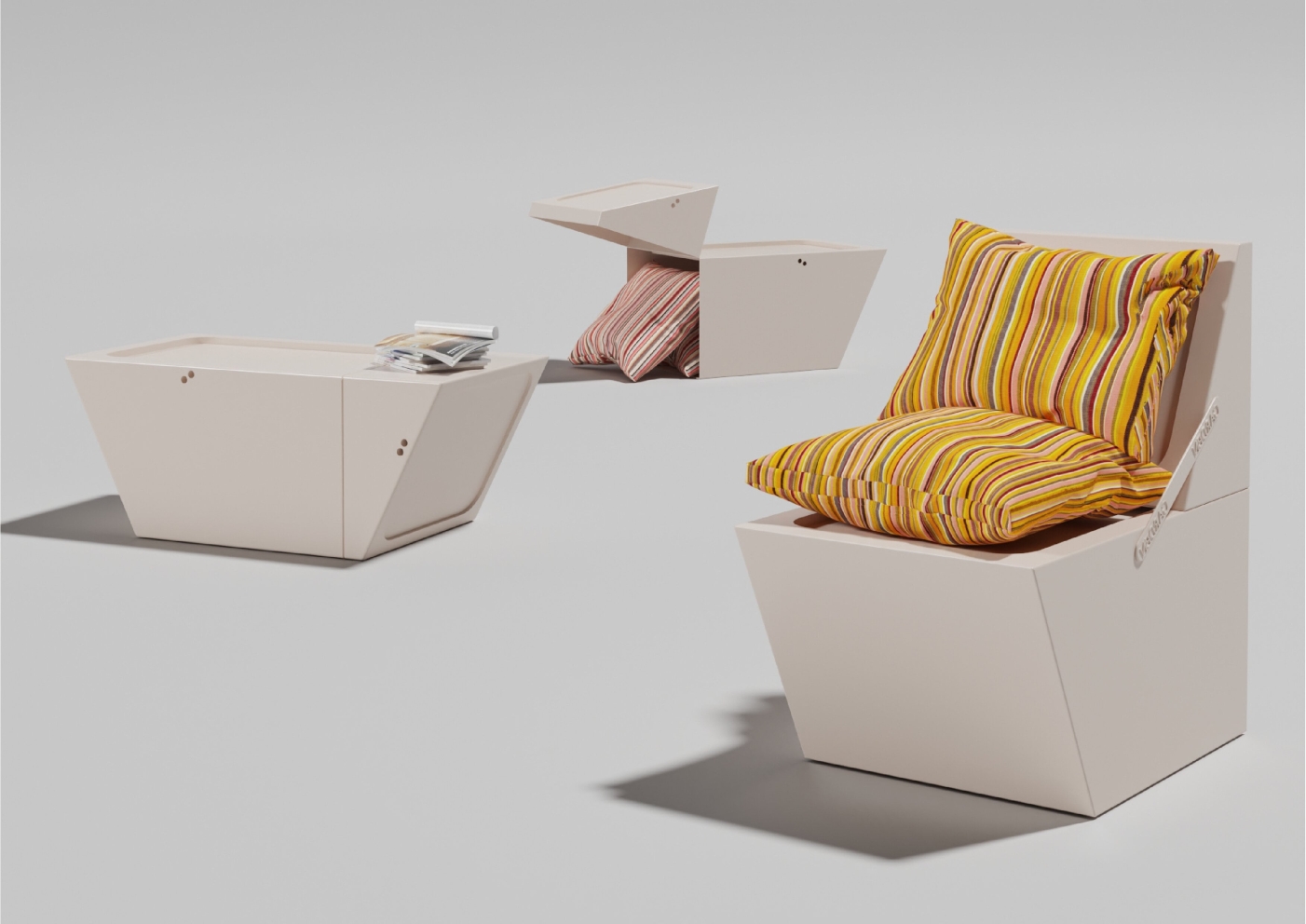The chairs embrace a thoughtful design in which both functionality and aesthetics are present. The chairs fold into itself by pulling the seat and backrest towards each other, resulting in a trapezoid-shaped case. When folded in its trapezoid-shaped case, the chair can be used as a table while the pillows are stored within the case. At the bottom, there is a handle for easy carrying making this portable chair ideal for the outdoor activities like camping or visiting the beach.