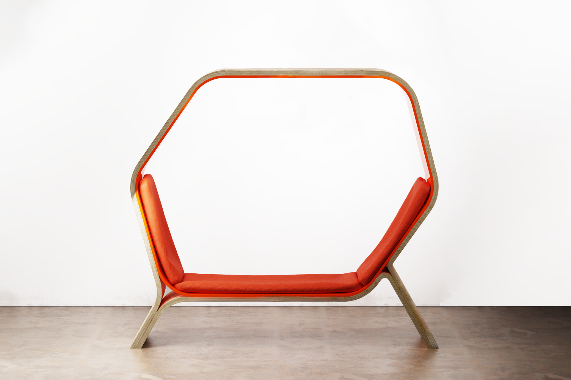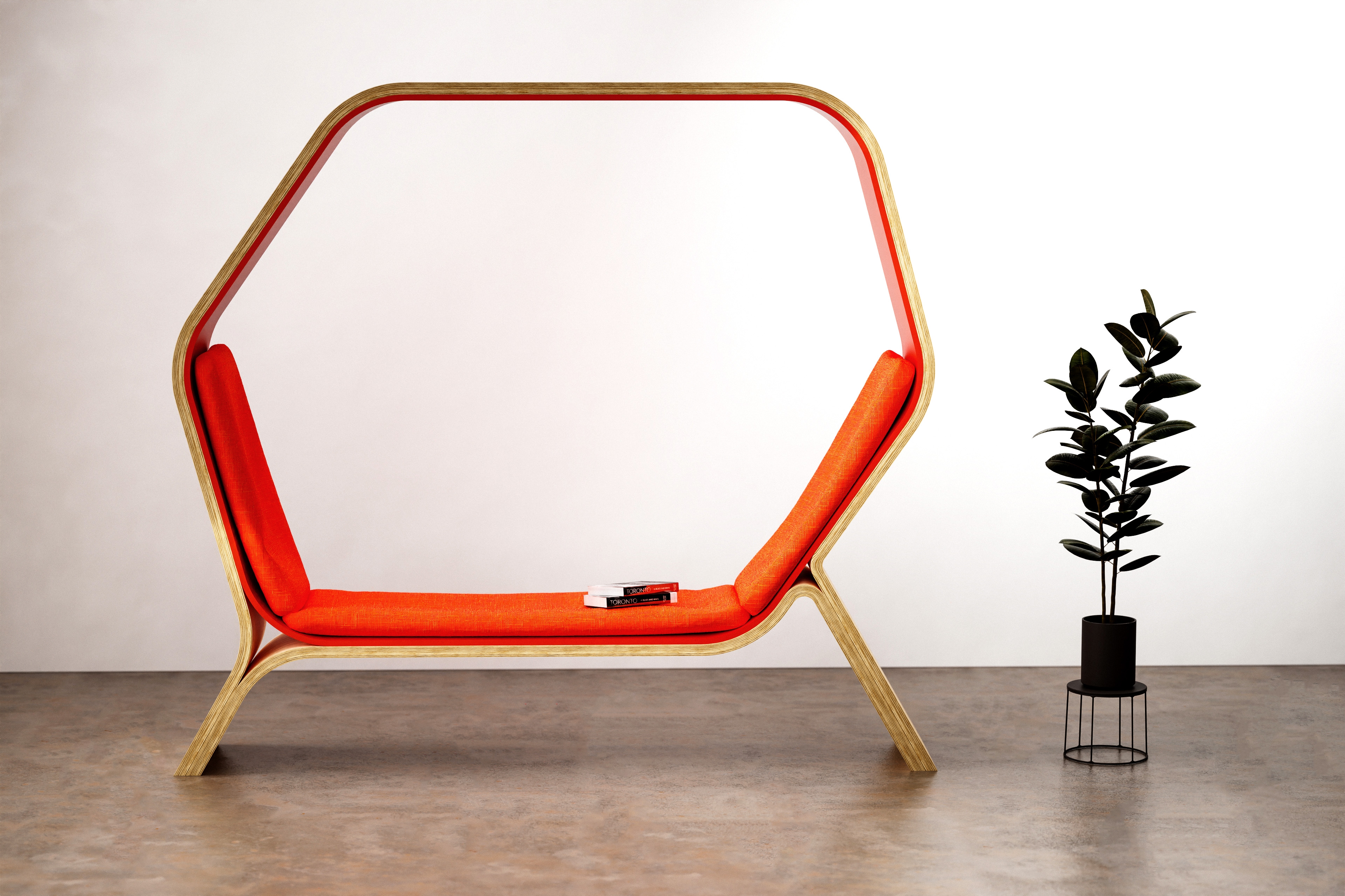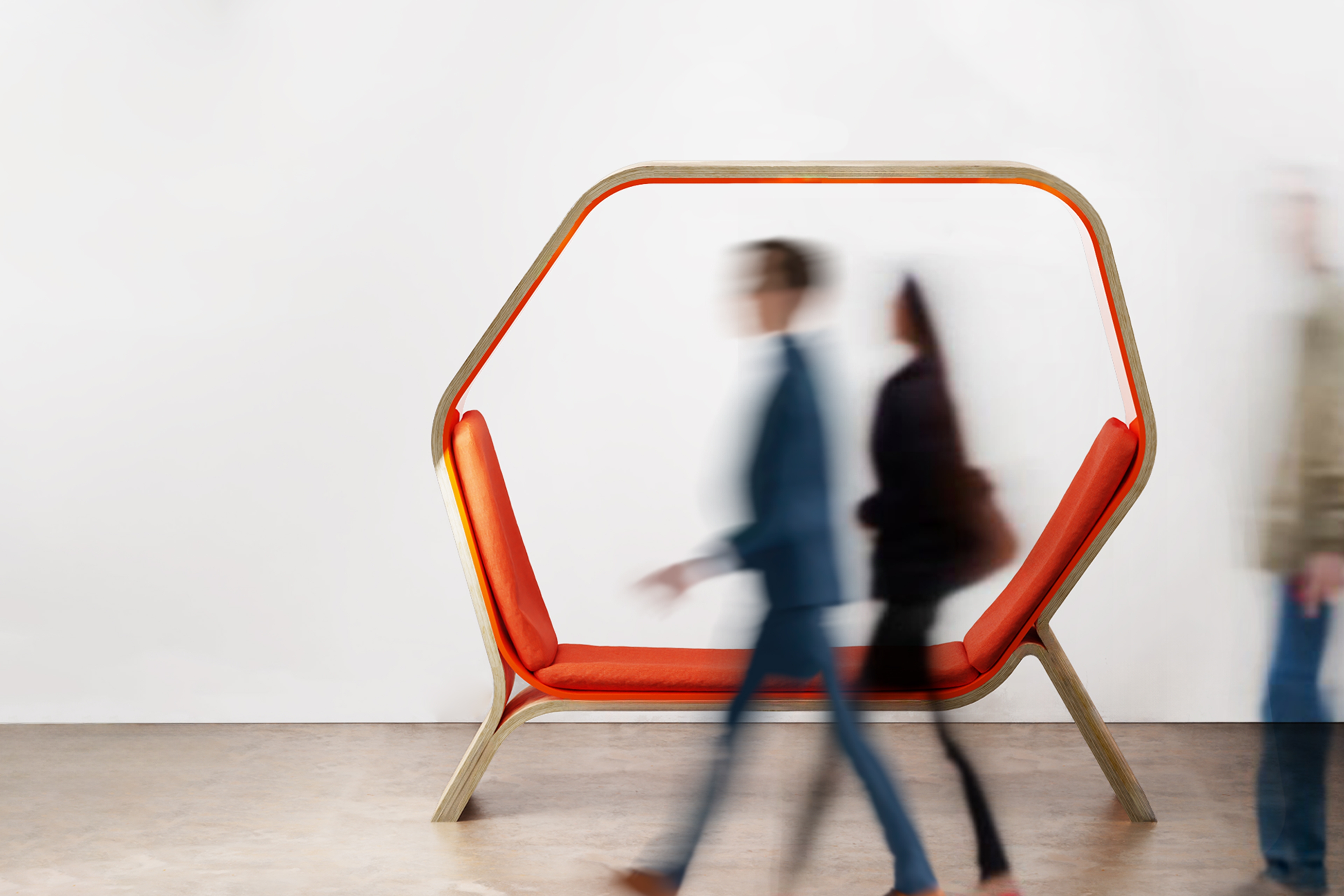 POD is a public seating solution designed to provide users with the privacy and versatility they need in public spaces. Its shape provides angles of 105 degrees and 130 degrees, ensuring comfort and ease in both sitting and lounging. Constructed from veneered ¾" Baltic birch plywood and bent acrylic, POD can withstand heavy usage, making it ideal for busy public areas. Whether it is a cozy nook for solitary contemplation or a communal hub for lively conversations, POD adapts seamlessly. Minimalist elegance defines its style, well-suiting it for libraries, universities, and offices. POD invites users into its embrace—a place to work, lounge, and let natural light penetrate this personal environment.