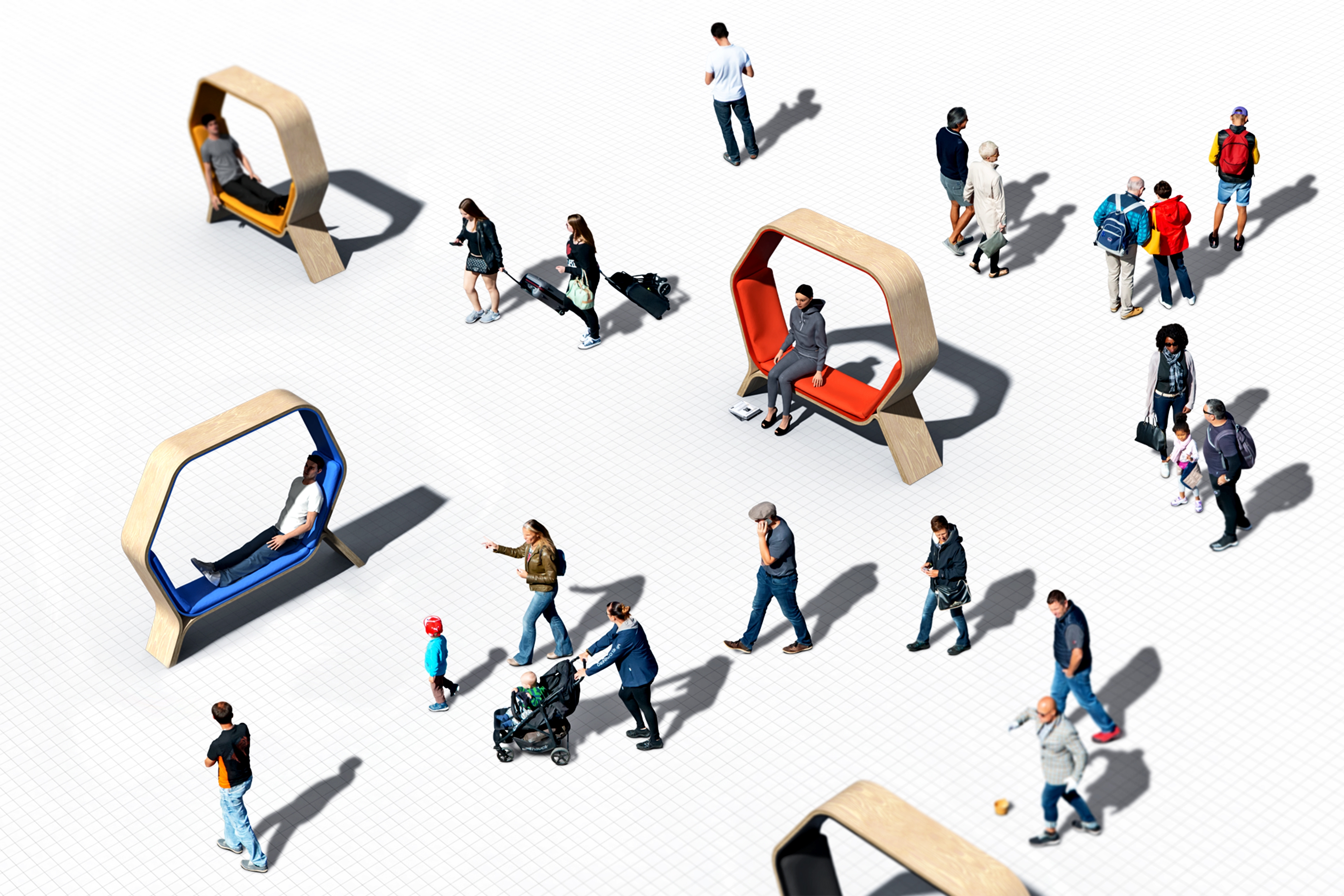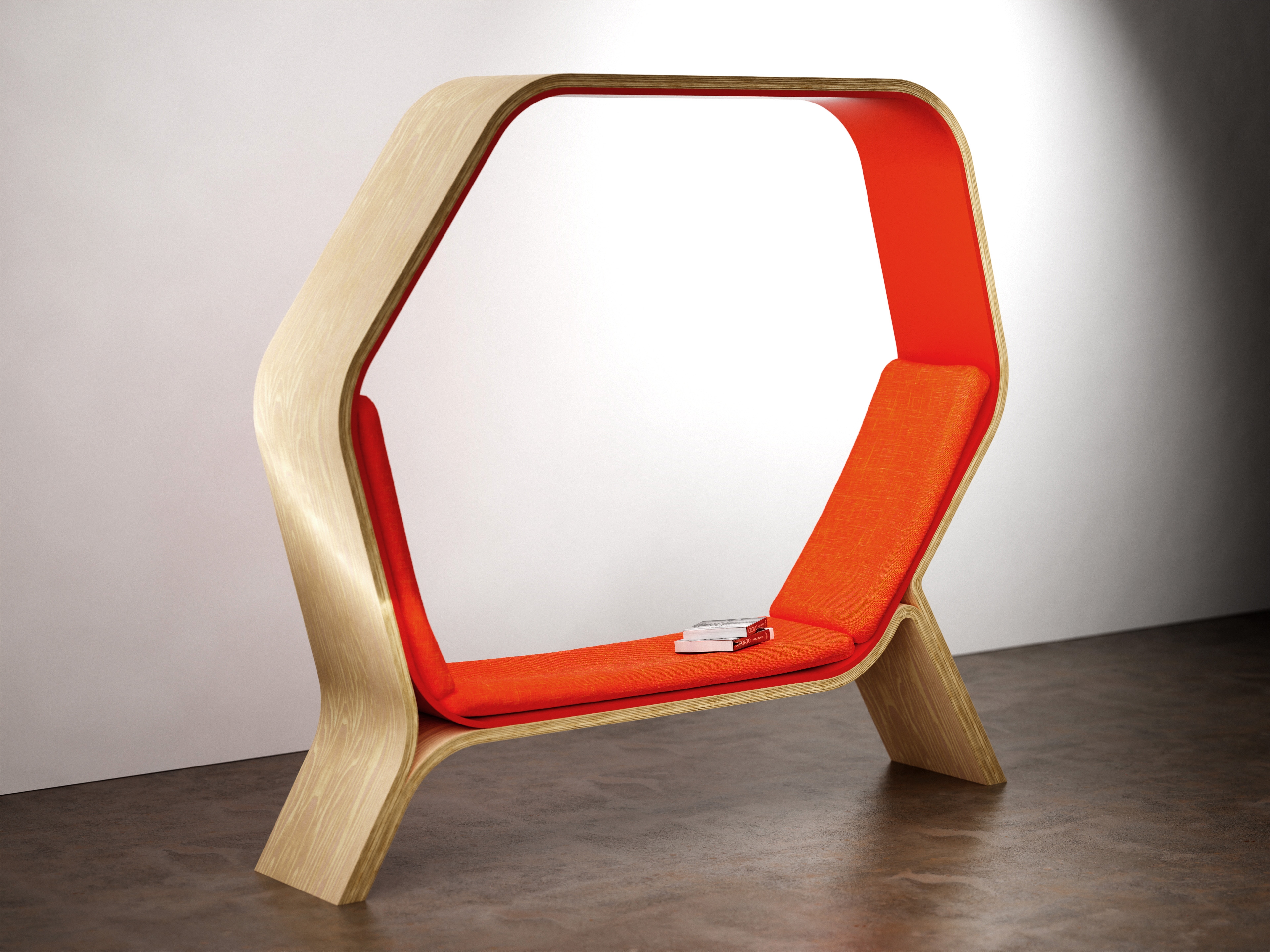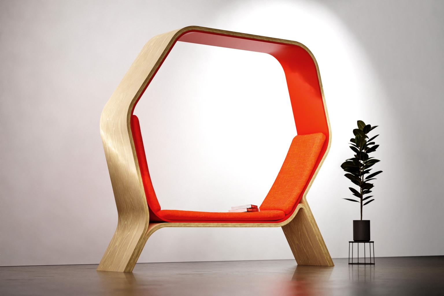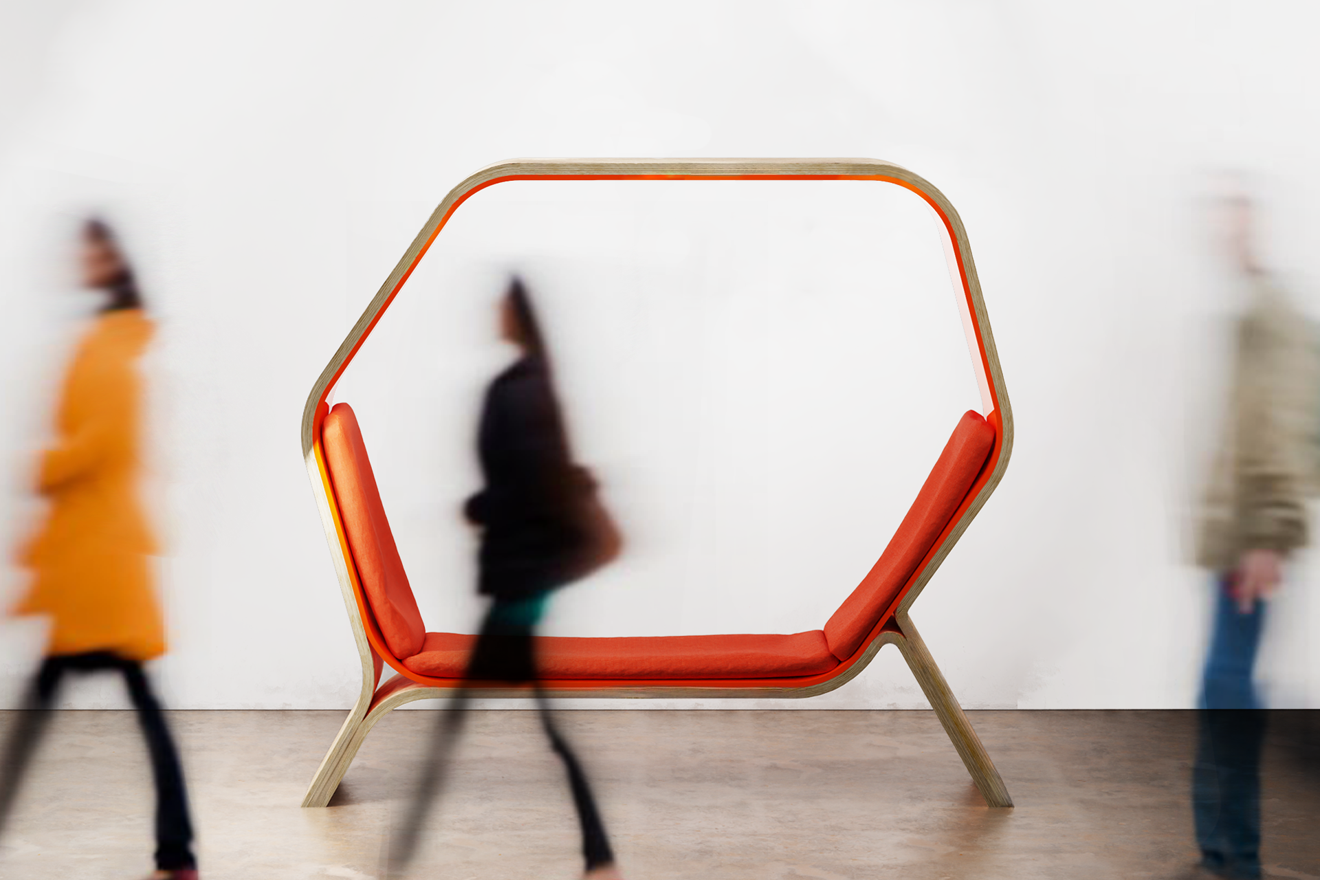 POD is a public seating solution designed to provide users with the privacy and versatility they need in public spaces. Its shape provides angles of 105 degrees and 130 degrees, ensuring comfort and ease in both sitting and lounging. Constructed from veneered ¾" Baltic birch plywood and bent acrylic, POD can withstand heavy usage, making it ideal for busy public areas. Whether it is a cozy nook for solitary contemplation or a communal hub for lively conversations, POD adapts seamlessly. Minimalist elegance defines its style, well-suiting it for libraries, universities, and offices. POD invites users into its embrace—a place to work, lounge, and let natural light penetrate this personal environment.